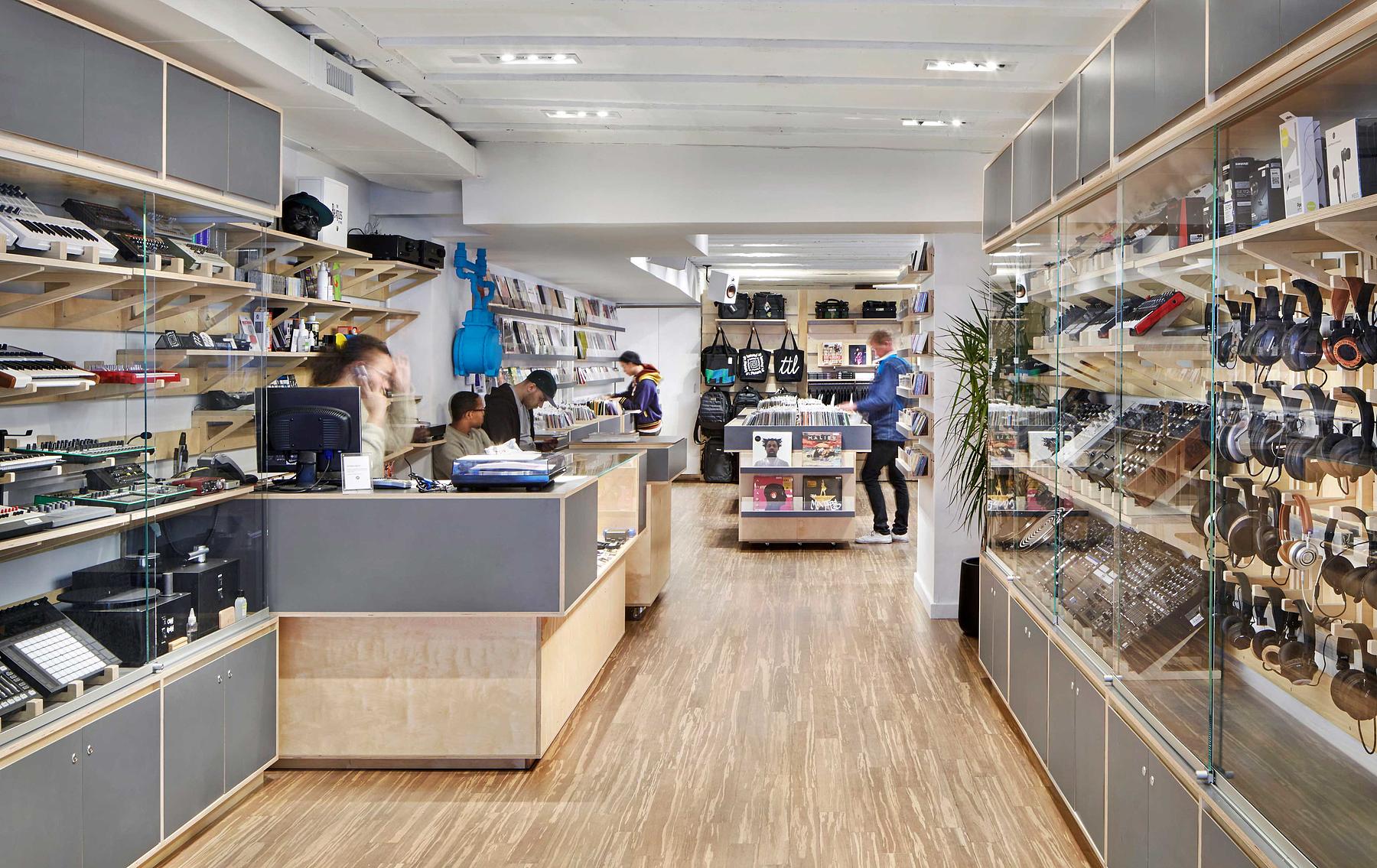 "Despite the recent resurgence in vinyl record sales, brick-and-mortar music retail remains a challenging business. New York City’s Turntable Lab—which sells vinyl, high-end audiophile equipment, and merchandise, catering to professional DJs and casual listeners alike—had successfully graduated from its small starting location near the Cooper Union to a larger, 1,200-square-foot space nearby. But Turntable’s owners knew their store needed to be nimble to survive. “Products always change…how you display things, where you might need to move things around. Maximum flexibility was what we were shooting for,” said Turntable Lab partner David Azzoni. The new store required that adaptability, but the owners didn’t want to lose the gritty basement feel of the old location.