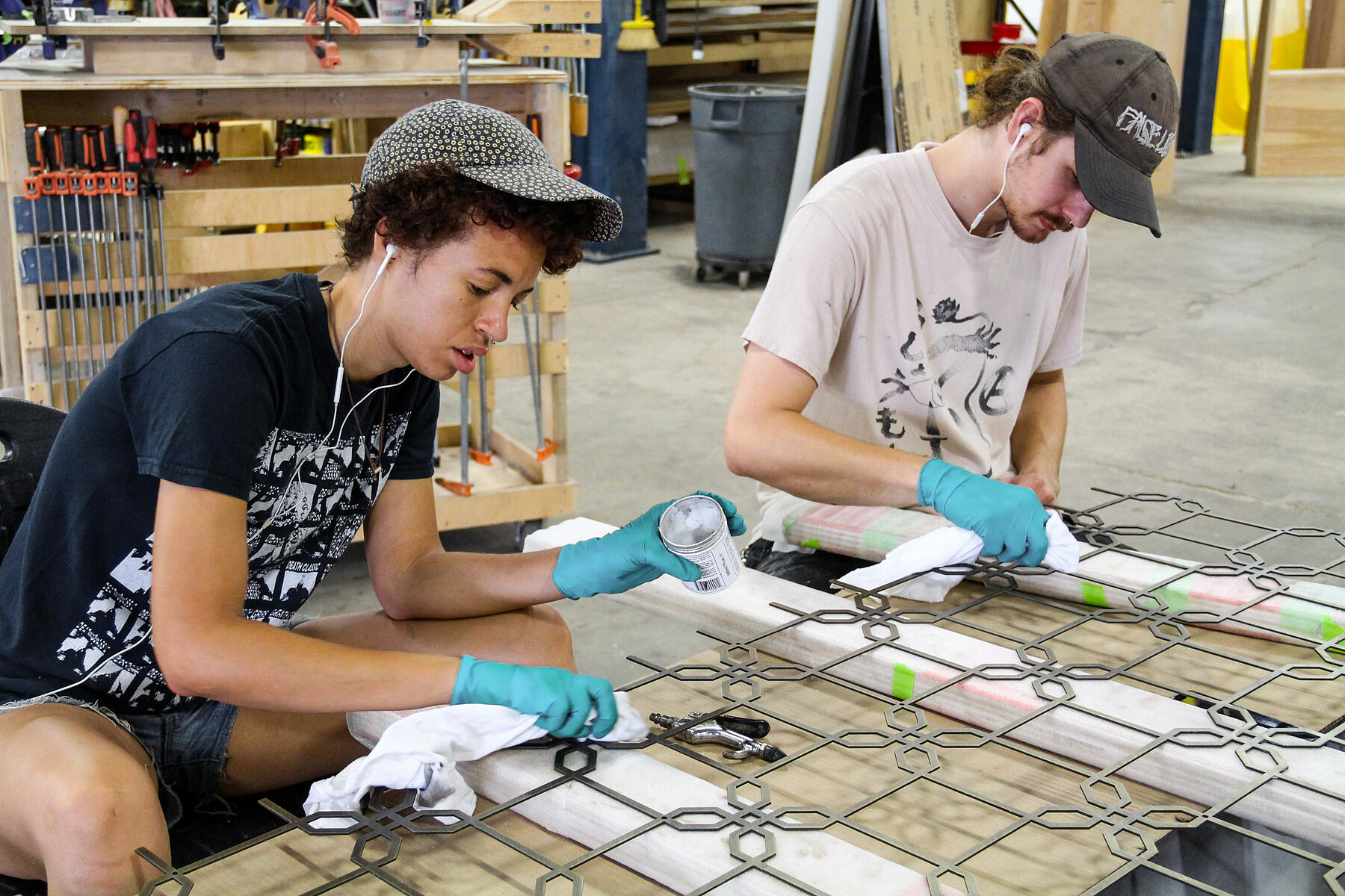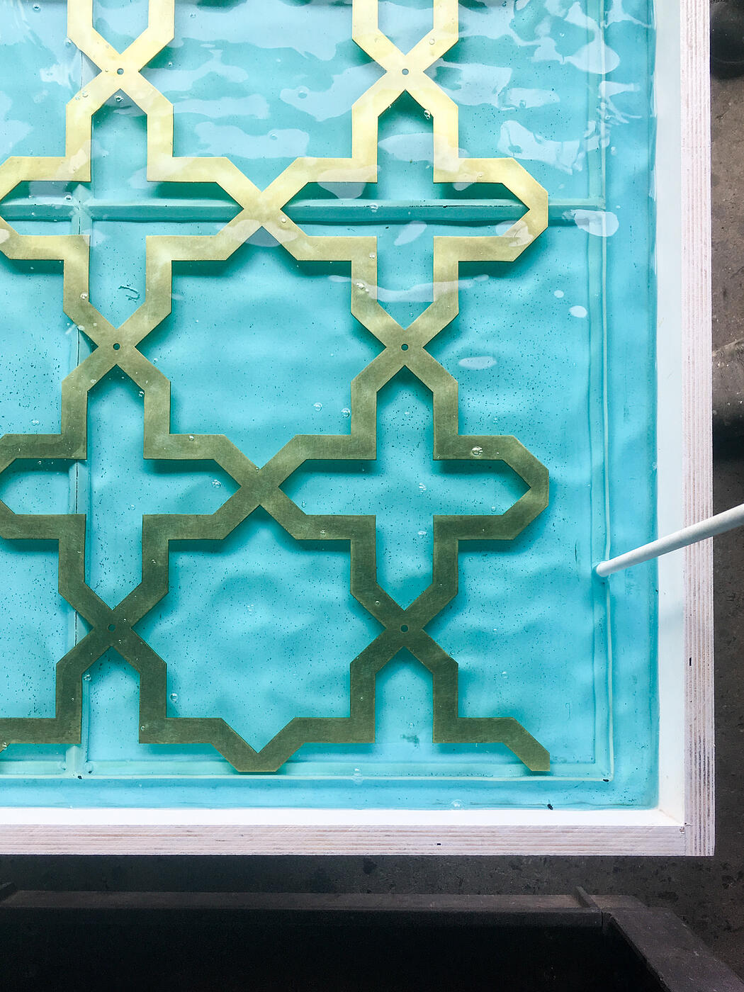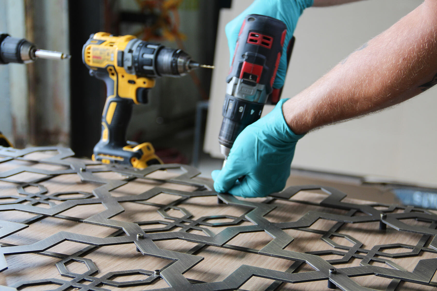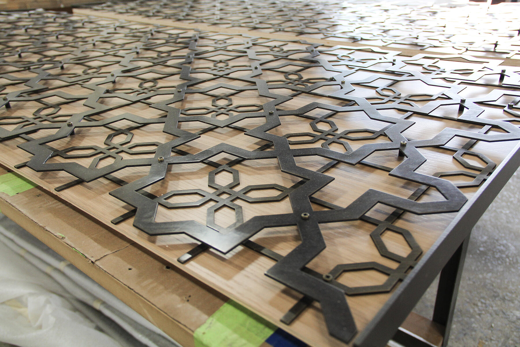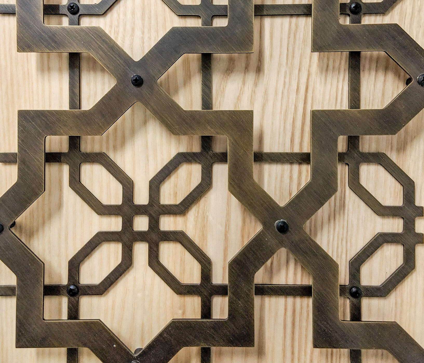 Each sheet of brass was carefully laser cut to the designed pattern. Our team then patinated, brushed and waxed each panel by hand for an inviting finish that emulates oil rubbed bronze. Both layers were mechanically fastened with custom brass plated hardware to match the specified finish of the metal.