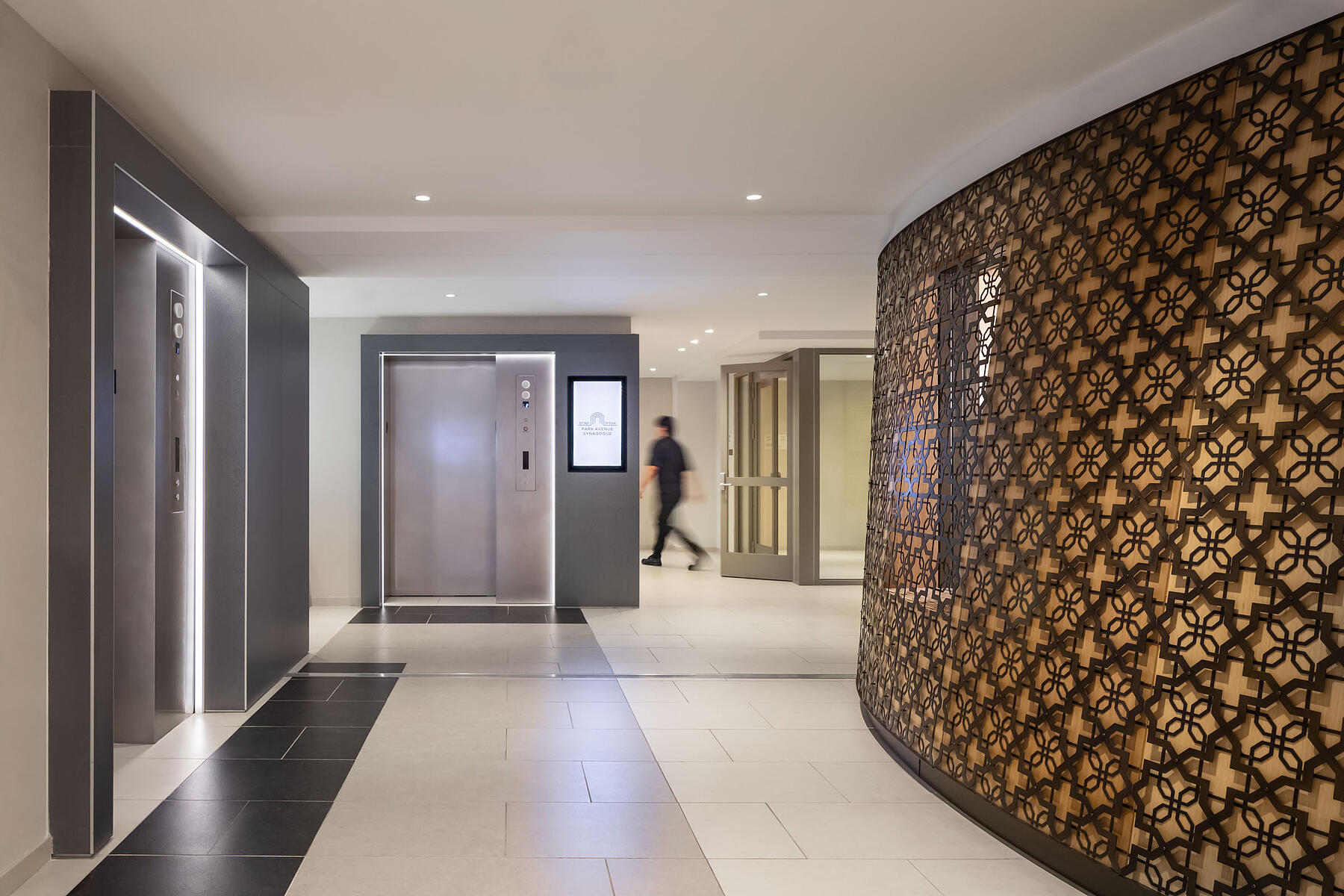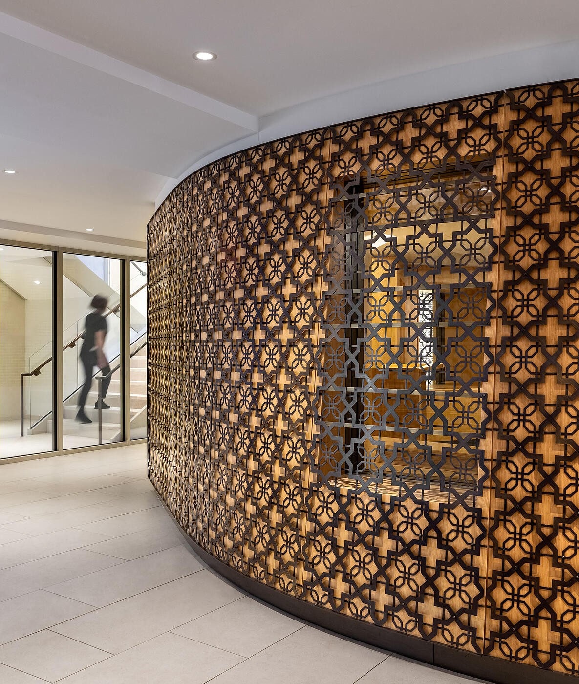 Beginning with our Design Assist, we mindfully developed and refined the cladding design with MBB Architects and the client. In order to help bring together the architect's and synagogue's vision of a cultural space for prayer, our project management team explored various materials, pattern details, and coordination strategies for what would ultimately become an ornate multilayered wood and decorative metal feature.