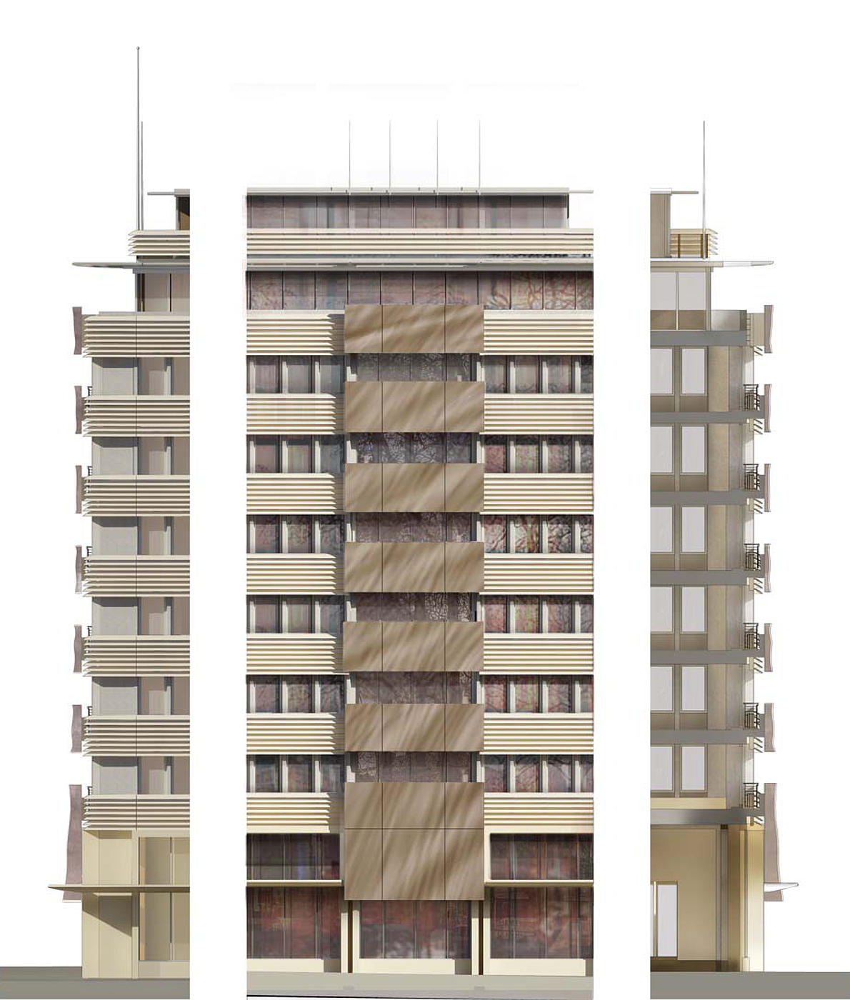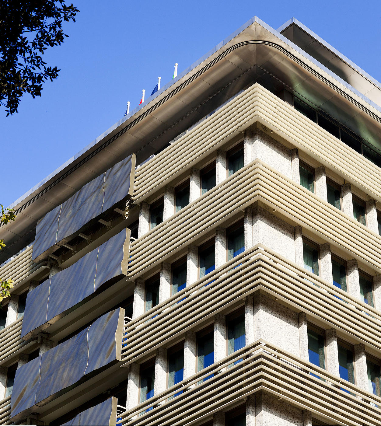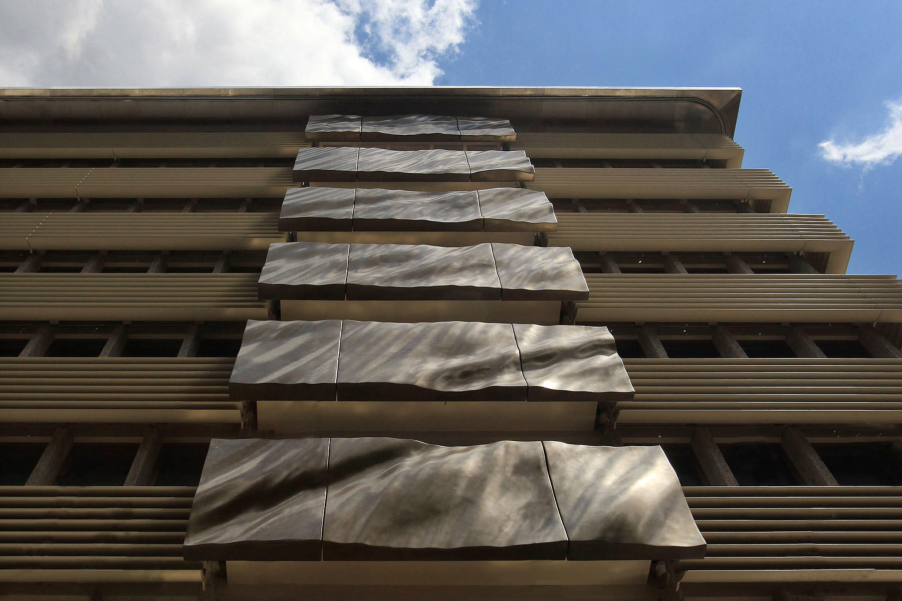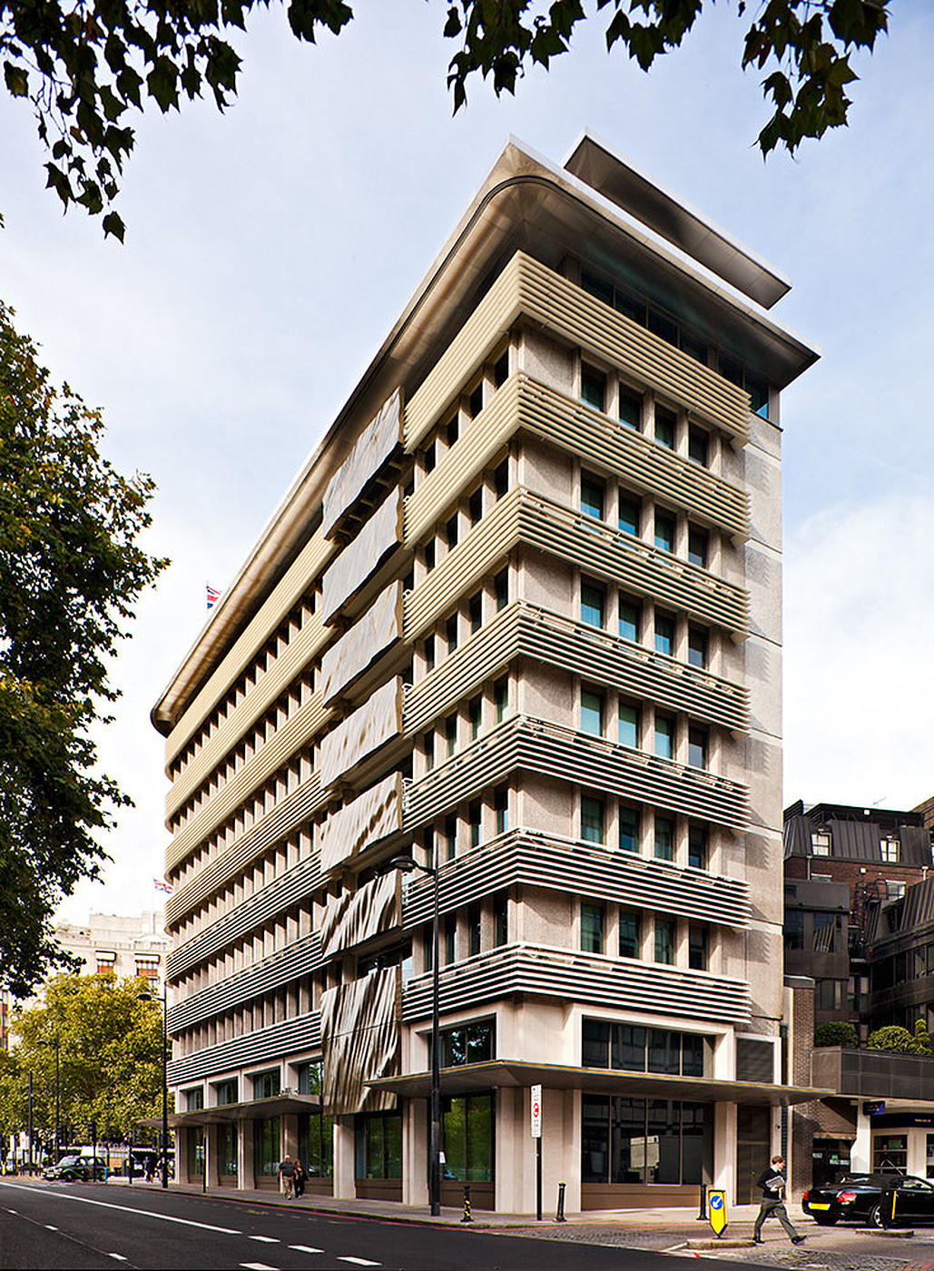 The rippled metallic panels span the full 8-story height of the building, cladding a number of the balconies which overlook London’s Hyde Park.