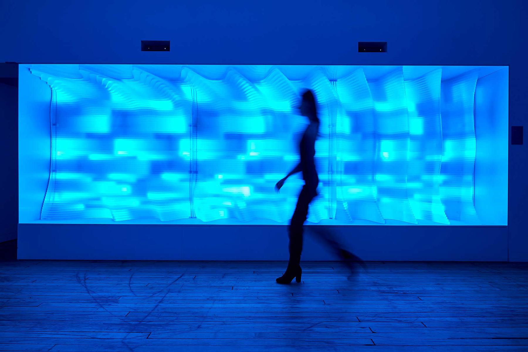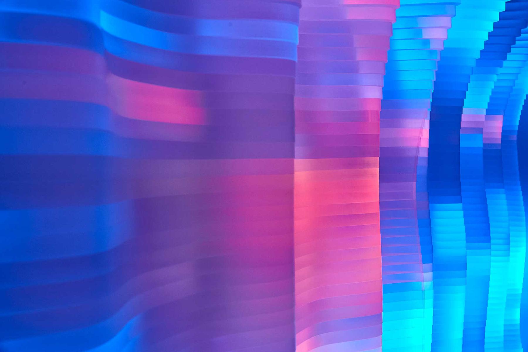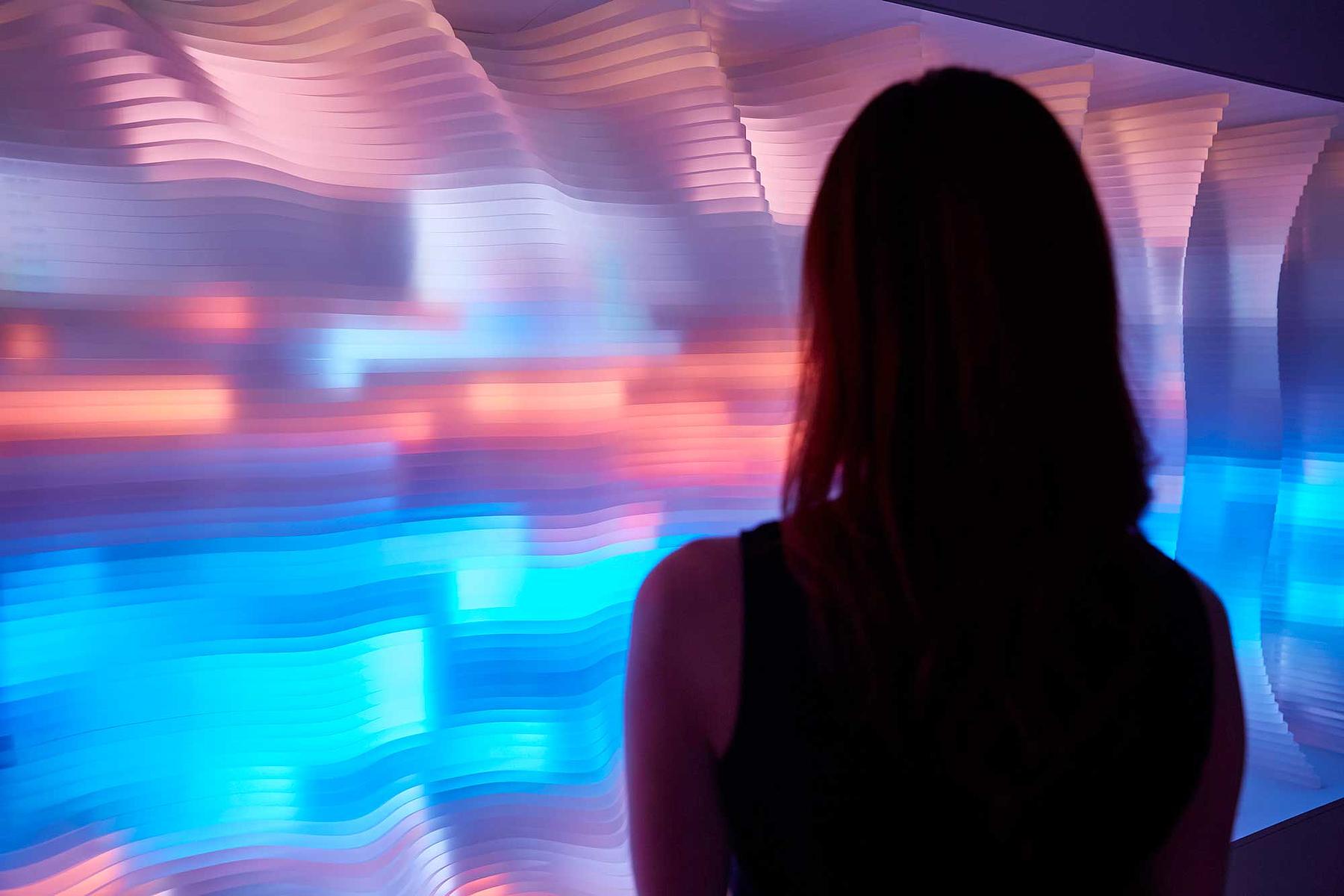 The Passage is a glowing wall-mounted installation with geologically inspired ridges and peaks, which are made up of 72 stacked layers of milled acrylic. Programmable LED panels are suspended behind frosted acrylic topographies that form an undulating relief, producing a responsive prismatic display that illuminates the passage as individuals walk through. The translucent installation measures 8 ft in height and 18 ft in length, and is stabilized by steel rods and supports engineered for minimal visual impact.