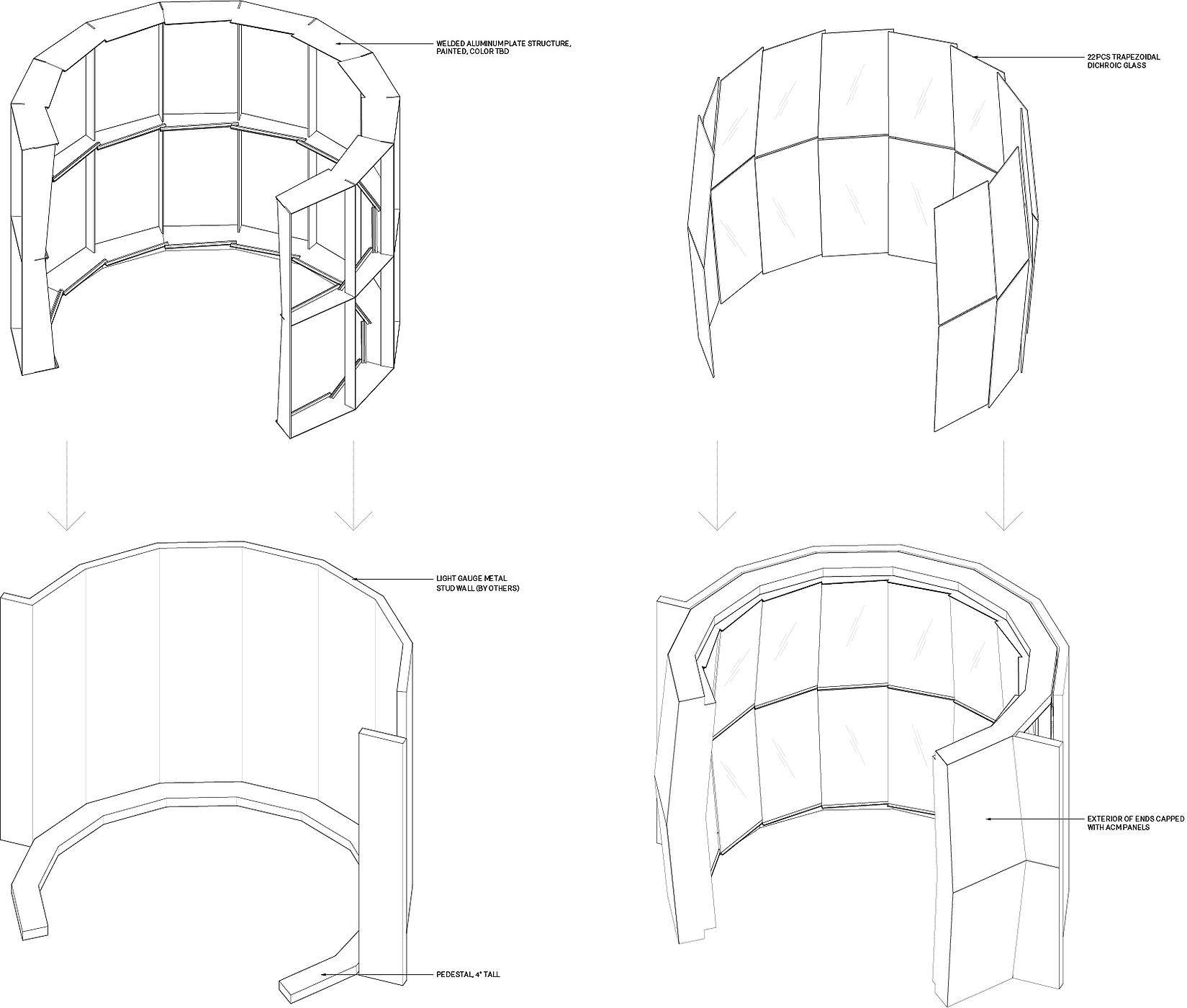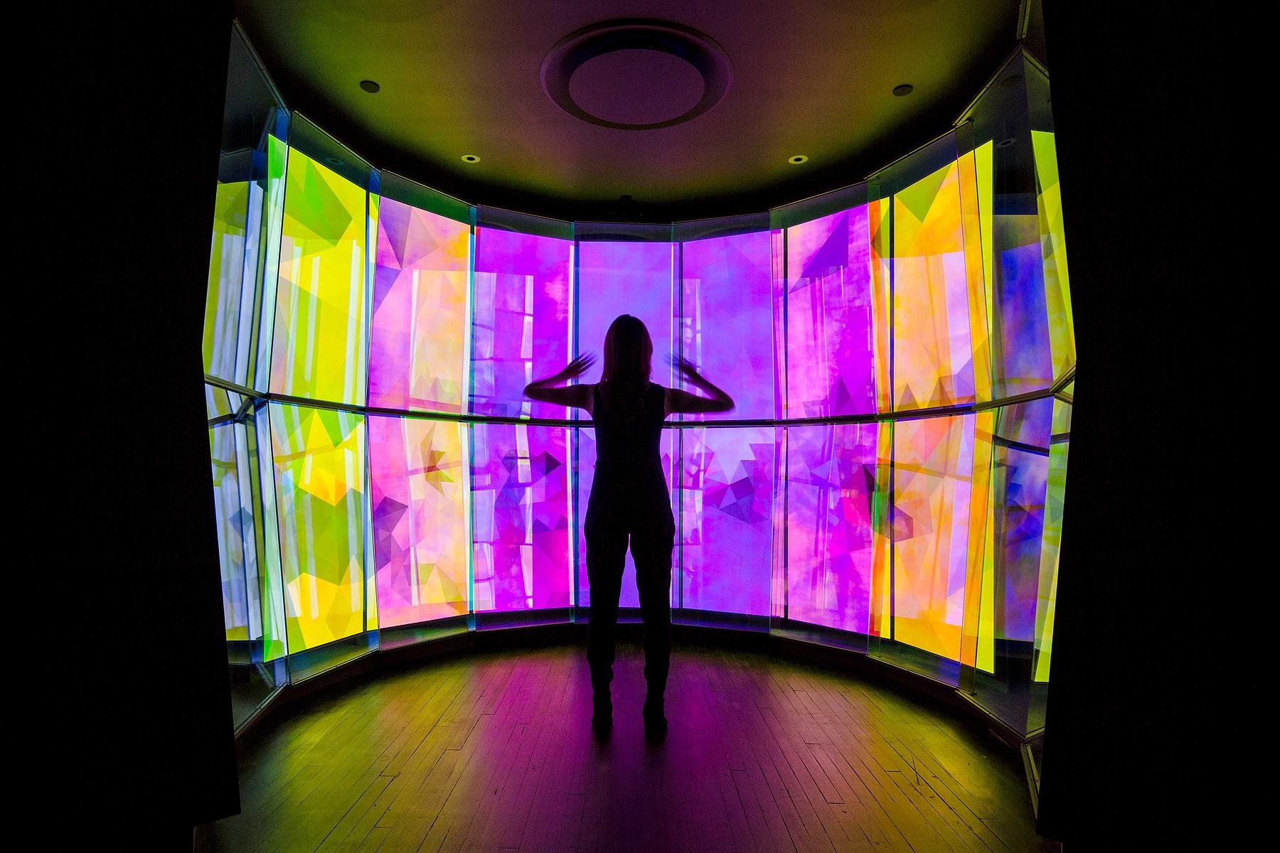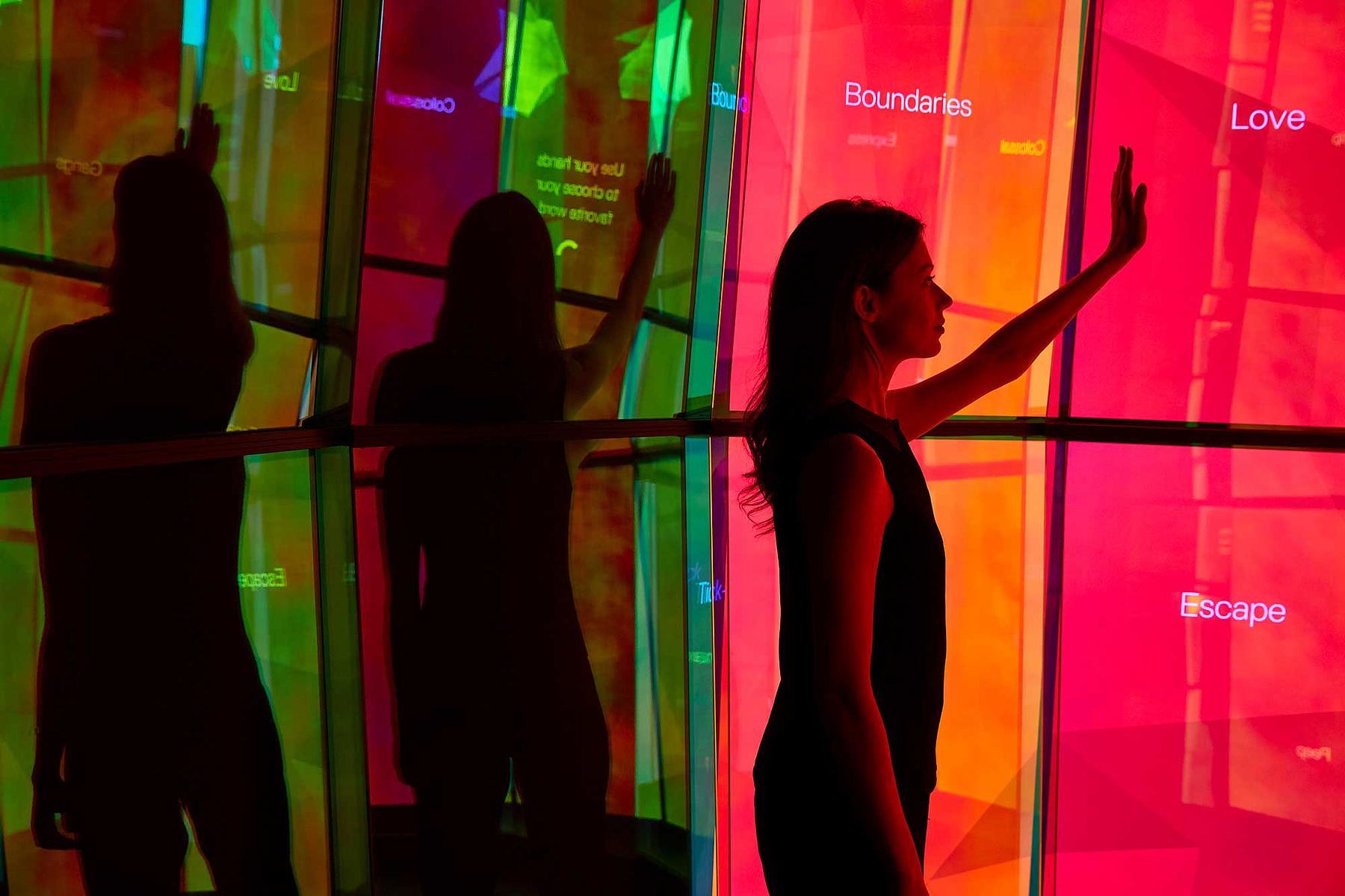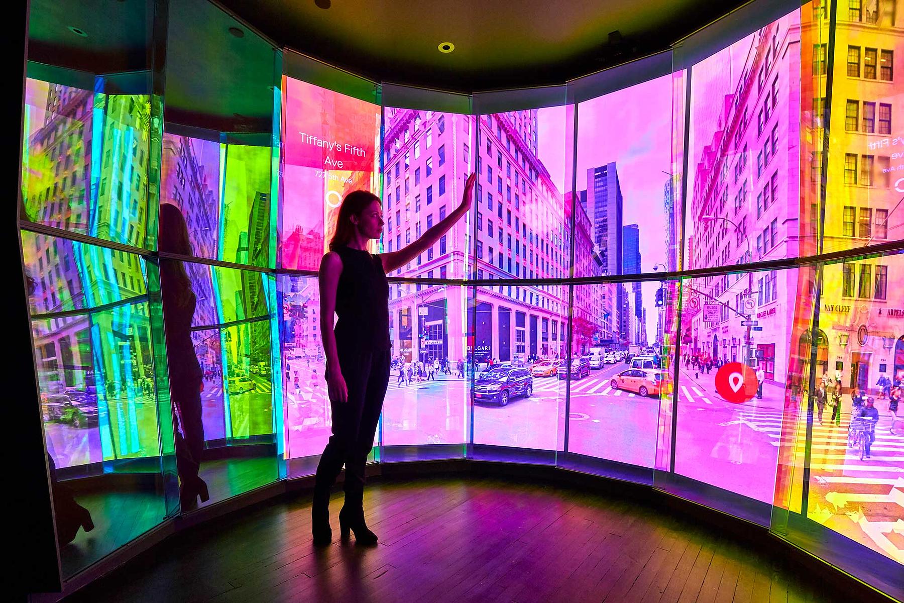 The City Cave creates an immersive environment through an array of dichroic glass panels suspended at angles from an aluminum frame. Positioned directly in front of OLED display screens, the 22 glass panels provide a colorful lens to the interactive digital content behind them, developed by HUSH.