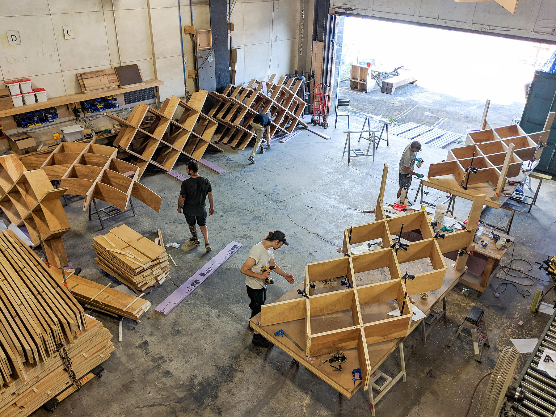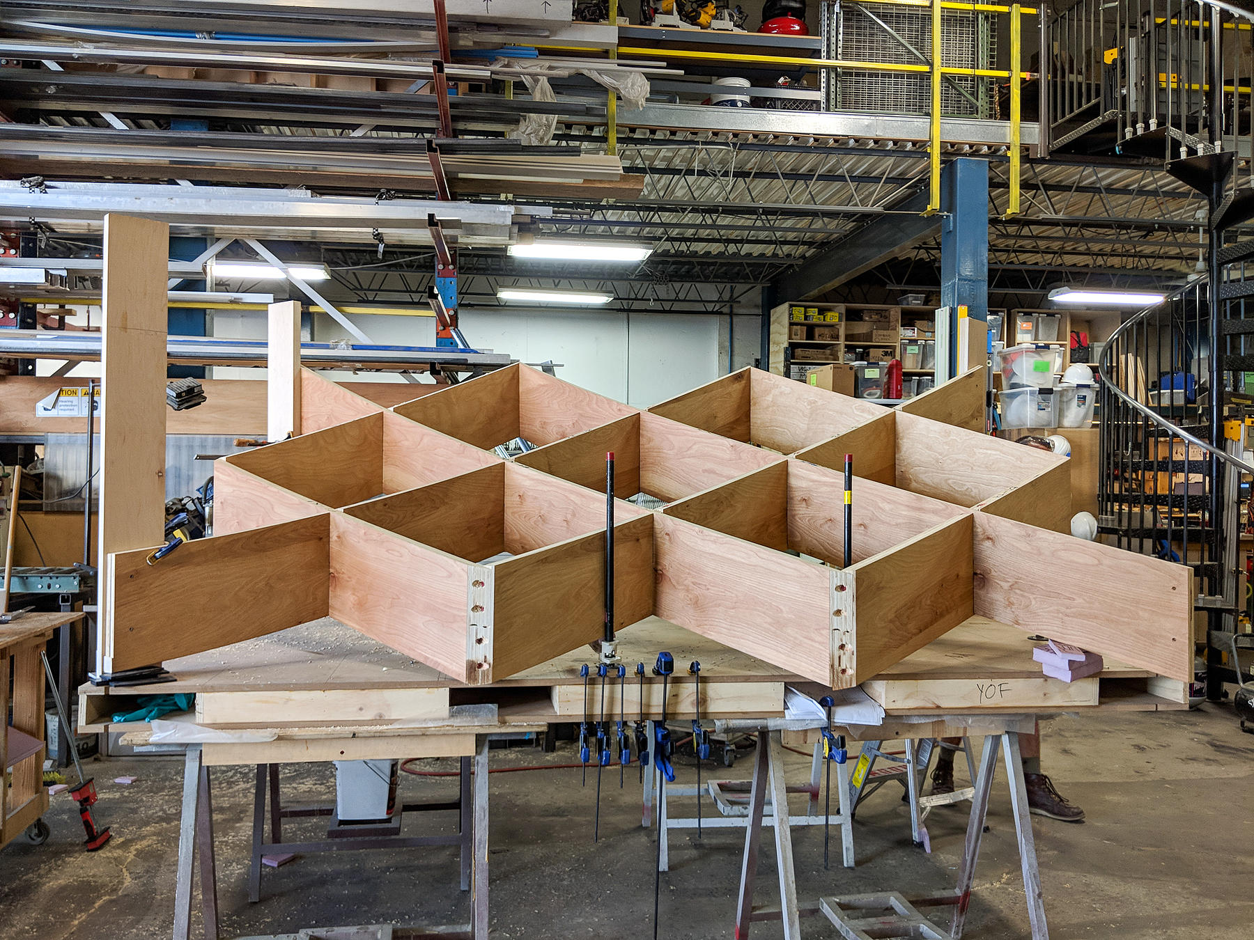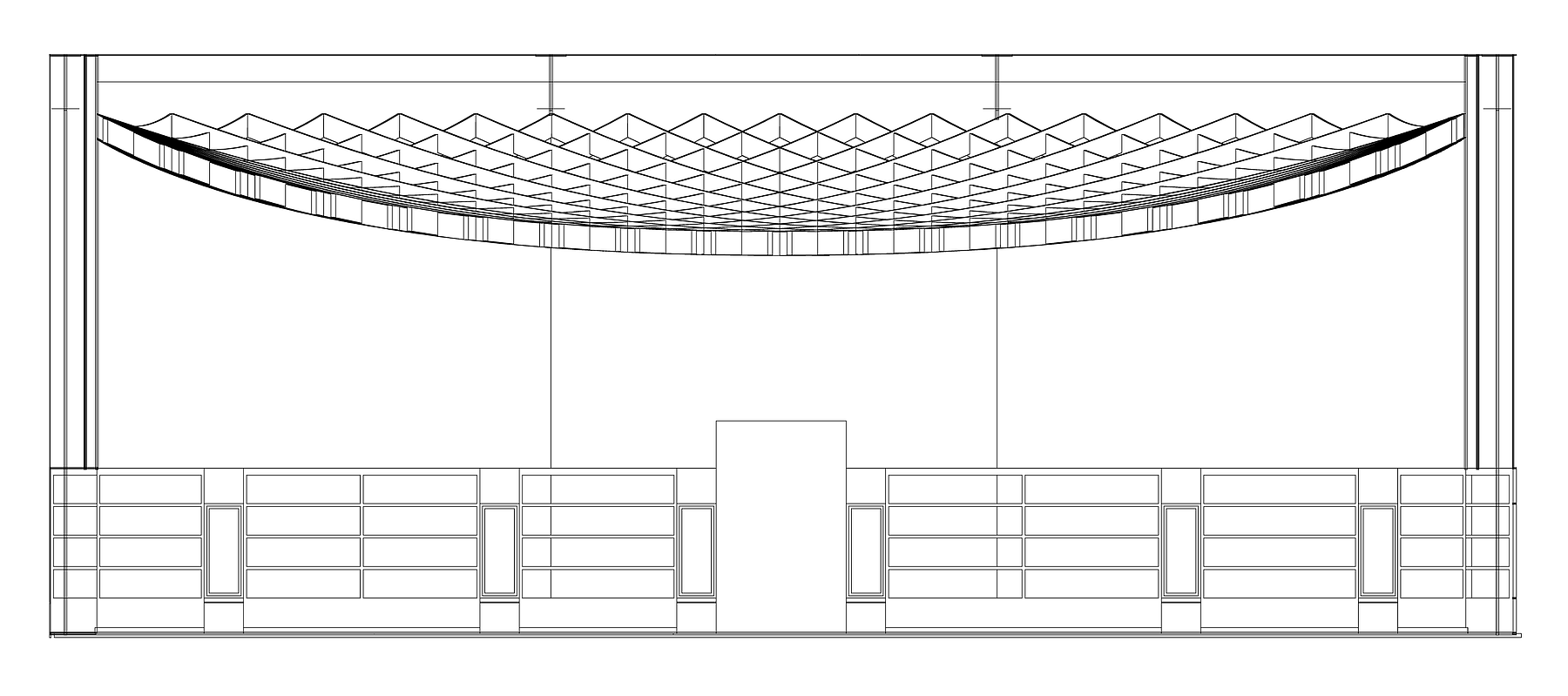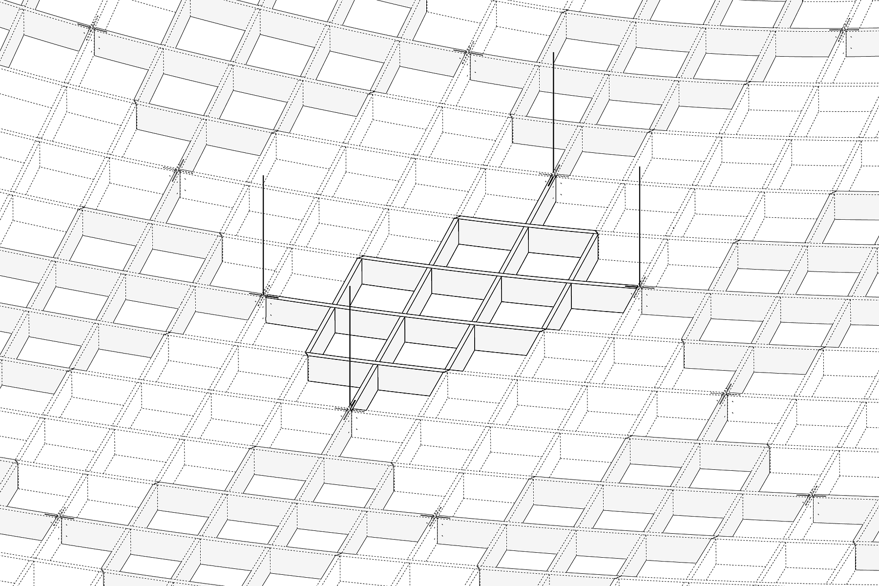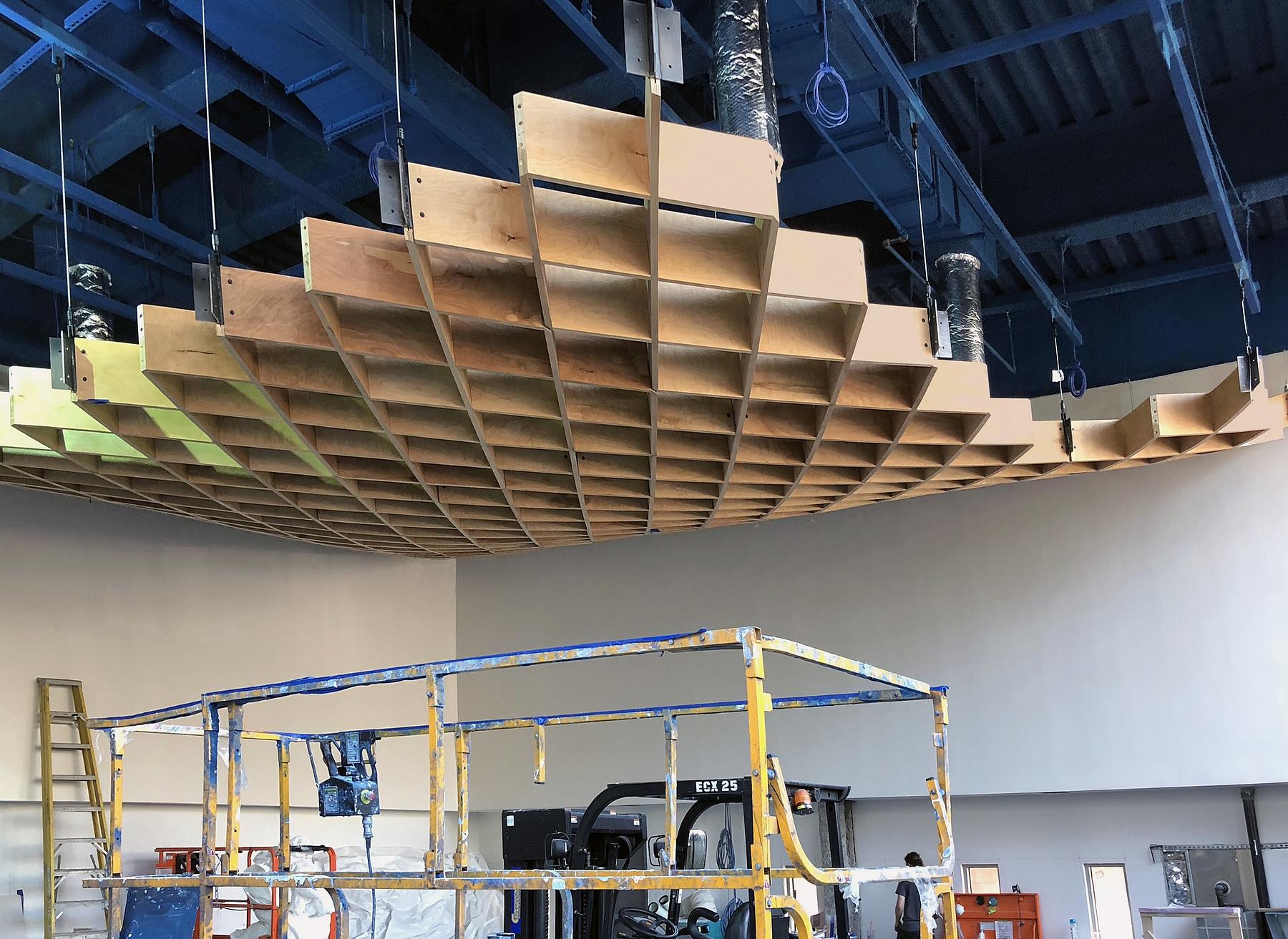 The canopy was conceived as a 2,500 sq ft curved lattice, suspended from a 20-foot-high ceiling. We created a modular system wherein 10-foot by 5-foot sections of interlocking beams attach together to form the canopy. Composed of 54 modules, our goal was to create a uniform appearance across the entire ceiling installation.
