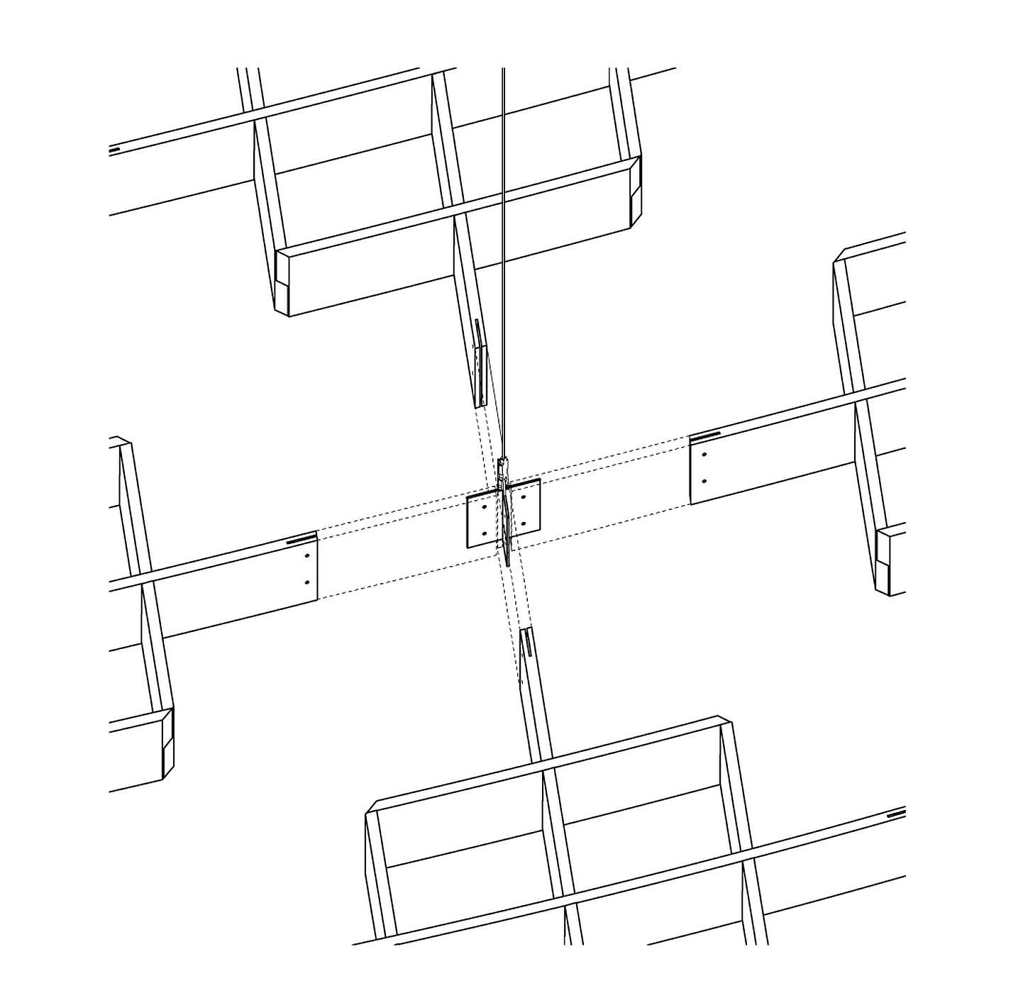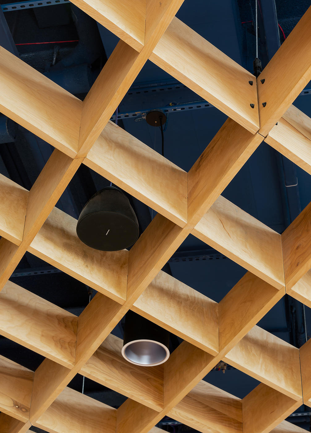 Notches in the beams allowed them to interlock without needing to be glued together. Since the self-supporting modules were still somewhat flexible the installation process was much easier. Given the canopy’s sloping geometry, we designed custom steel joints that align with the angles of each module exactly. Sockets in the four corners of each module allow these steel joints to fit cleanly and inconspicuously within adjoining beams, thereby connecting the canopy together. Steel cables, which connect to the same joints, suspend the canopy from the ceiling, while pendant lights, speakers and sprinklers hang between the gaps.