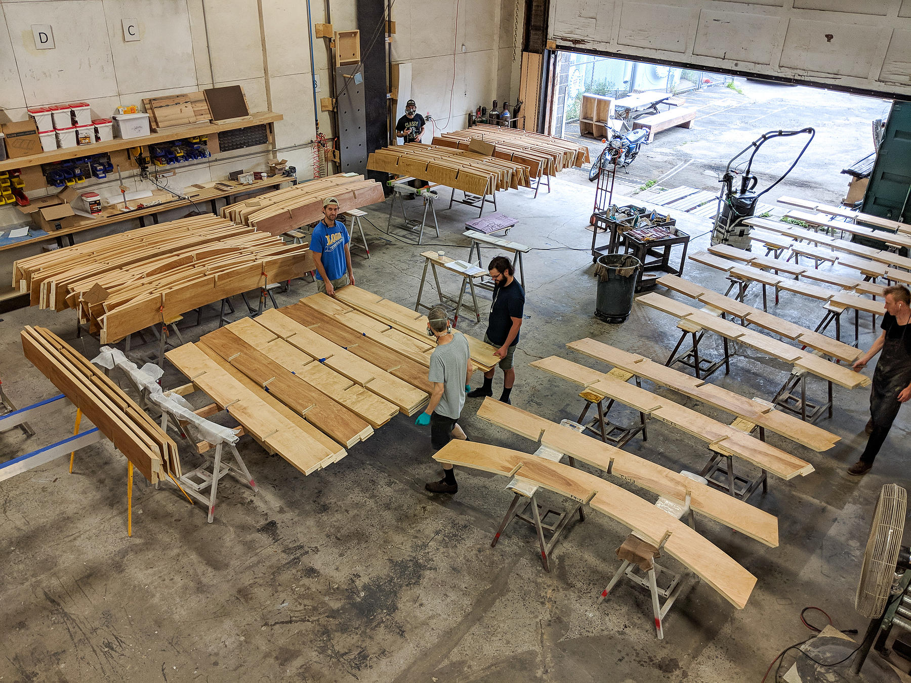 In terms of material, solid beams would have been heavy, costly and unfeasible to install, and thus an alternative was needed. After evaluating a range of material options we recommended using lightweight birch-veneered plywood. Once we received the sheets, we took advantage of our large format CNC-router to cut out curved beams. We then laminated the raw edges with matching strips of birch veneer, which gave the appearance of solid wooden beams without all the weight and expense.