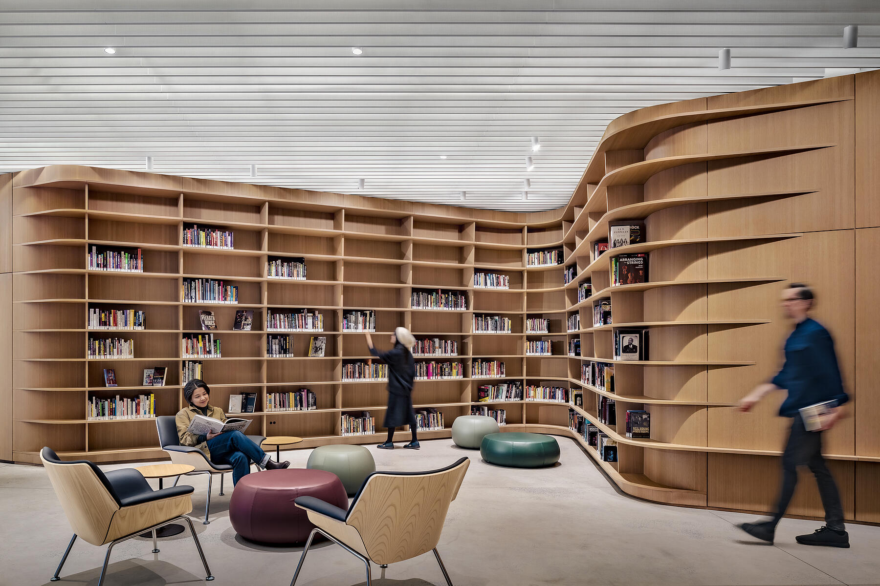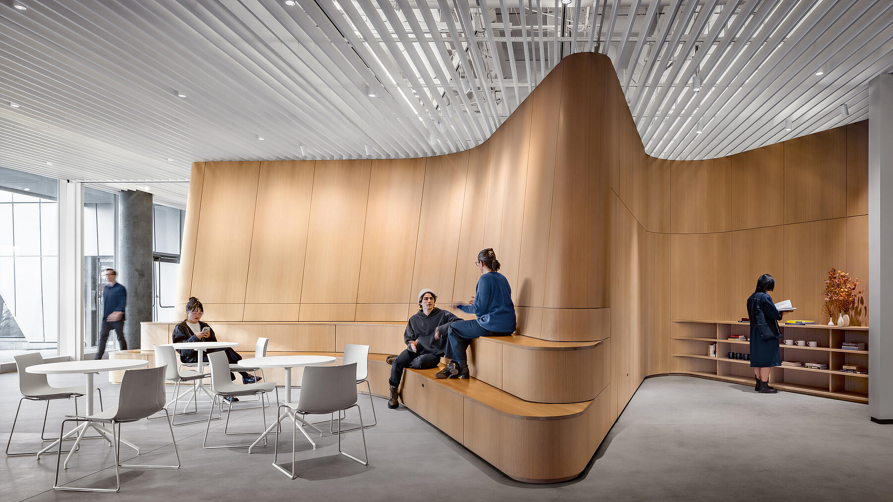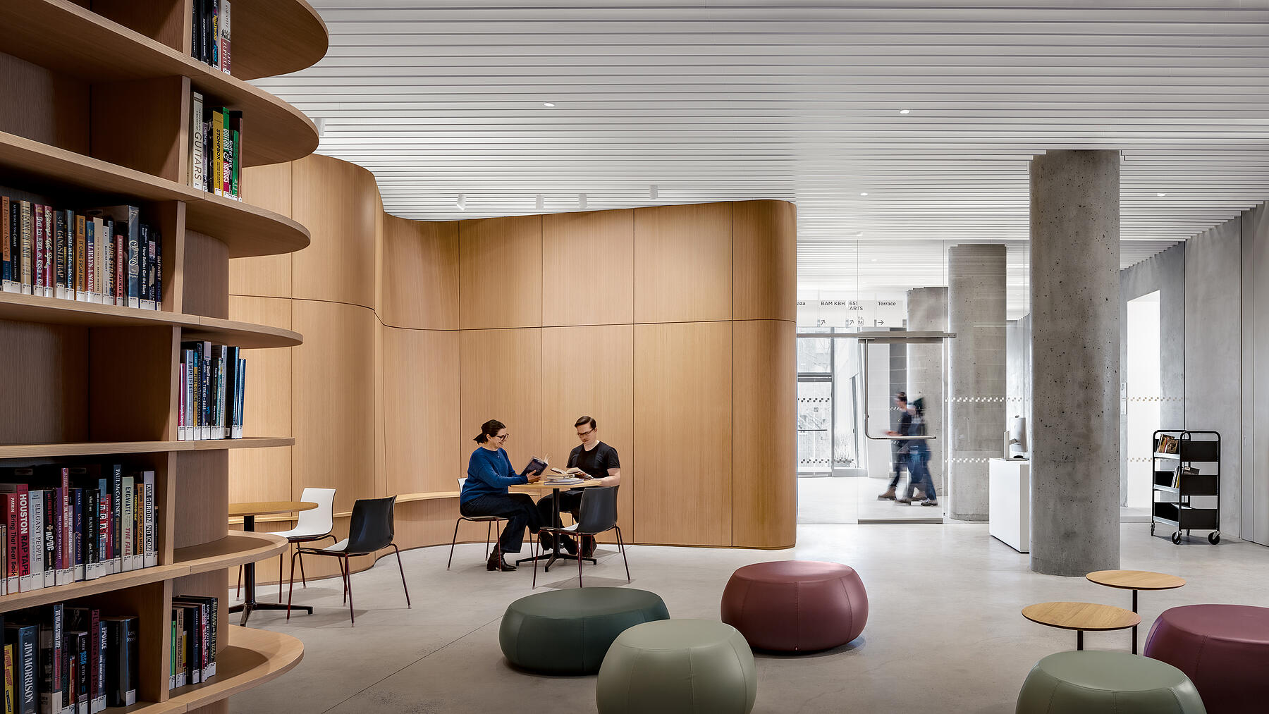 Central to L10’s design is an undulating oak wall that winds through BPL’s reading room and into MoCADA’s performance space, creating a curvilinear thread between the two spaces. Grain matching was a critical aspect of this build, requiring a high level of collaboration with the design team and material suppliers to ensure a continuous, vertical grain across the curved panels, while maintaining a harmonious look with veneer from multiple logs.