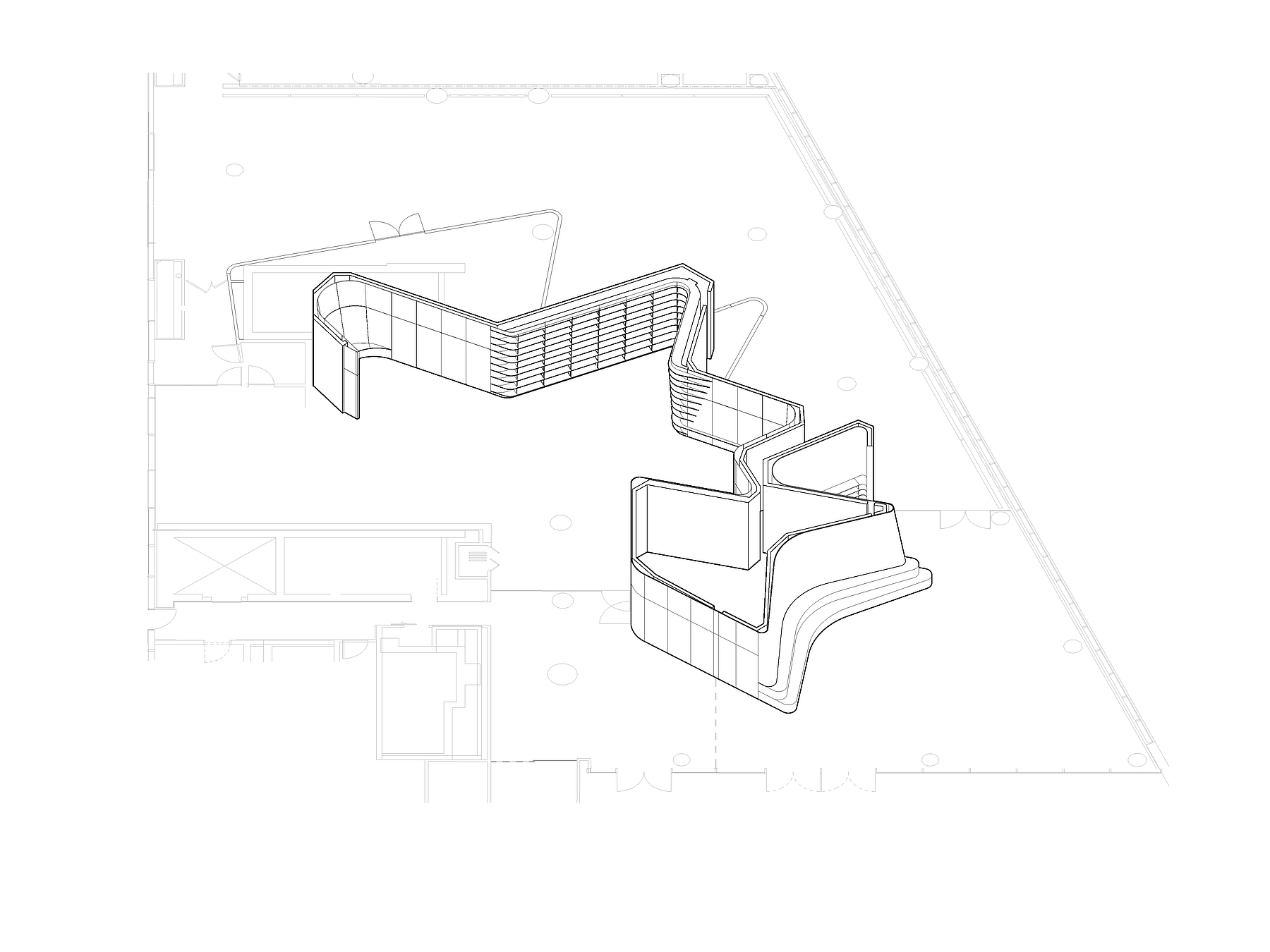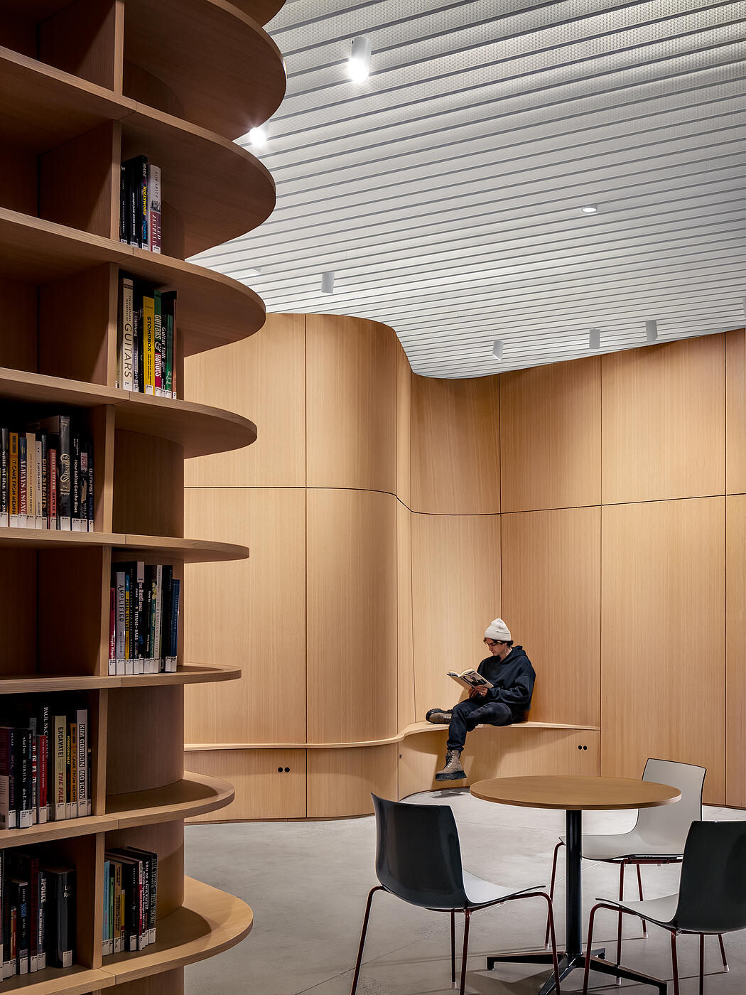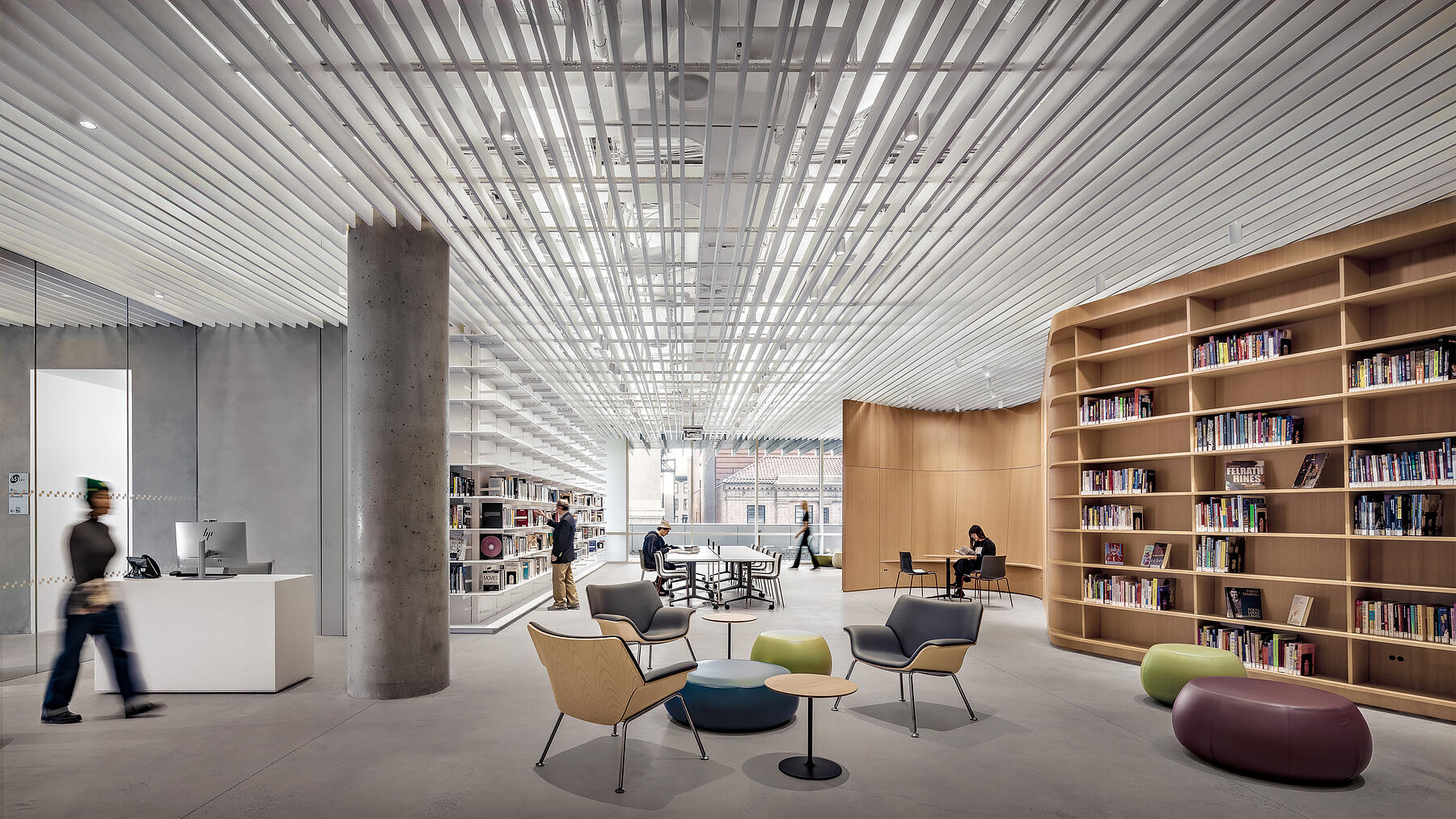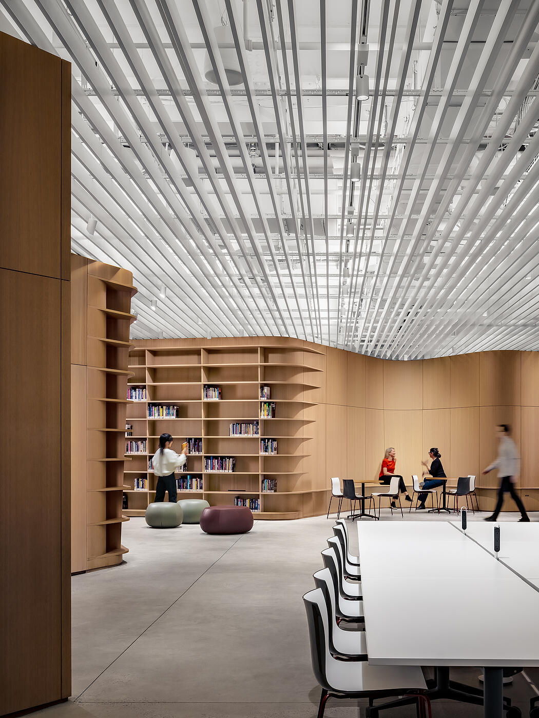 Central to L10’s design is an undulating oak wall that winds through BPL’s reading room and into MoCADA’s performance space, creating a curvilinear thread between the two spaces. Grain matching was a critical aspect of this build, requiring a high level of collaboration with the design team and material suppliers to ensure a continuous, vertical grain across the curved panels, while maintaining a harmonious look with veneer from multiple logs.