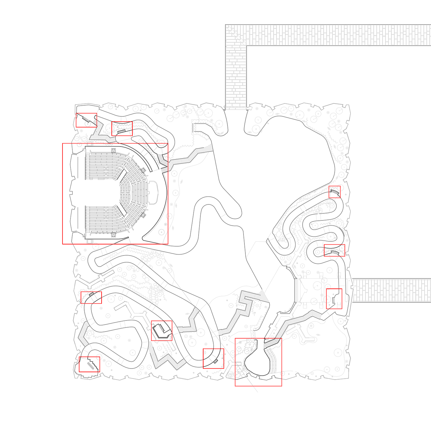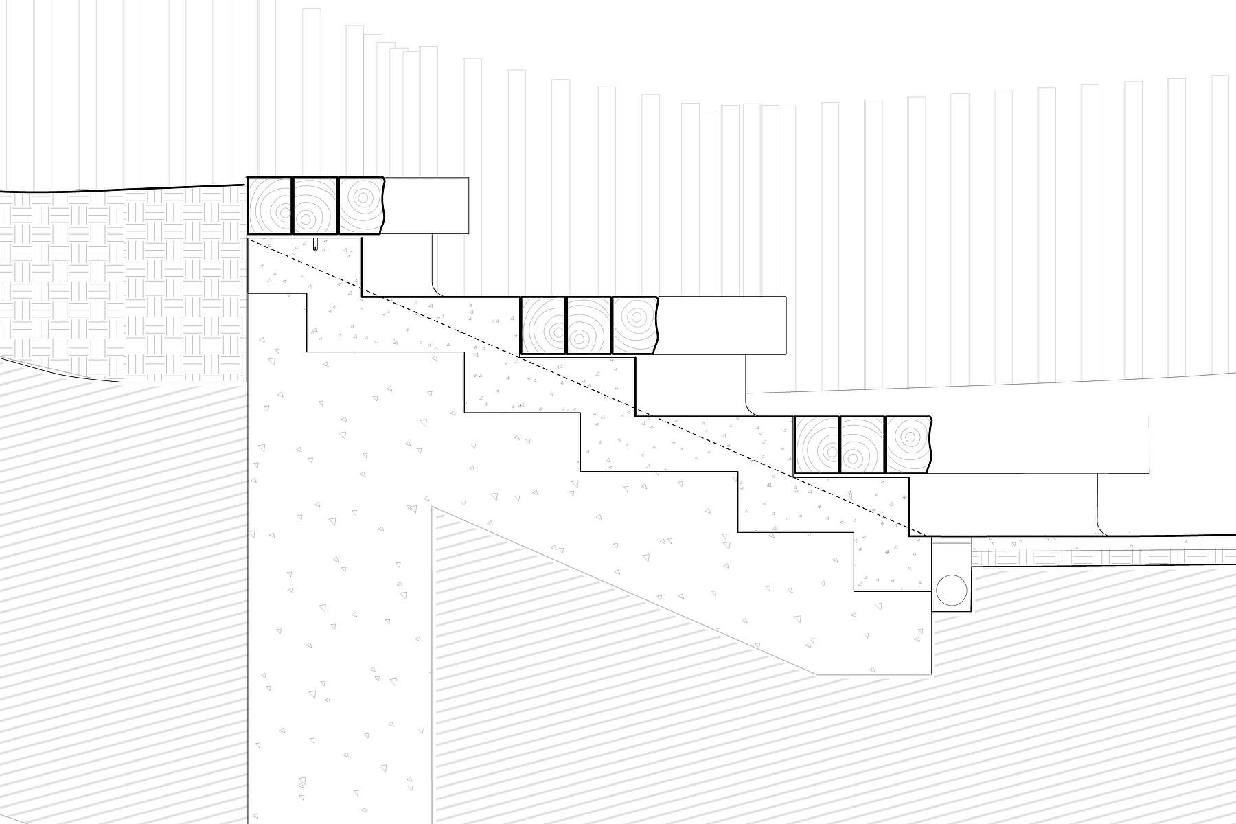 At the park’s southern end, another performance space is built into the landscape. The Glade is used casually as a place to rest as well as for unticketed events so we intended to reinforce that relaxed atmosphere. Tiers of communal seating are built from large black locust timbers with a continuous sculpted edge that unifies the benches and provides a more comfortable seat.