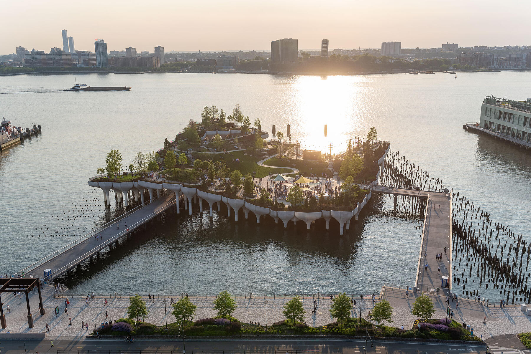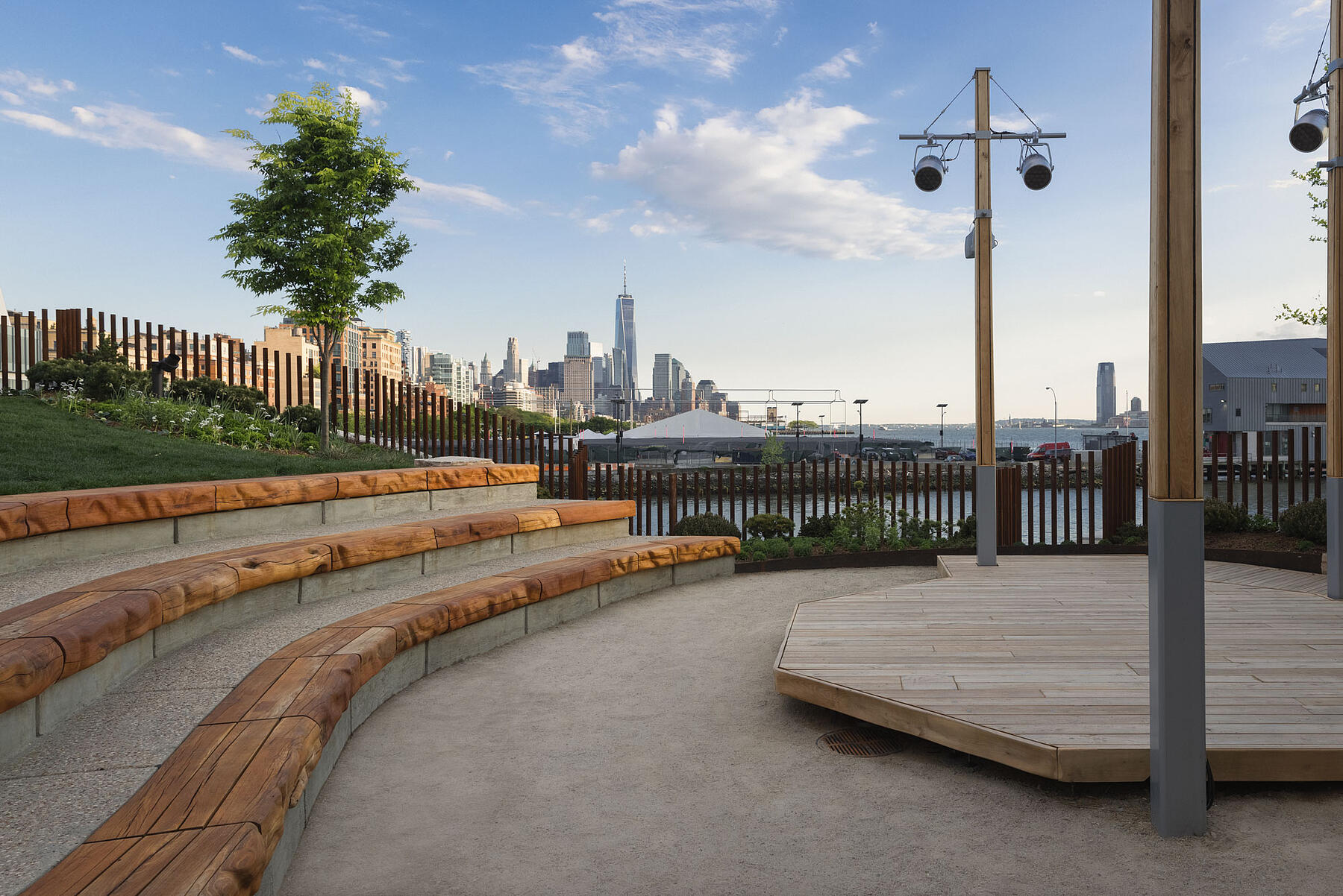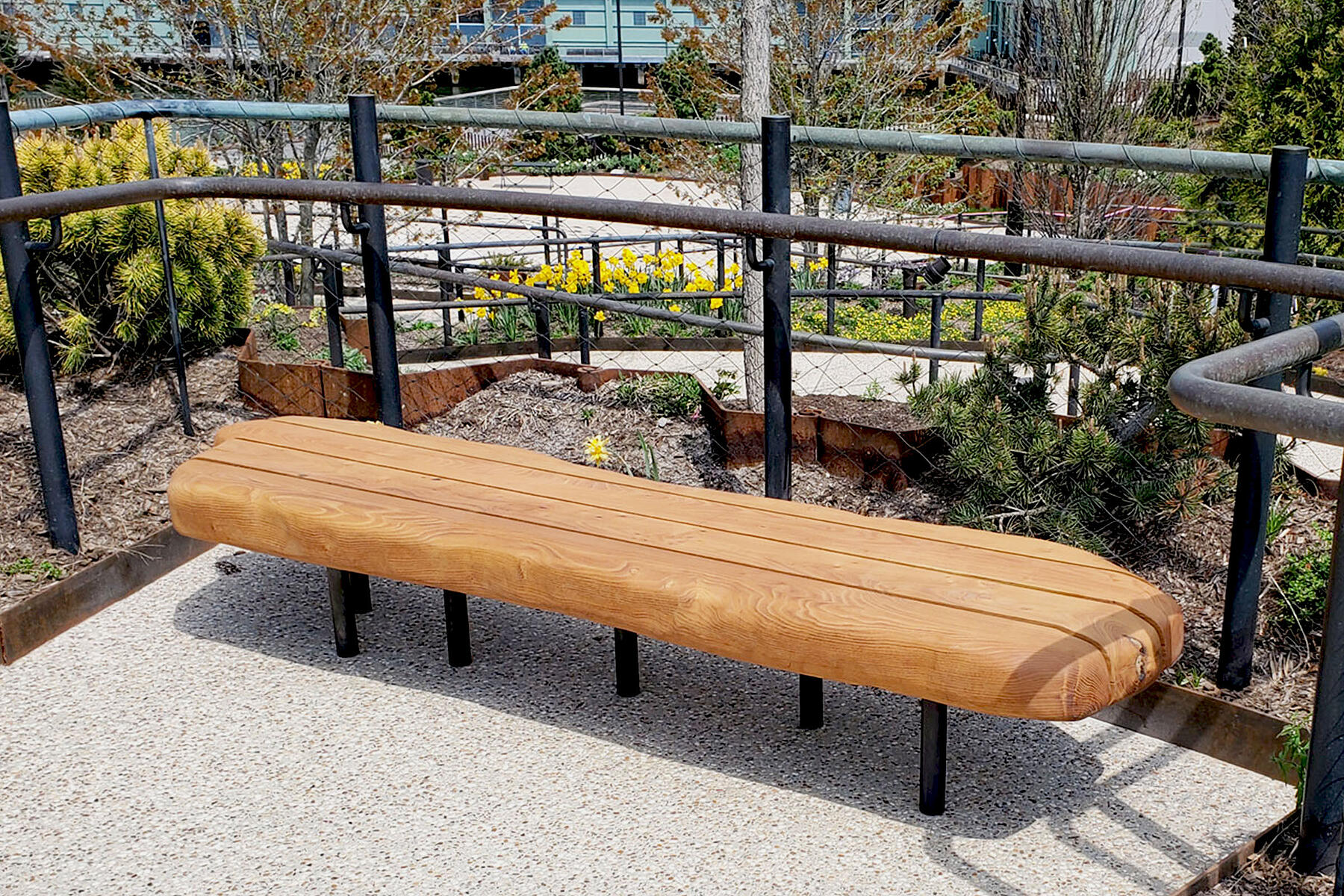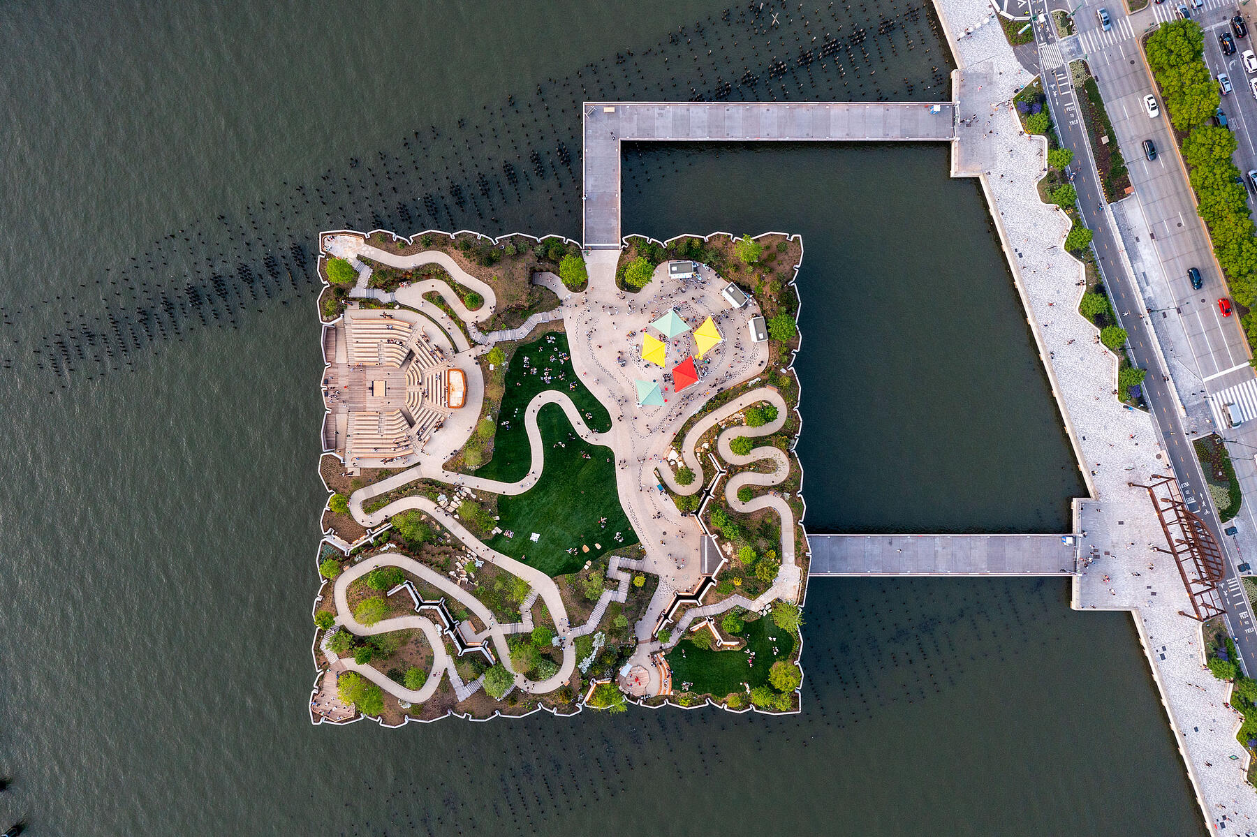 In addition to the lawns and event spaces, Little Island is landscaped with rolling hills and winding trails. A series of benches that we built are nestled along these paths, providing comfortable rest spots to enjoy the views.