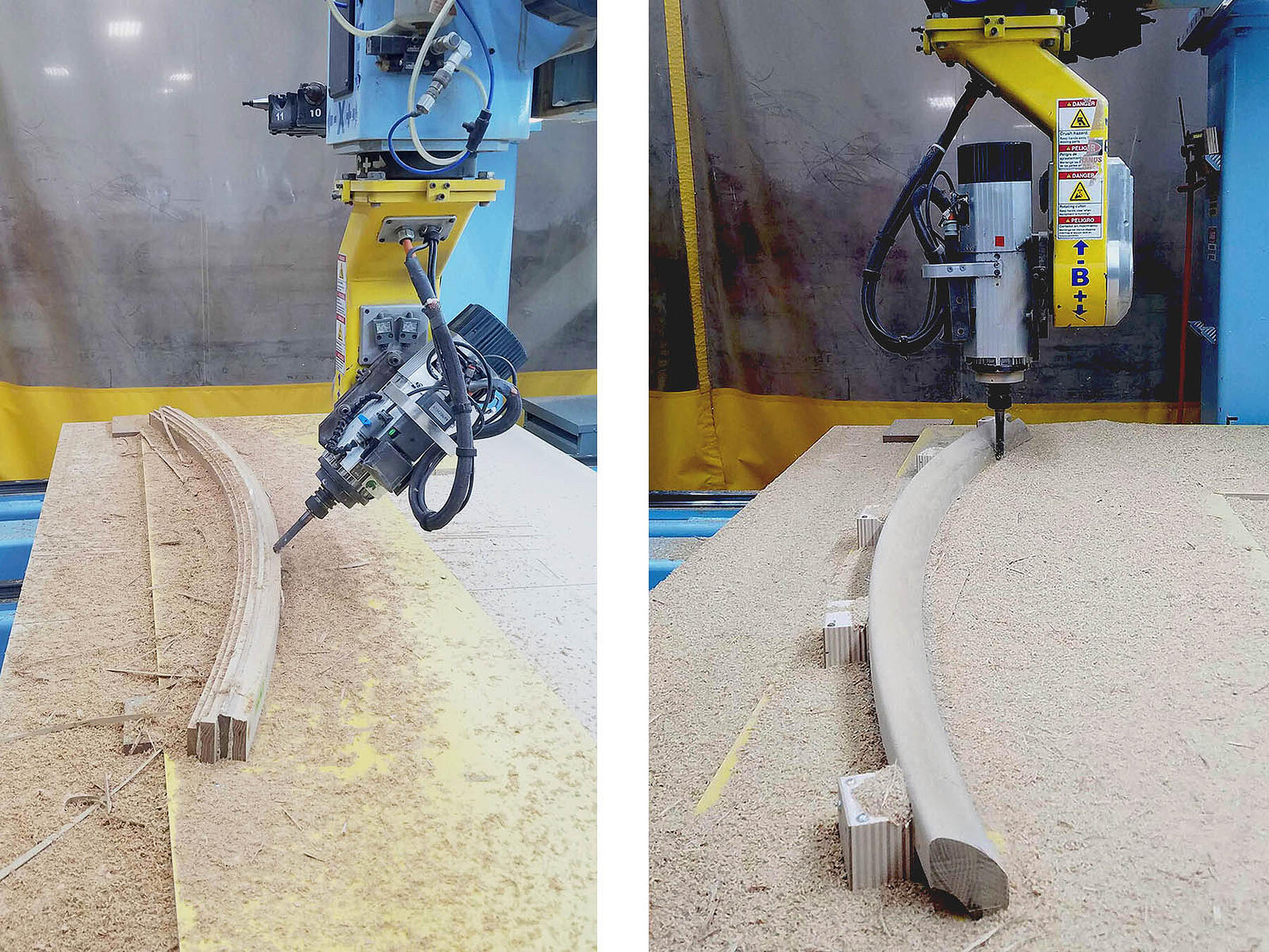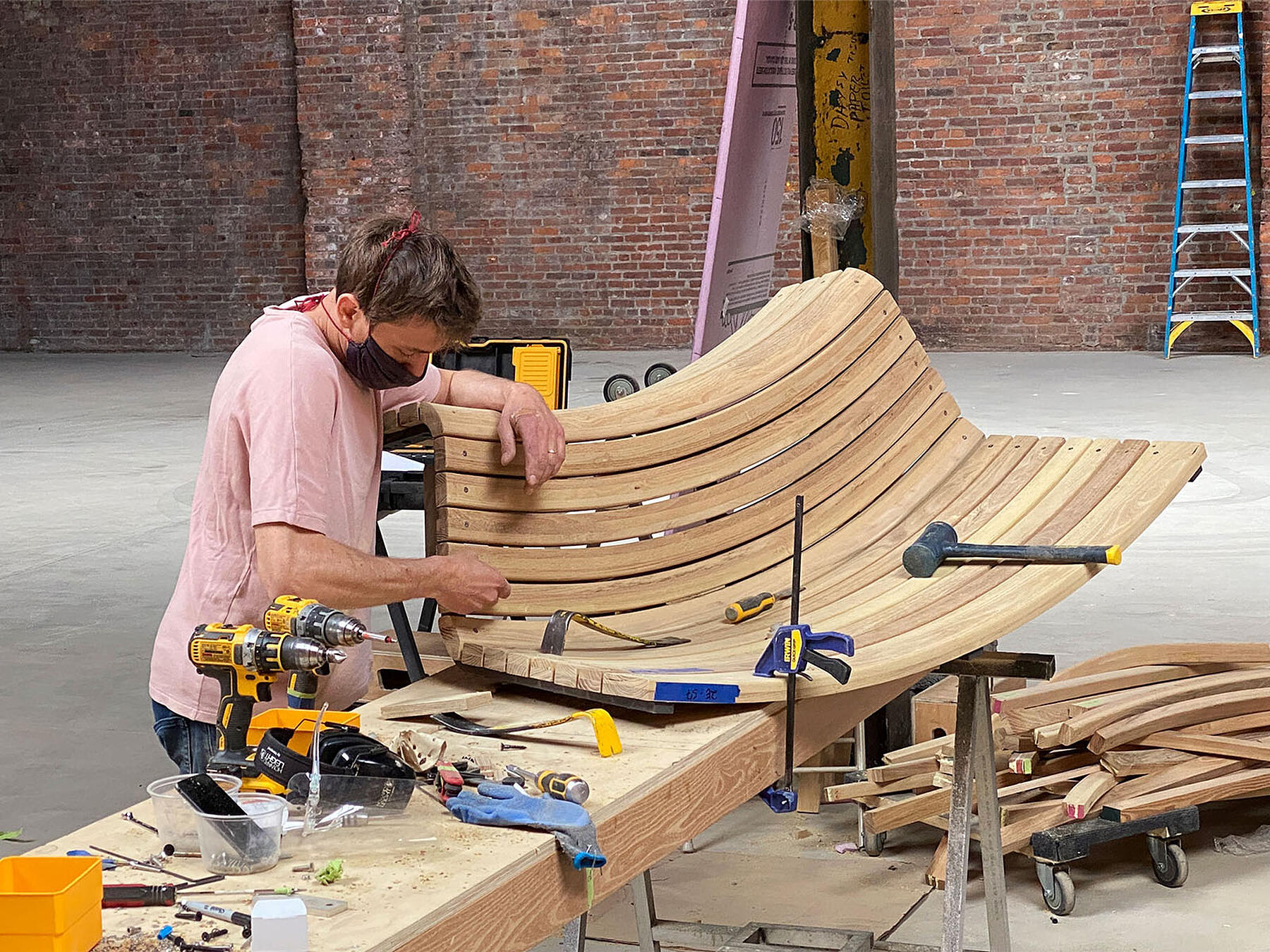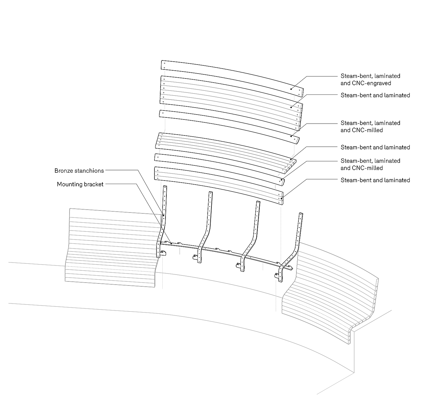 Using varied sequences of steam bending and CNC-milling allowed us to achieve continuous curves with soft profiles for comfort during long events.