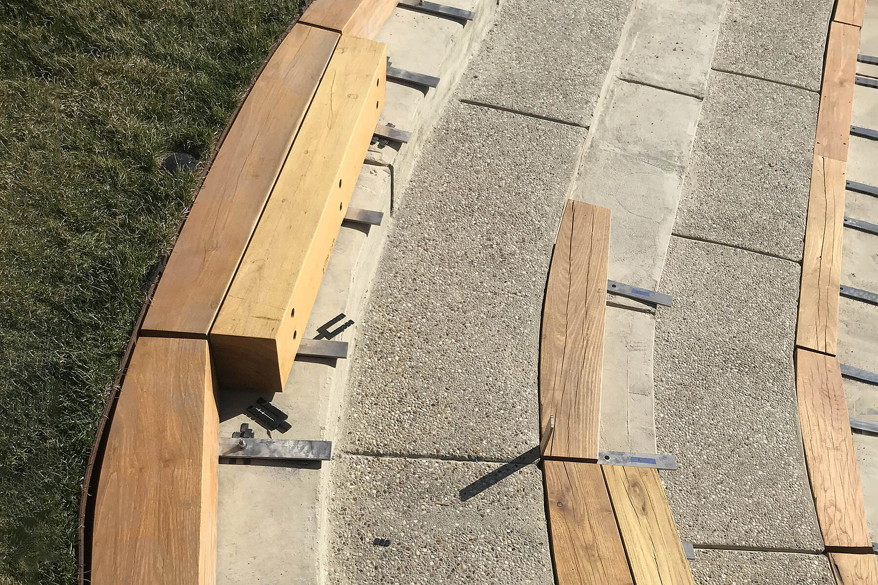 Each of these ten long seats are made from heavy black locust timbers and bronze legs—some with backrests, some without. Each has a unique form, shaped manually by sculpting away the hard edges and transforming them into softly curving surfaces. By maintaining a continuous organic geometry along the outer edges, their construction mimics the visual effect of natural live-edge slabs while maintaining the stability of an engineered construction. The timbers are reinforced and mounted on bronze legs that we patinated in our shop to match the warm palette used throughout the site.