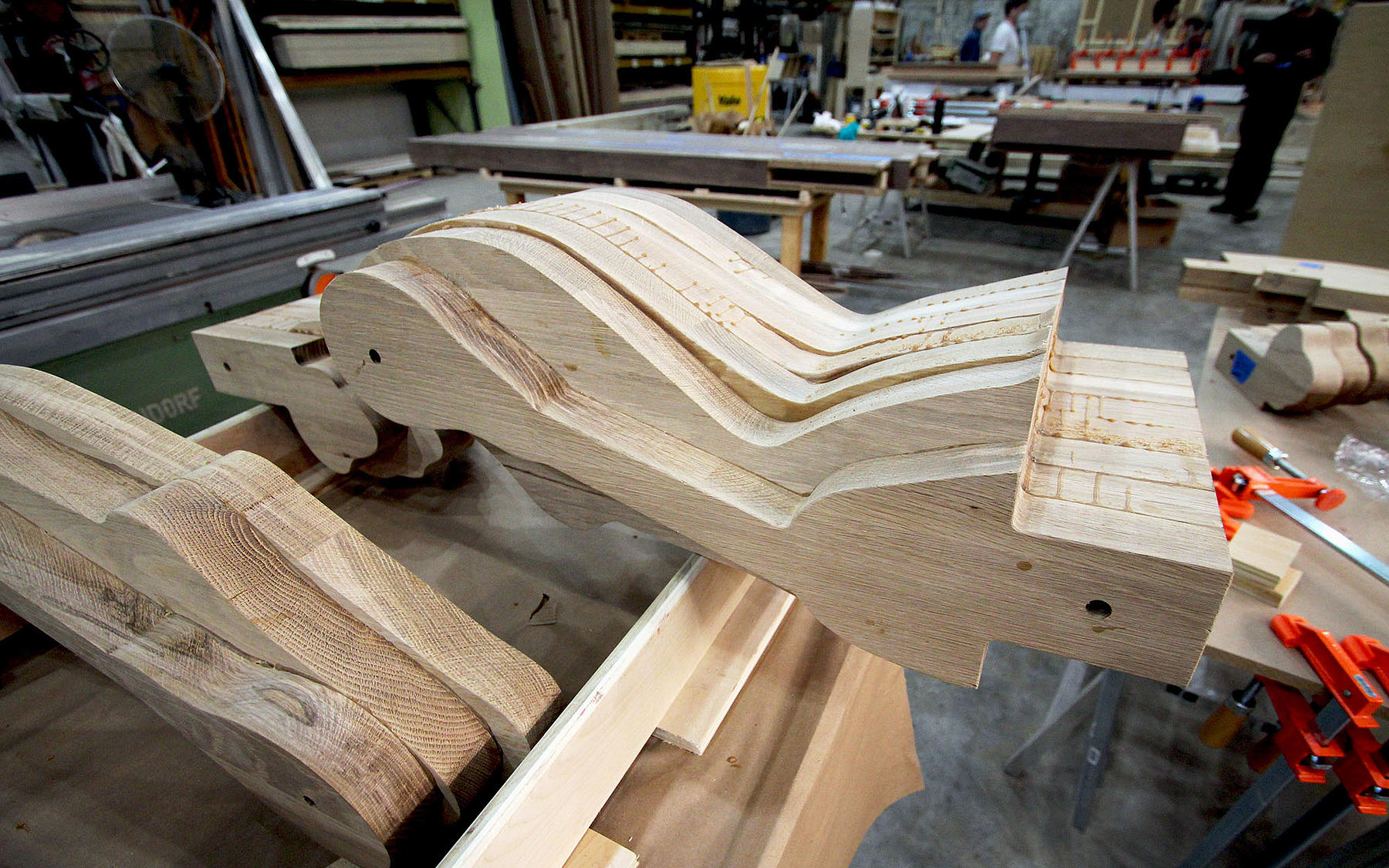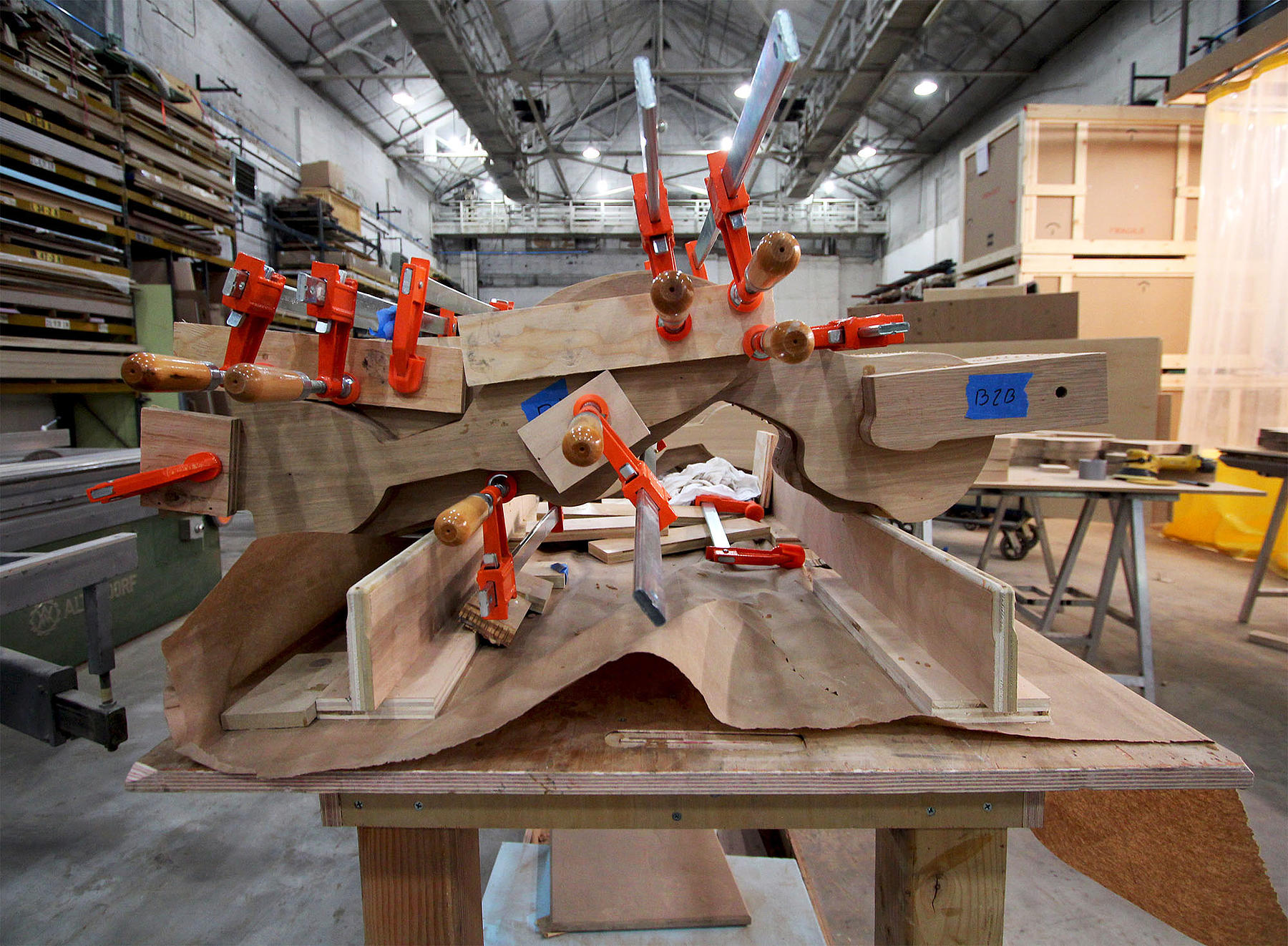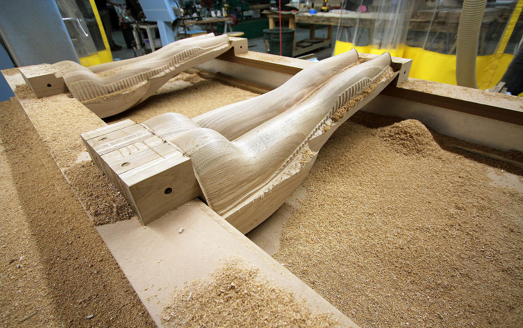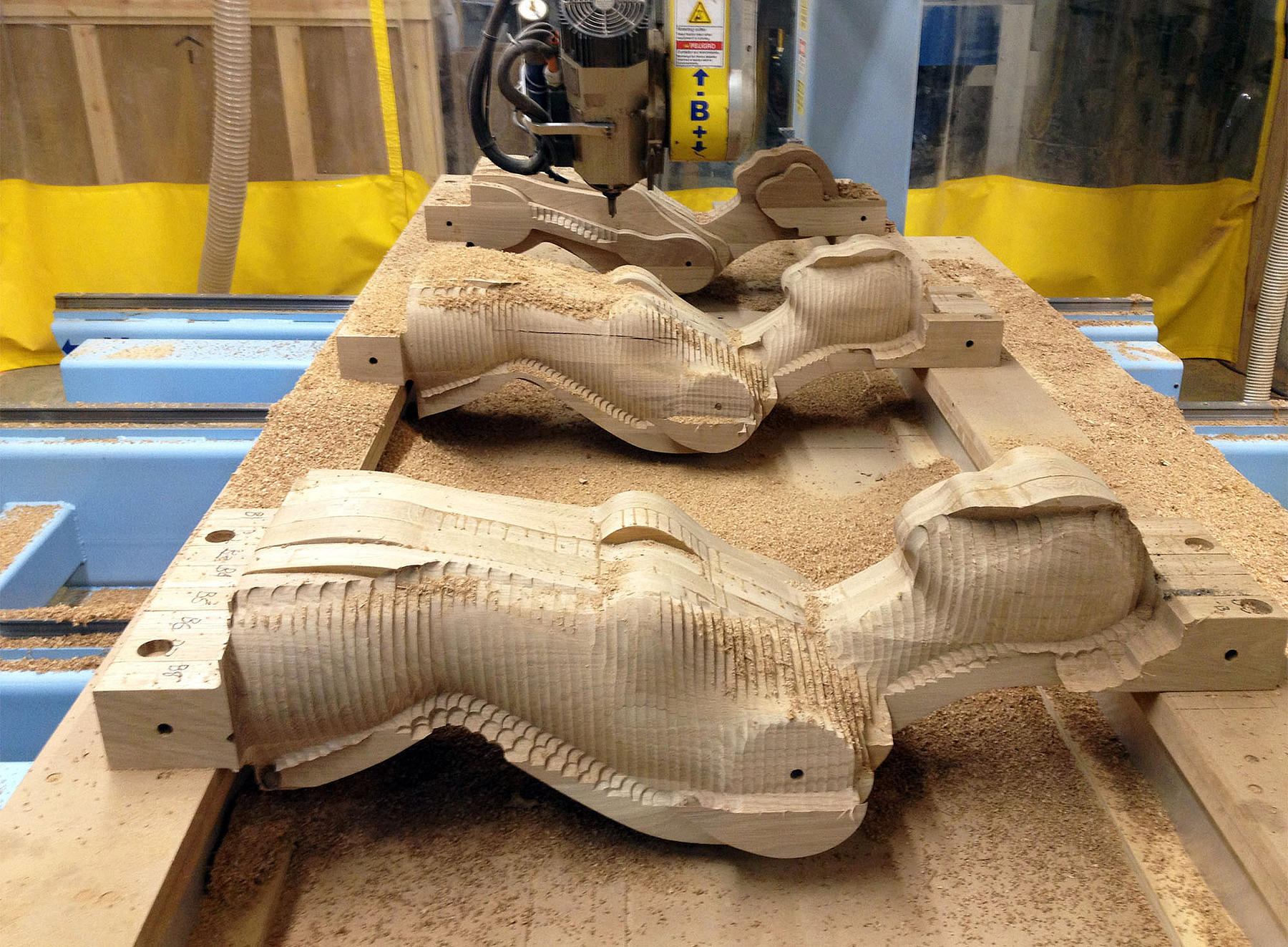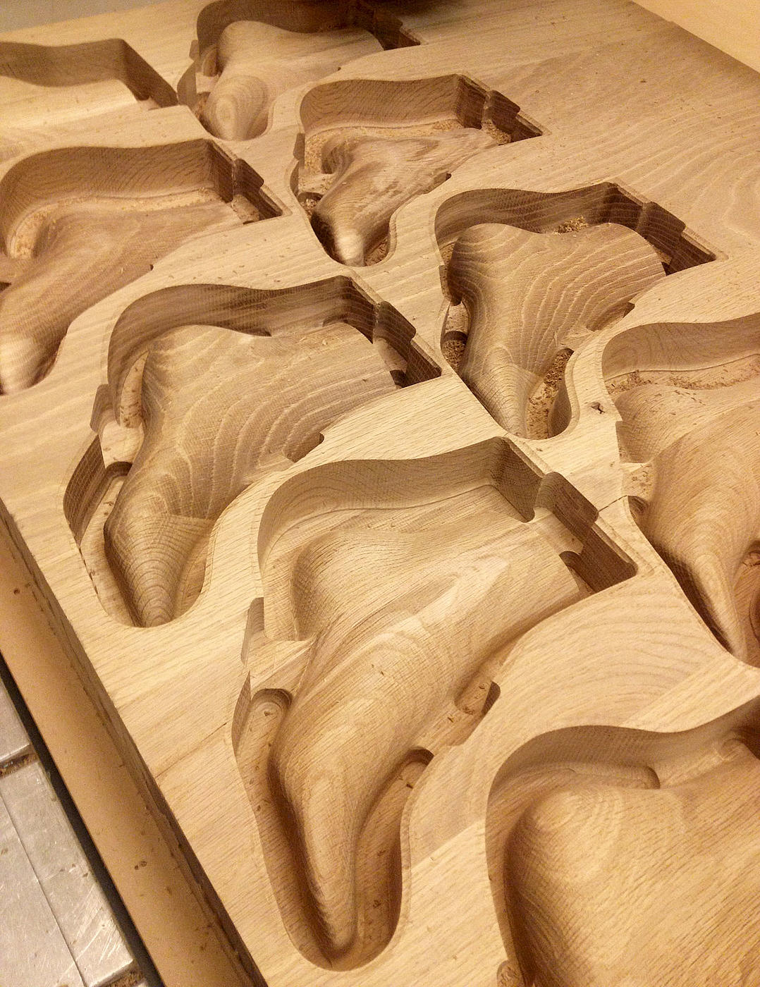 First, singly curved profiles were milled out of 1.7-inch-thick planks of white oak. These profiles were then glued together to create a stepped massing of the bodies. We then milled the segments again using our 5-axis CNC router to create smooth, doubly-curved surfaces.