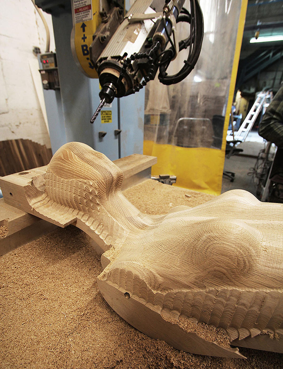Pieces with more detail, like the hands and feet, were created separately using a flip milling technique with large sheets of laminated white oak. We worked with custom stainless steel hardware for the connections at the shoulder and wrist. Each of the milled pieces were then sanded by hand and finished with a water-based lacquer.