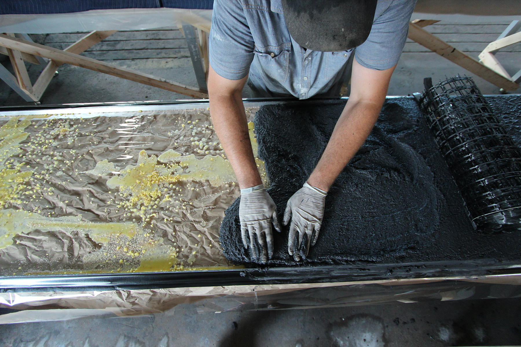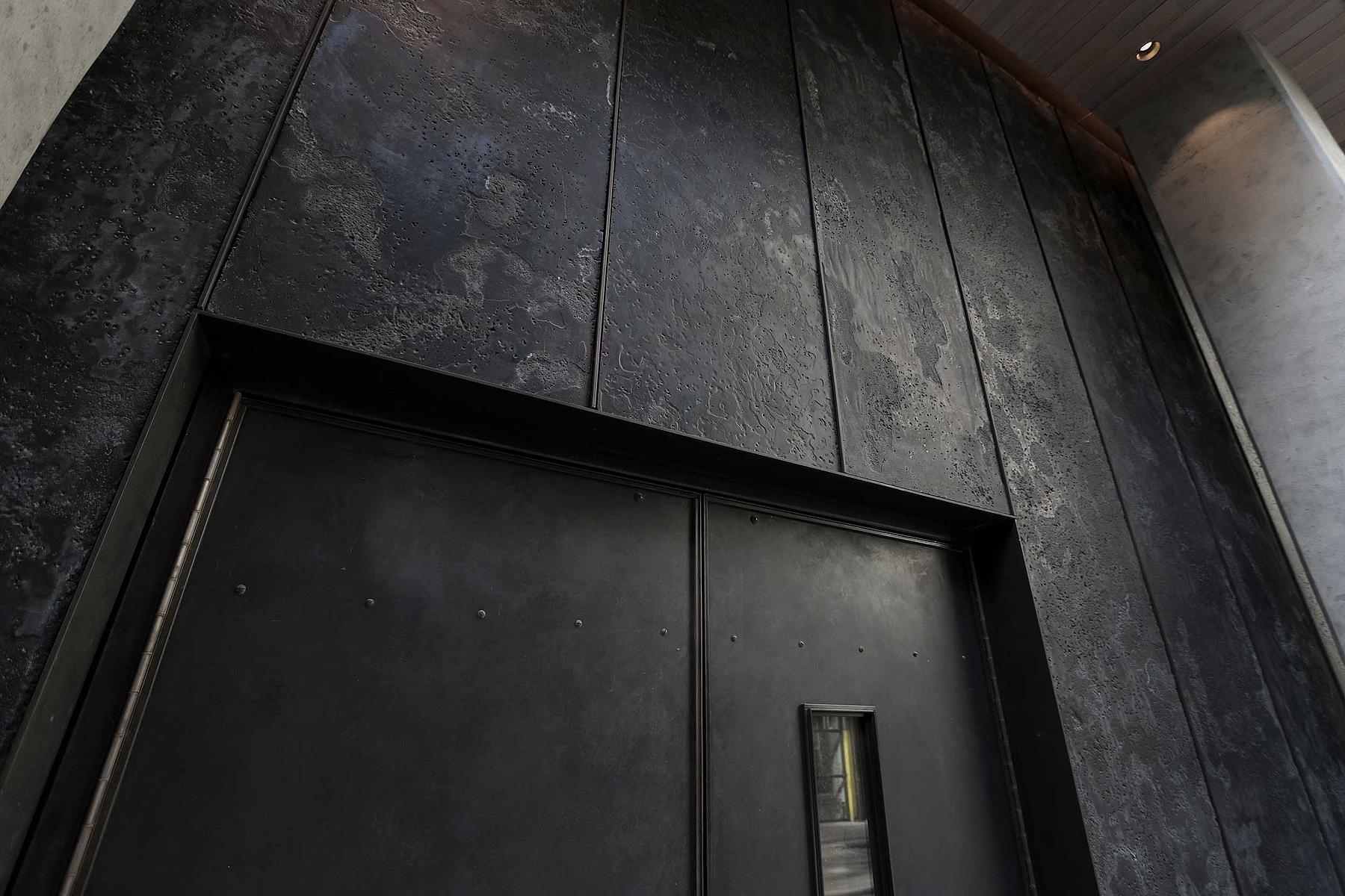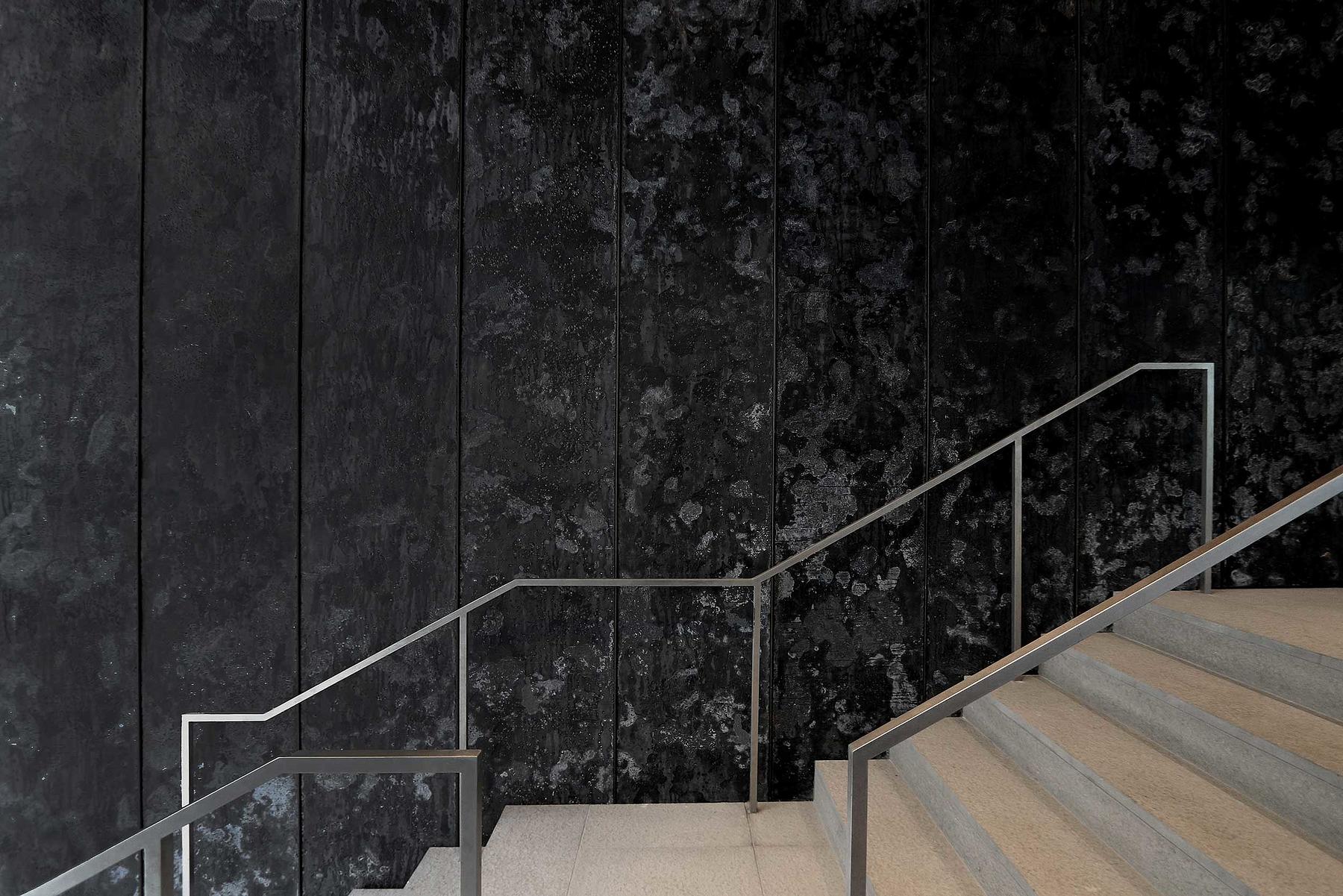 The surface texture was achieved by casting fiber-reinforced concrete against layers of crinkled paper and acetate, with patches of beeswax and salt directly applied to the surface. After curing for a number of days, the 17-ft tall panels were moved to a custom-built oven table, to artfully melt away the wax and extract most of the salt from the face of the panels. As a result, residual patches of crystallized salt remain embedded in the surface to create accents on the dark concrete.