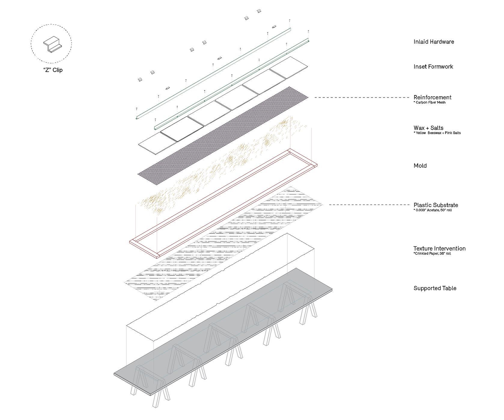 Experimenting with a variety of treatments and techniques, we worked through a series of iterative material samples that explored the aesthetics of erosion and encaustic. Ultimately, we arrived at a casting technique which creates an evenly distributed pattern and coloration across the field of panels while also allowing for each component to have its own subtle variations.