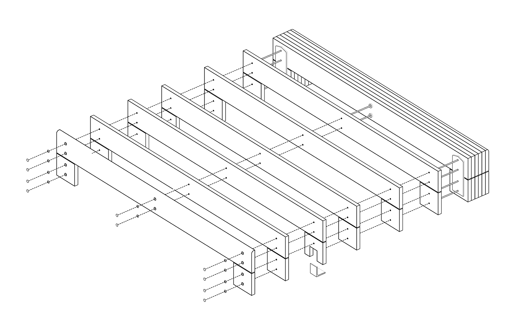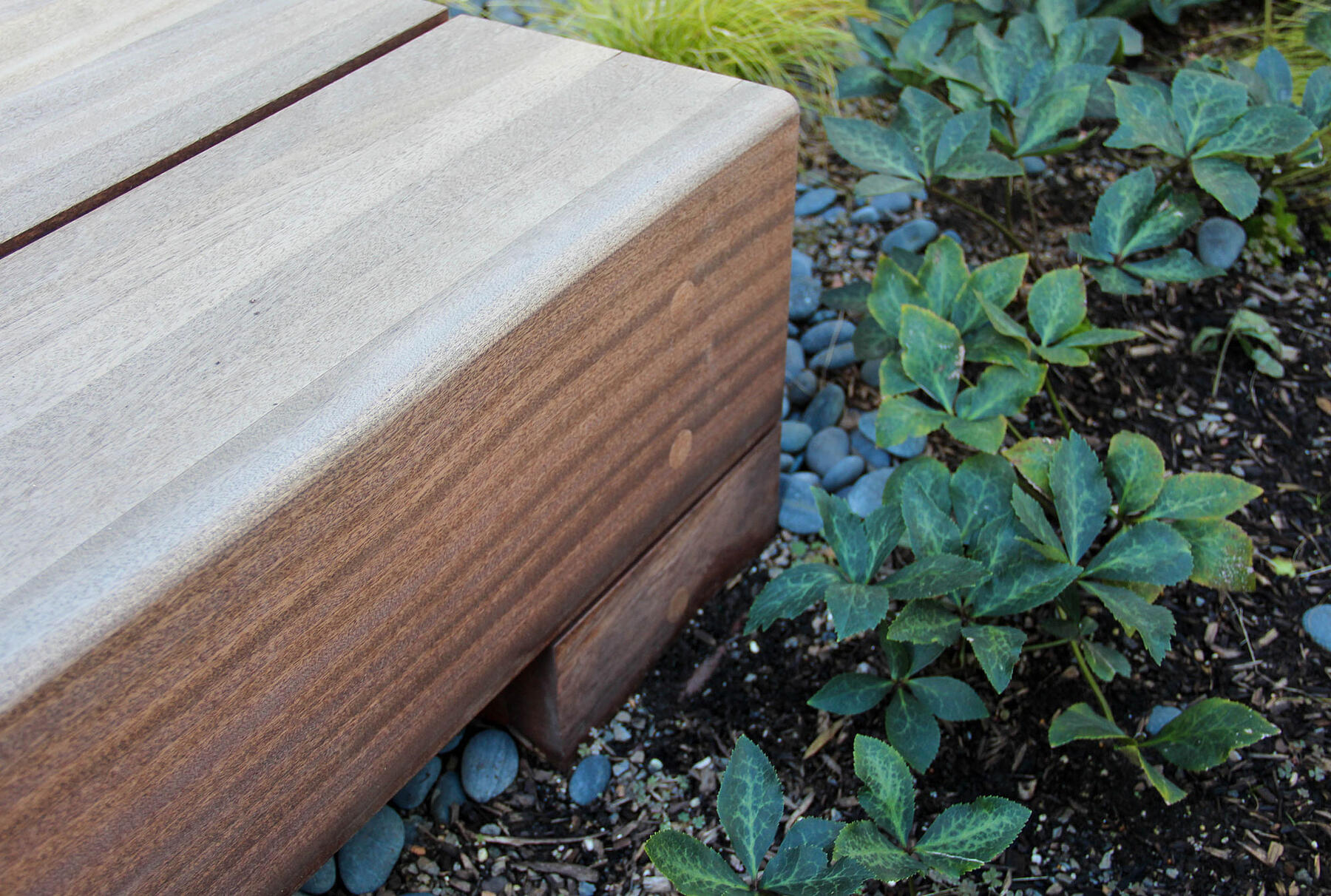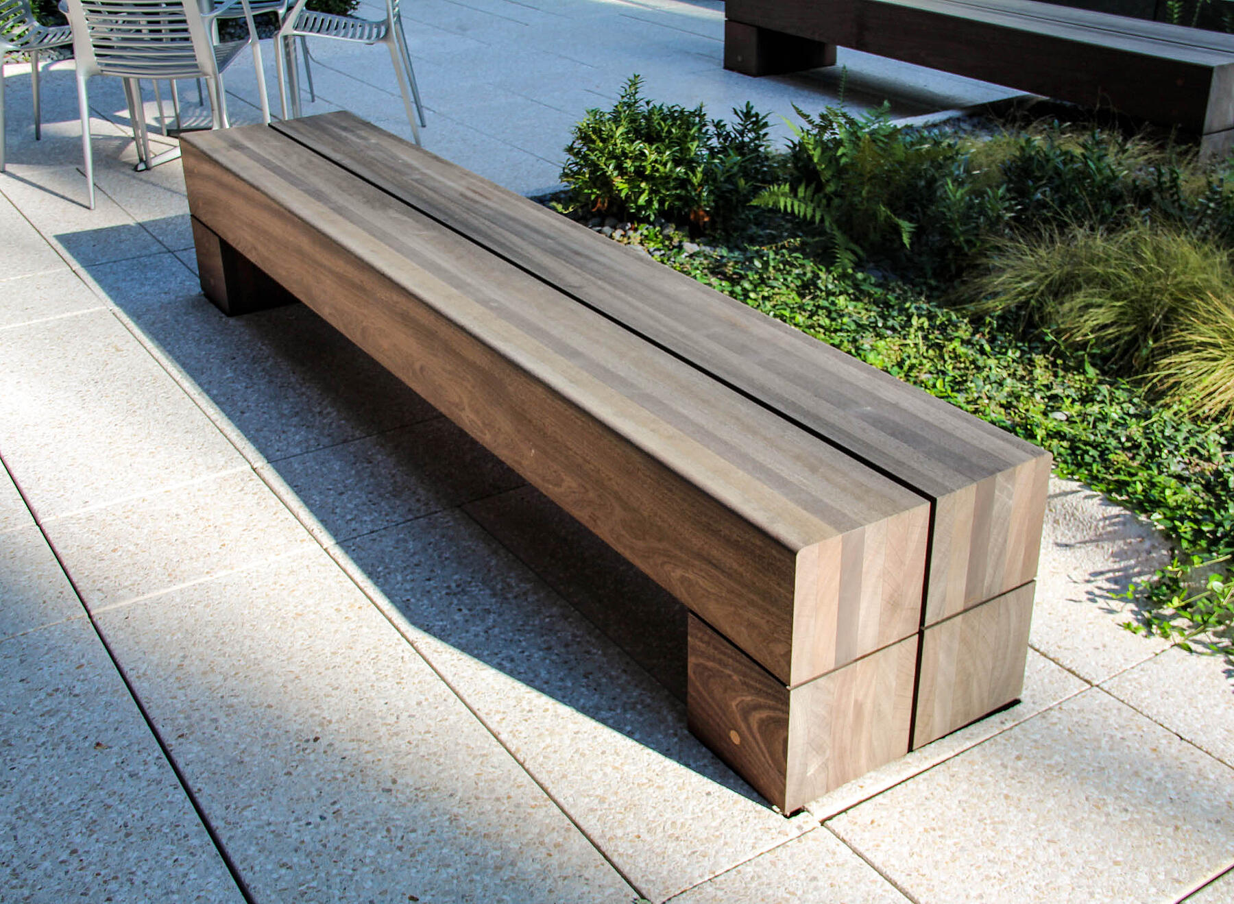 Working with the design team, we recommended a durable hardwood and refined design details in order to make the best use of the lumber. Each bench is over nine feet long and, while they appear monolithic, the large spans are made from smaller boards which were carefully laminated and grouped into four sections. Concealed bolts and steel plates tie the four sections together and anchor the bench to the ground. Because each section was CNC-milled to precise dimensions and taken back for resurfacing between stages, the overall form is even more stable. Finally, the wood is protected with an oil finish that makes it easier to maintain and repair over time.