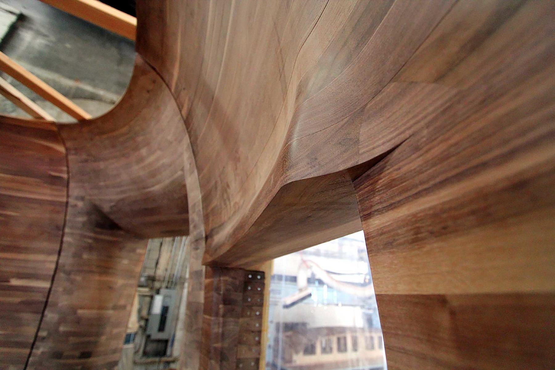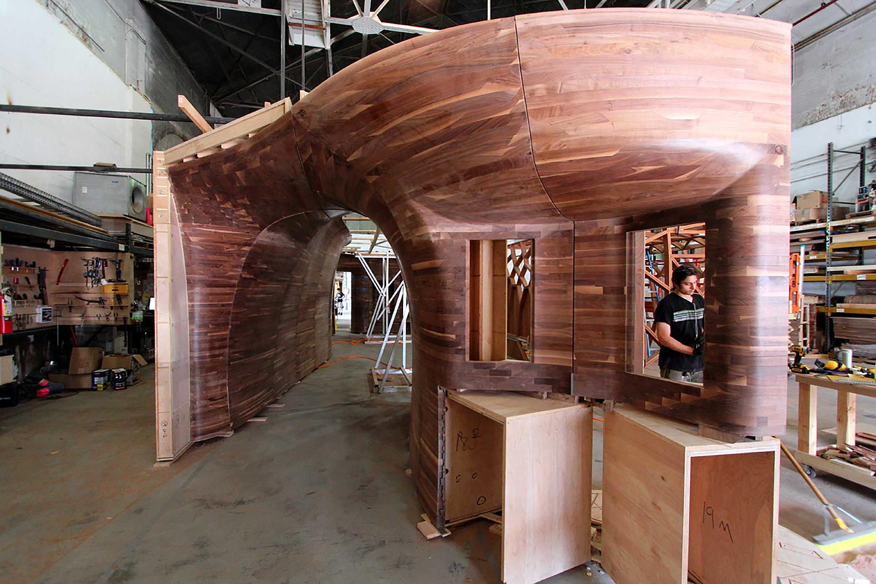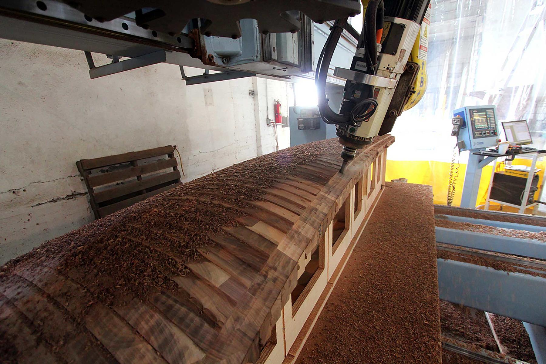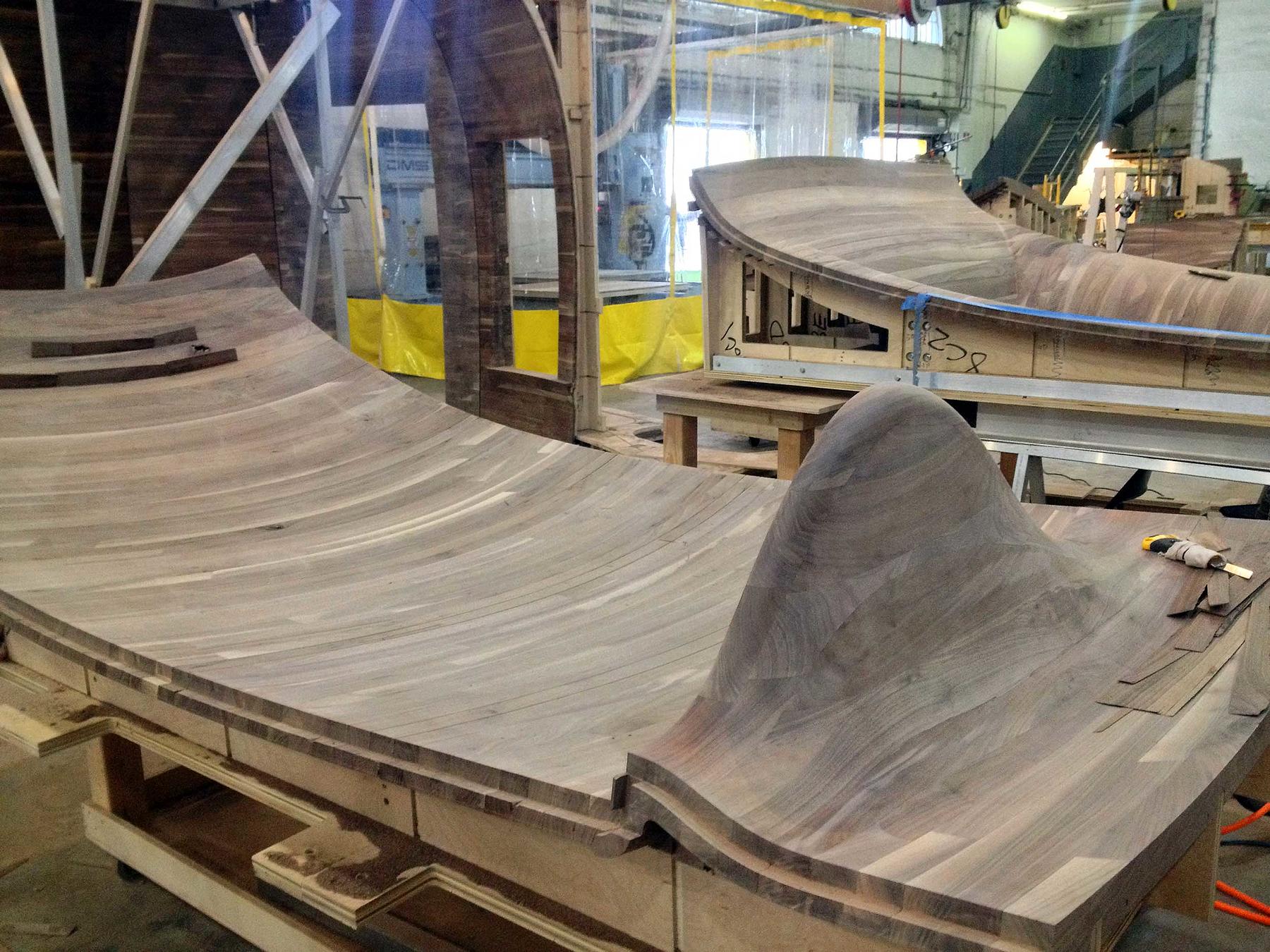 Made out of solid wood, the panels are nine feet tall and range from three to eight feet in width. Translating architectural drawings into engineering and fabrication specifications, we leveraged 3D modeling tools and our 5-axis mill to make the flowing contours of the design a reality.