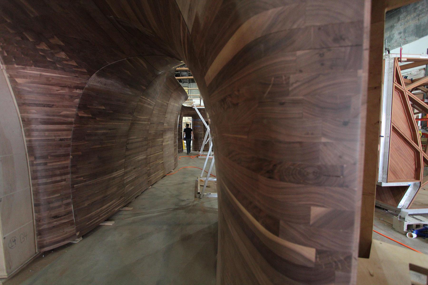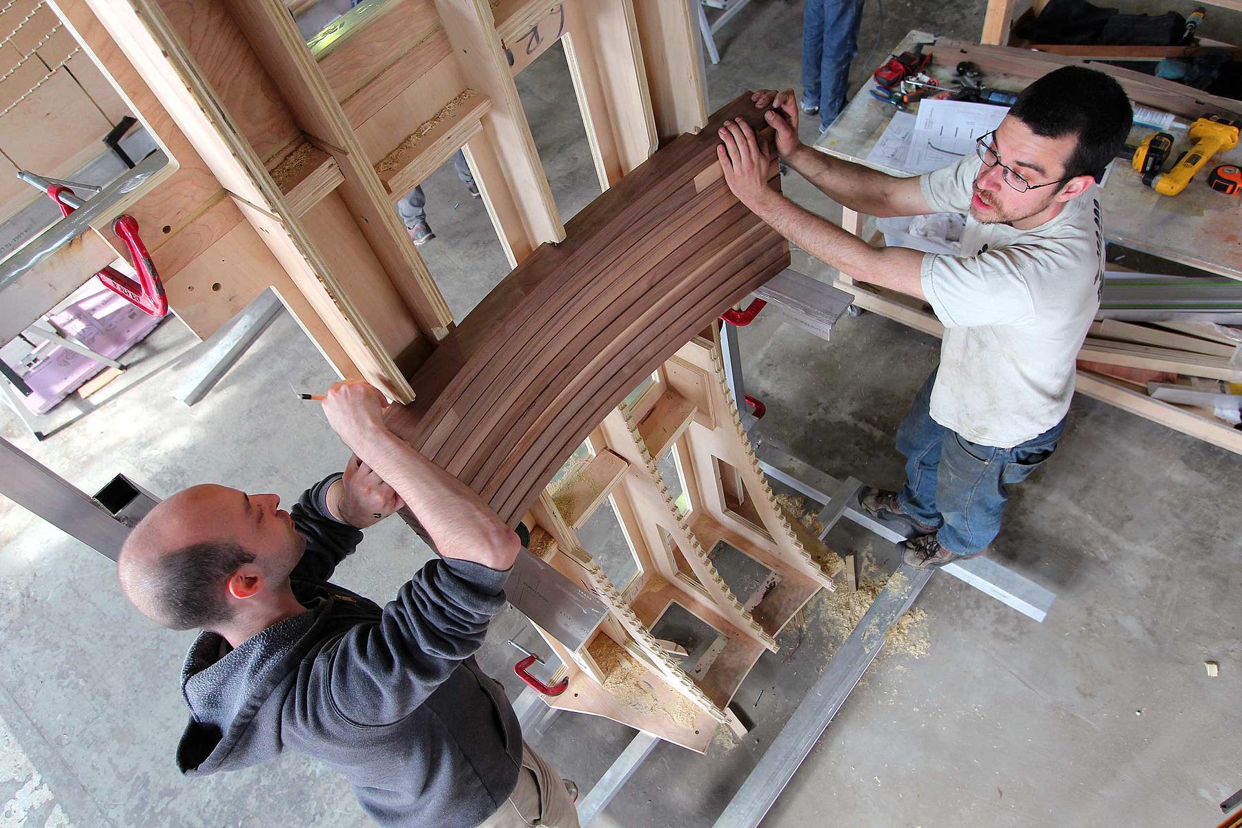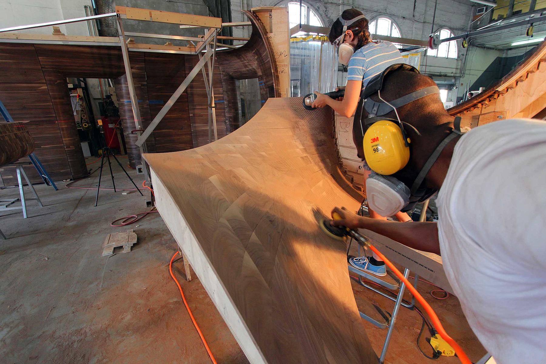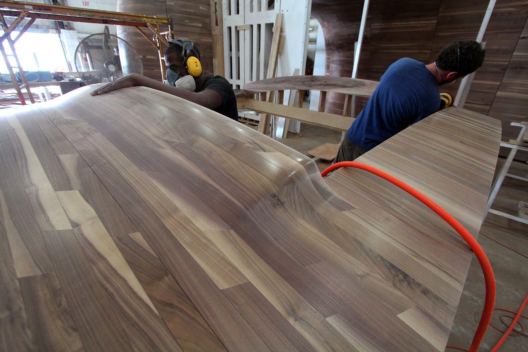Made out of solid wood, the panels are nine feet tall and range from three to eight feet in width. Translating architectural drawings into engineering and fabrication specifications, we leveraged 3D modeling tools and our 5-axis mill to make the flowing contours of the design a reality.