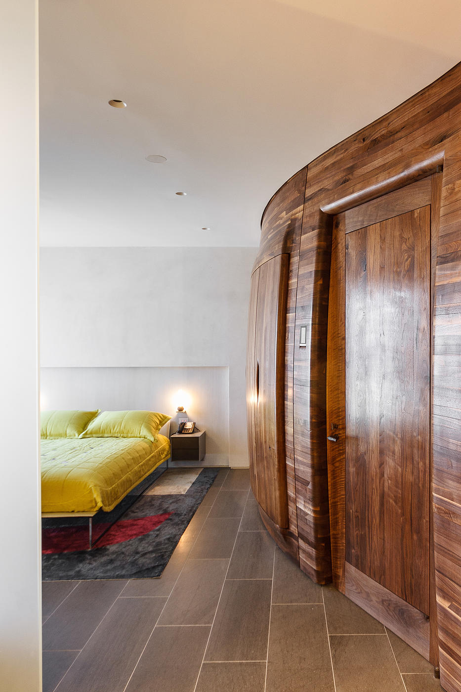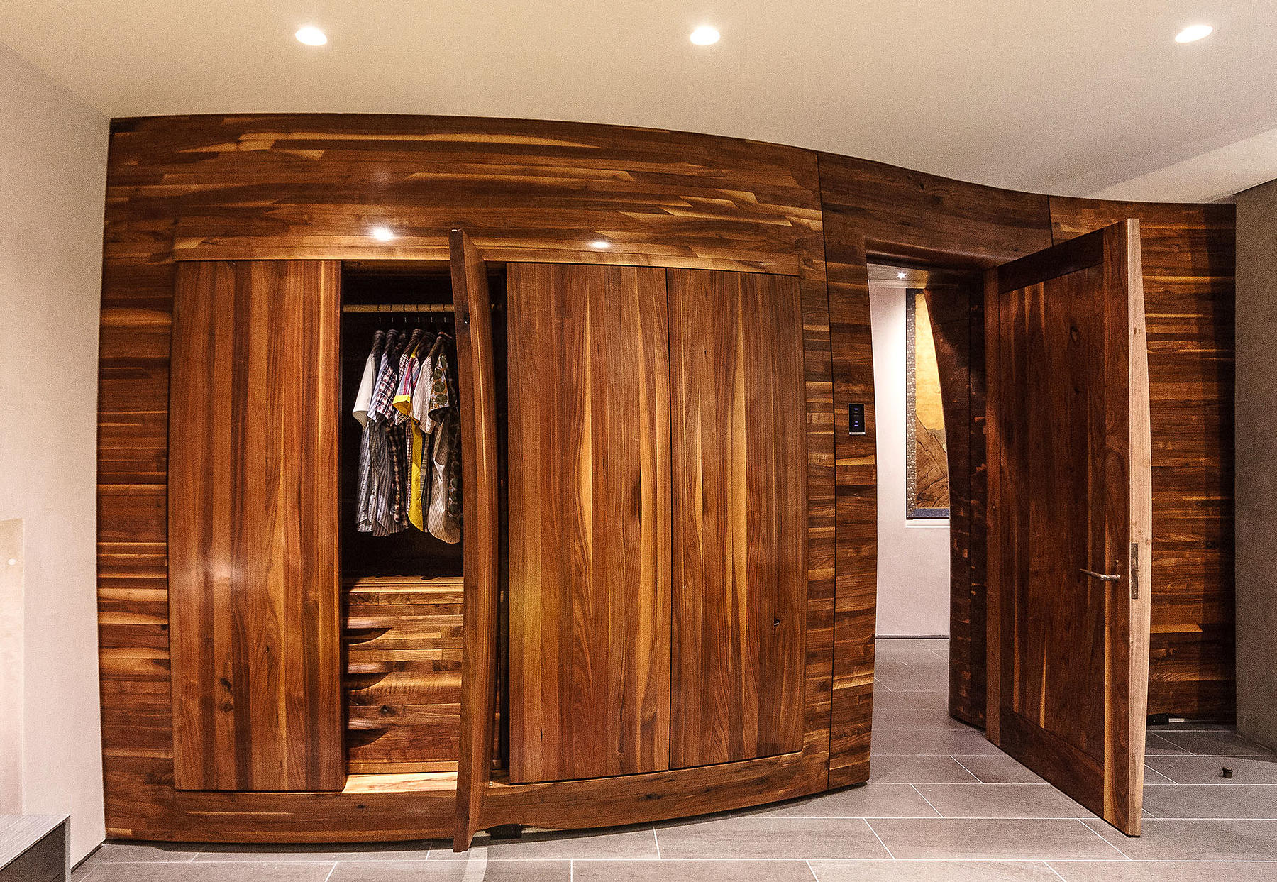 The 35 unique panels create a dynamic, but also multi-functional interior, integrating closets and cabinets, enveloping appliances and articulating benches, doorways and surfaces throughout the space.