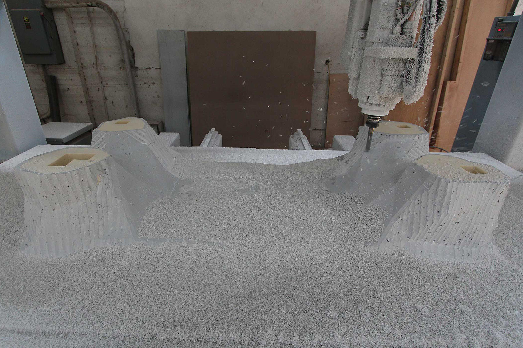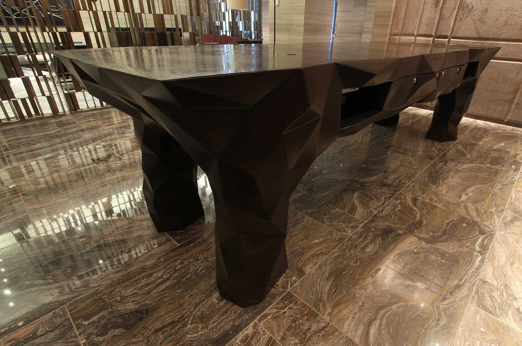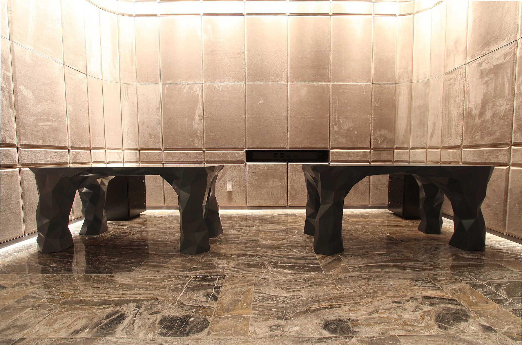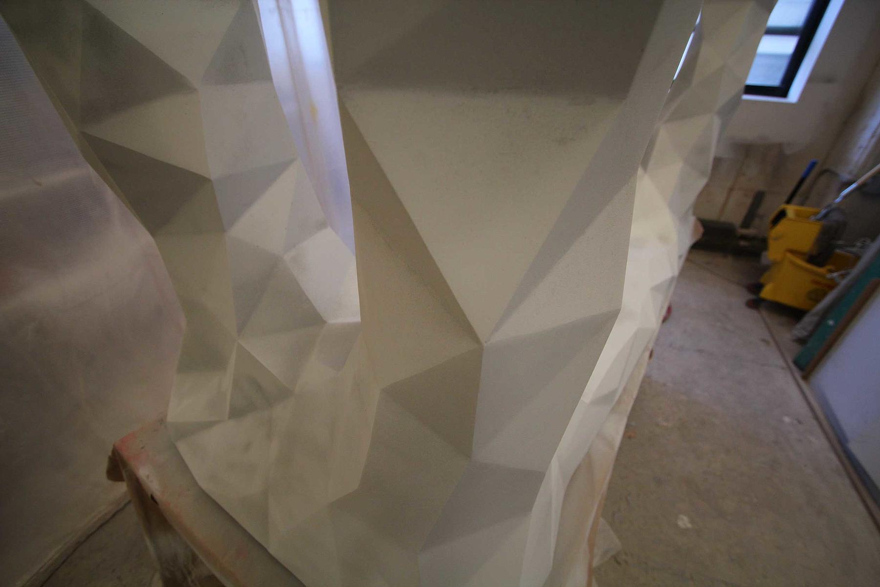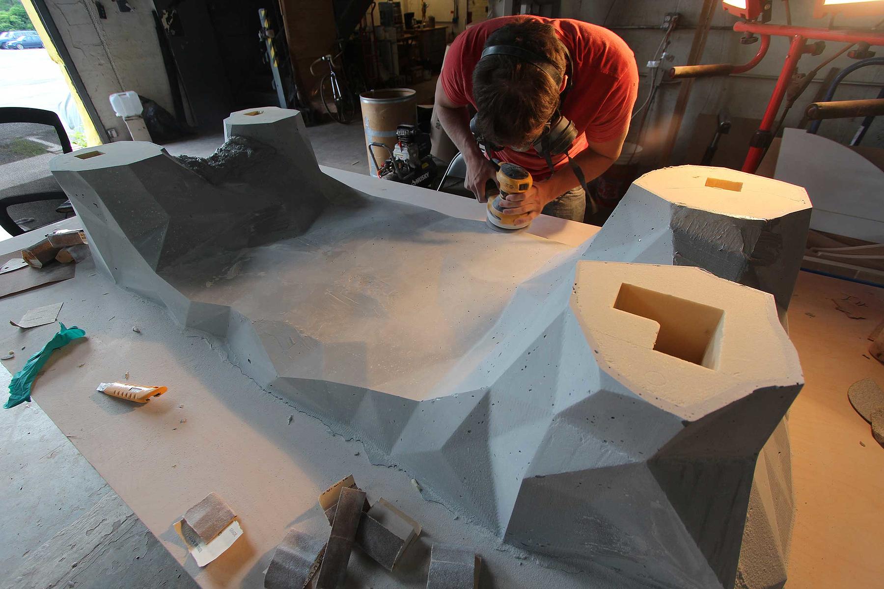 In terms of process, the core of the desks is a CNC-milled polyurethane foam with an internal welded aluminum frame. The foam was then coated with a 1/2 inch-thick layer of a machinable resin and then CNC-milled a second time with the final faceted geometry, resulting in a 1/4 inch-thick resin hardcoat. The desks were then coated with a thin layer of a composite spray-on steel and finished with a black patina.