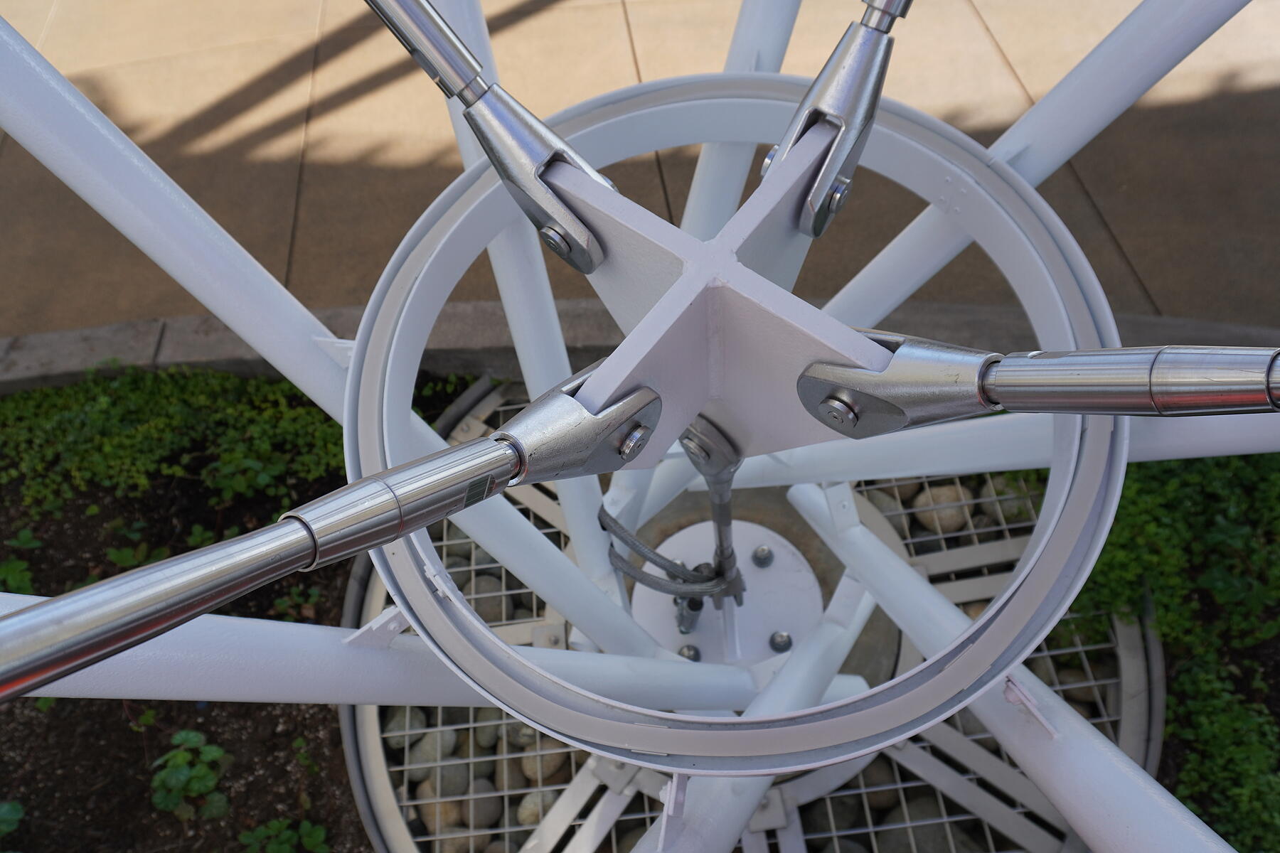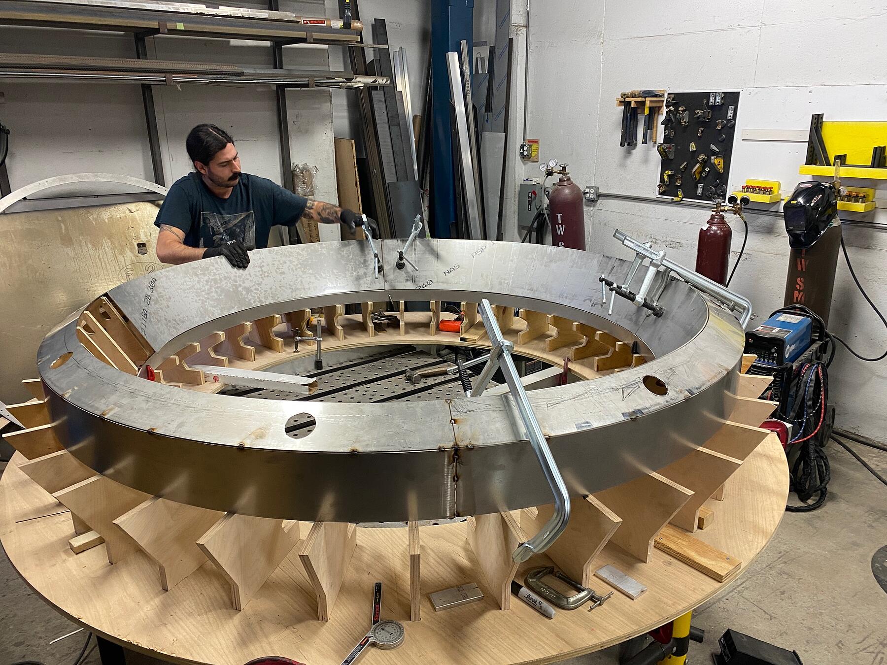 Leveraging our expertise in high tolerance fabrication, waterjet cut and rolled stainless steel sheets were welded into 8-foot wide circular gutters. Each gutter was outfitted with eight downward-bending spouts, guiding the water to its intended destination. A robust two-part high-build paint finish was coated in-house so that the water diverters would match the rest of the canopy structure.