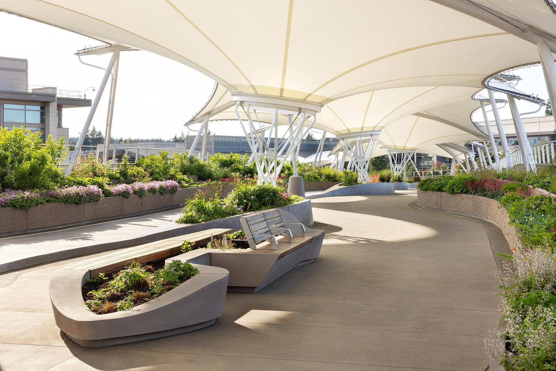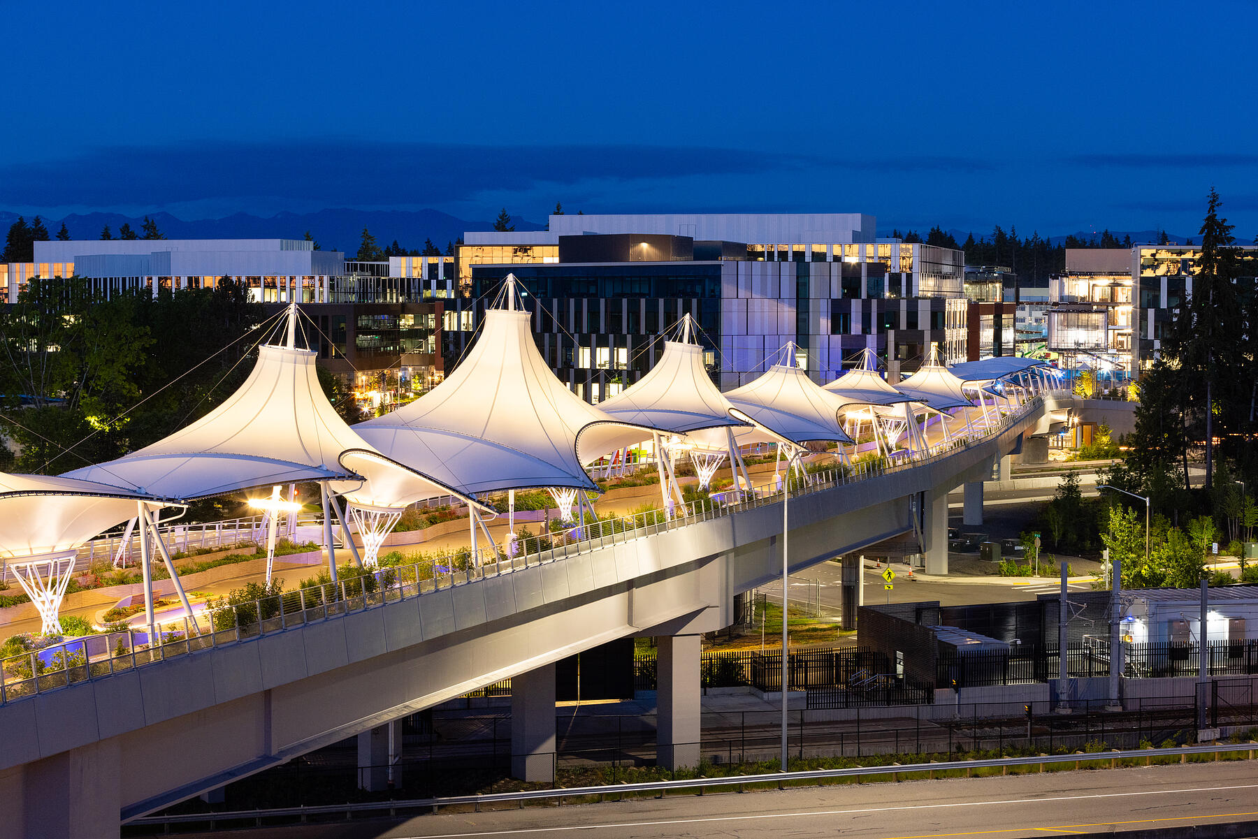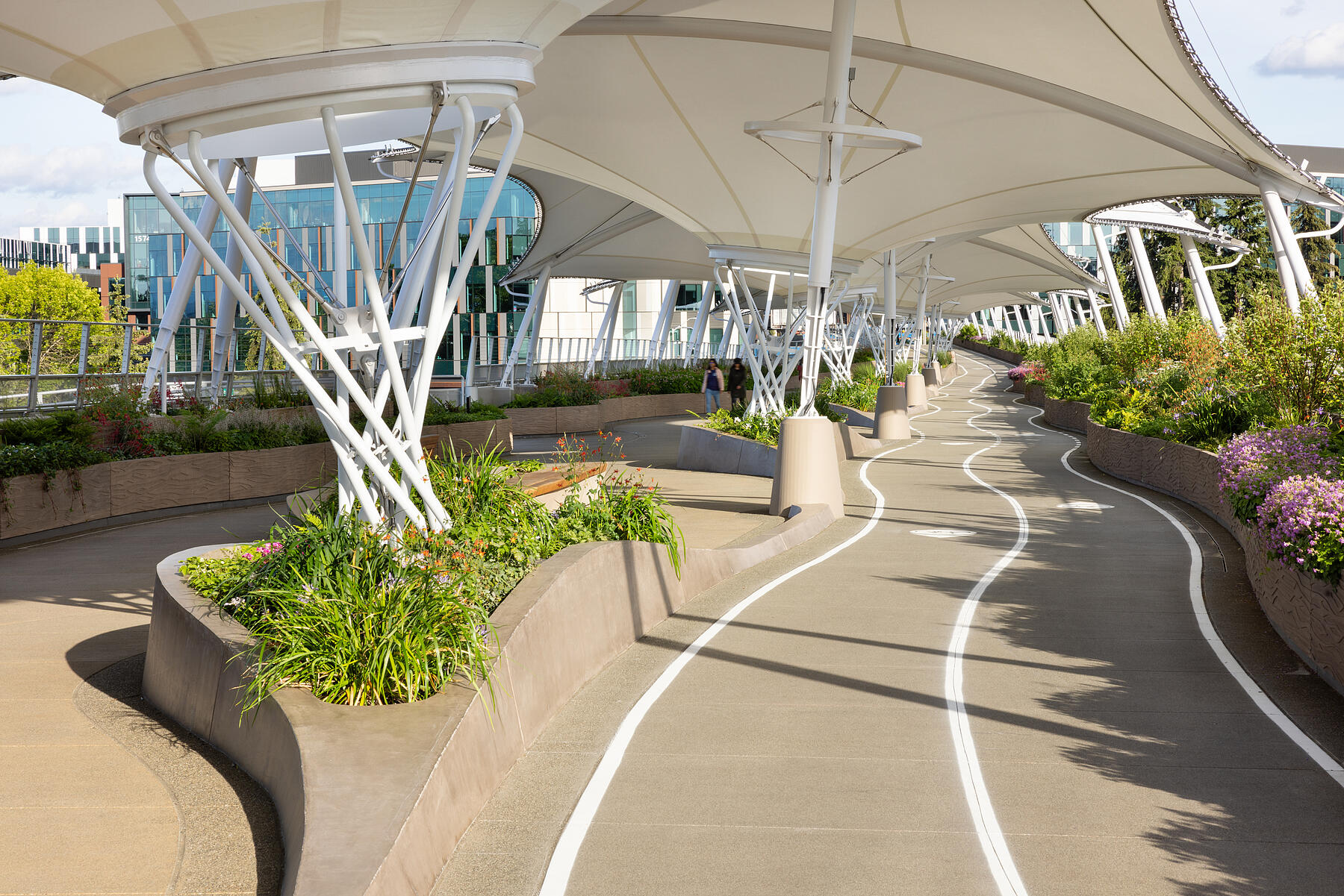 Nestled in the center of Redmond, WA, on the Microsoft Campus, the RTS Pedestrian Bridge displays forward-thinking urban planning and design. Completed in March 2024, this 1,100-foot-long bridge spans across State Route 520 and local streets, seamlessly connecting the east and west halves of Microsoft’s 500-acre campus and providing a vital link to Sound Transit’s light rail station. Designed by AECOM and FTL, constructed by Kiewit and HNTB, and commissioned by Microsoft, the bridge provides a covered, weather-protected route for pedestrians and cyclists, integrating public seating and an abundance of greenery.