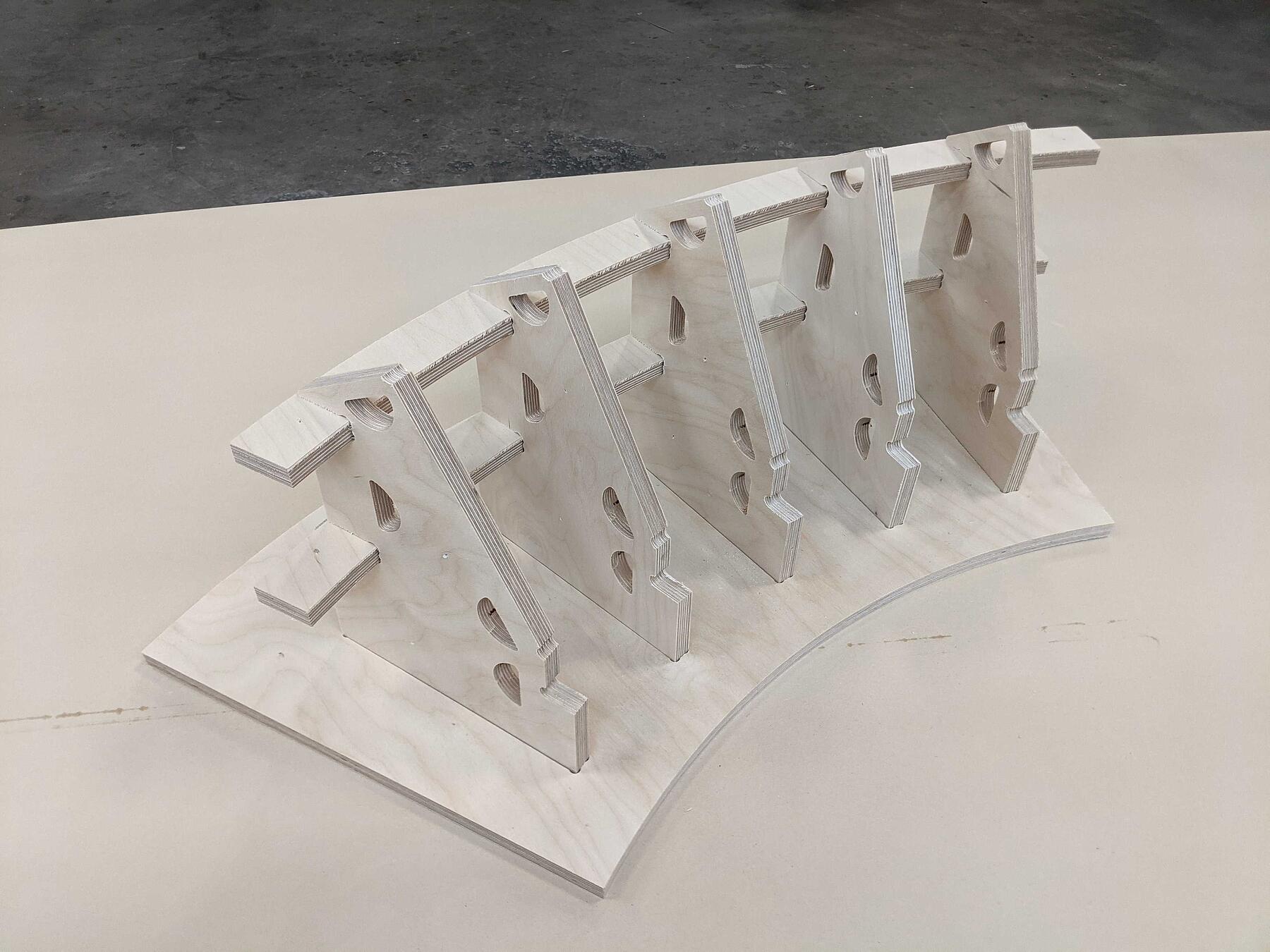 Our contribution to this project centered on the fabrication of eight custom water diverters. These essential components play a critical role in the bridge's design, ensuring that rainwater is effectively channeled away from the canopy, through the diverters, and into the planters below.