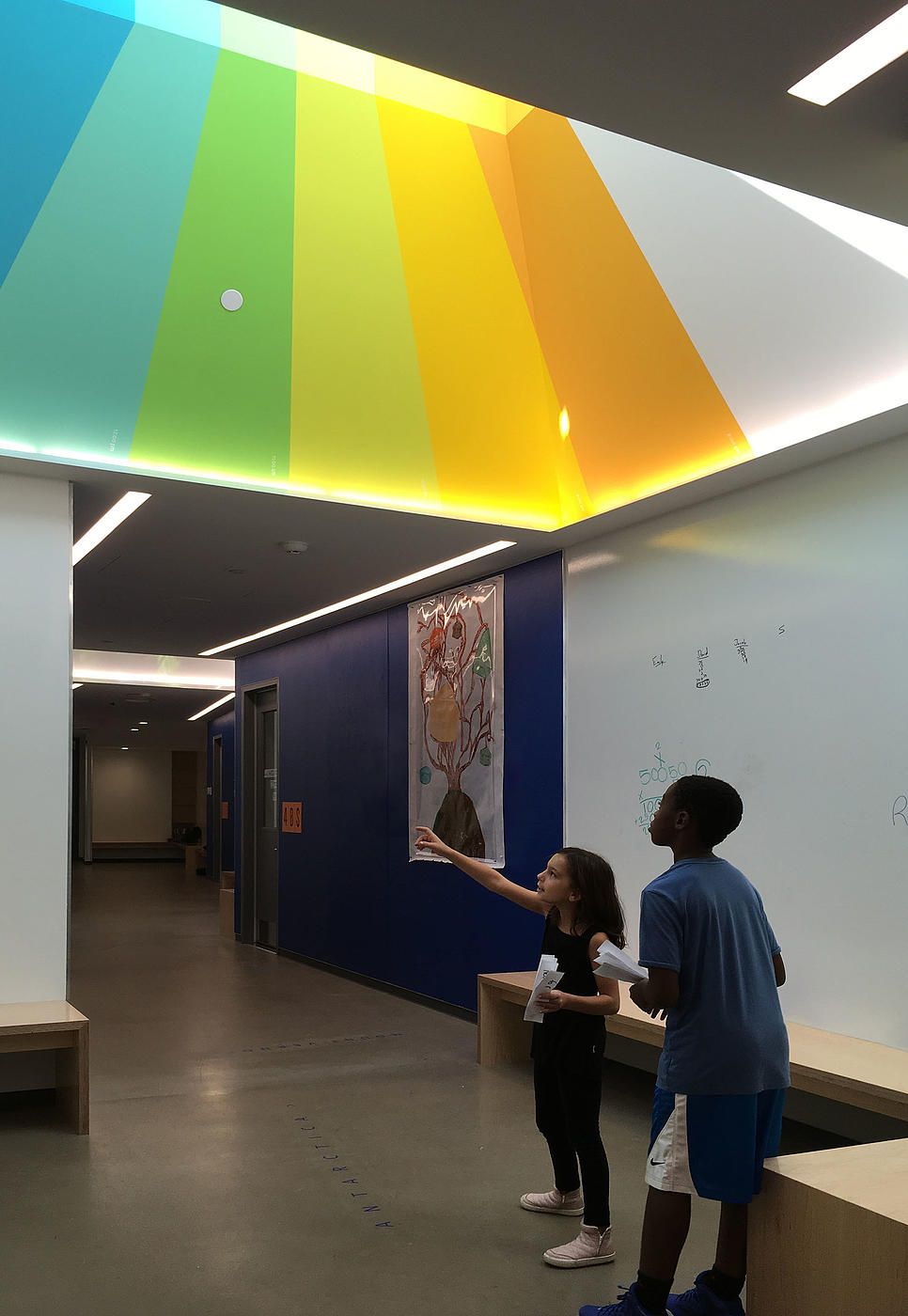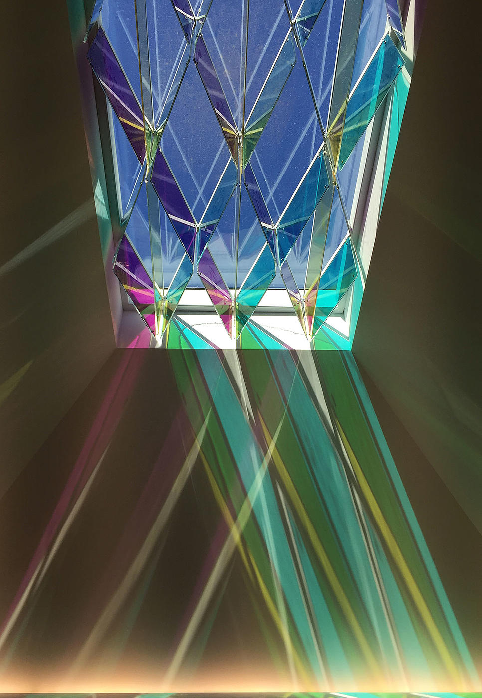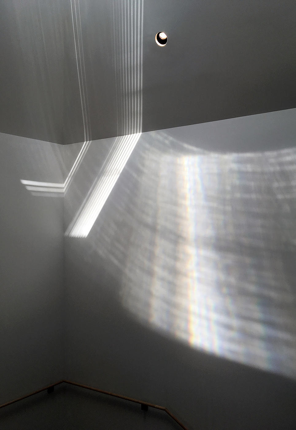 Another skylight is comprised of acrylic prisms suspended in a white frame. The refracted light casts a shifting color spectrum on the walls. A third skylight screen uses a mirrored panel to reflect a beam of light onto the upper walls, where painted graphics create a sundial.