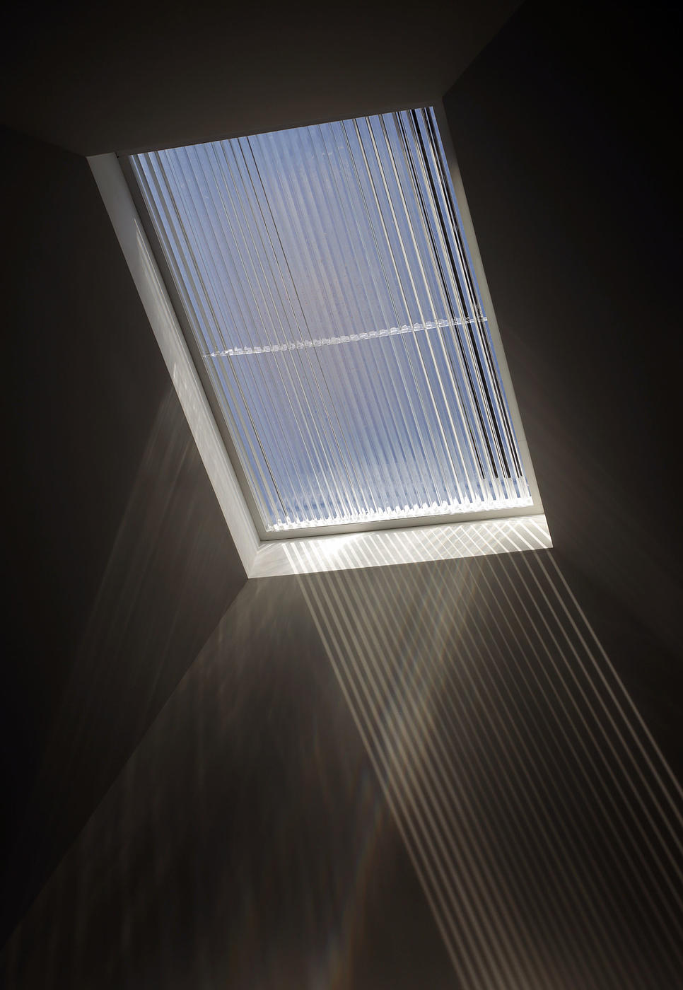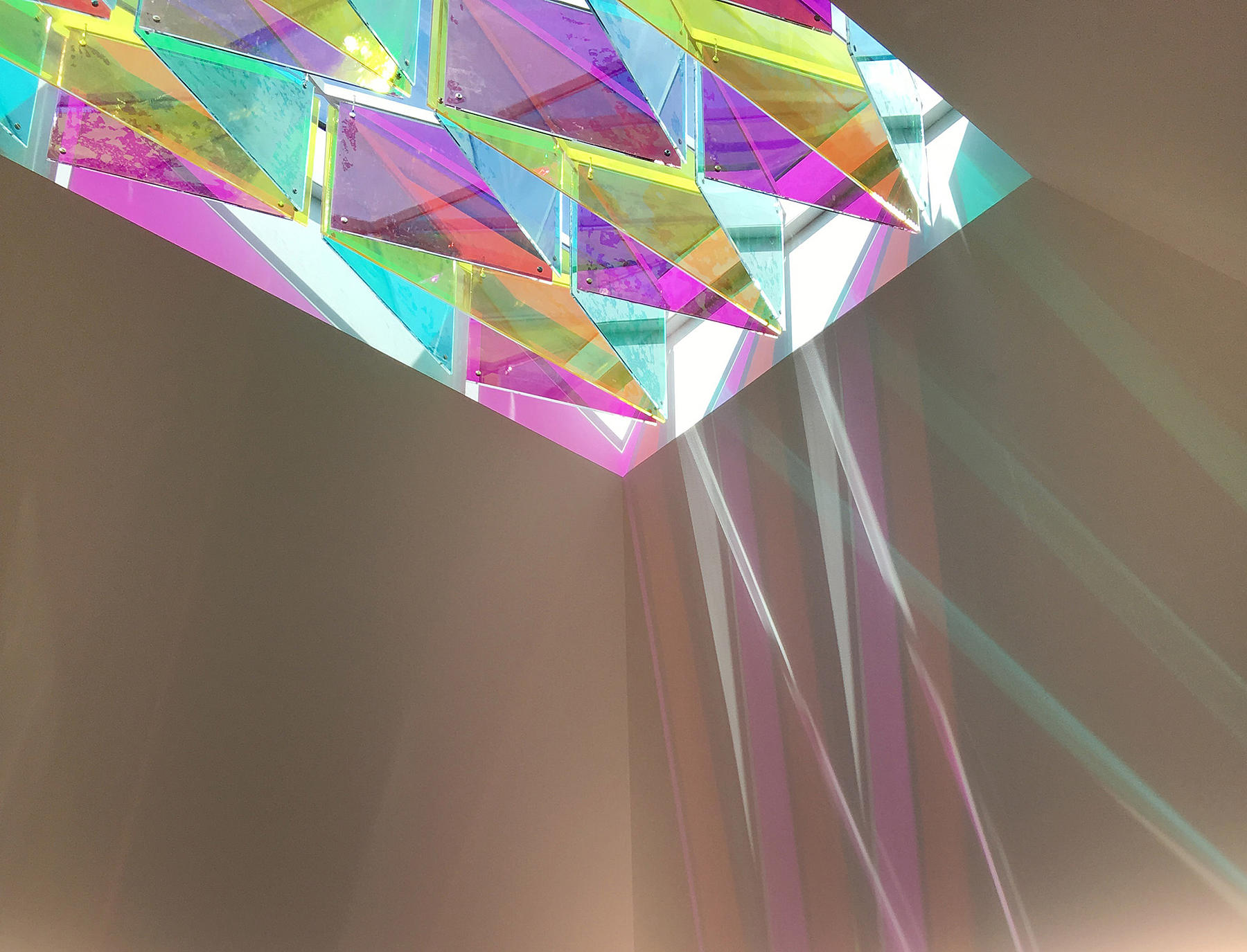 The first skylight screen is a series of hanging acrylic panels in cyan, magenta and yellow. Sunlight filters through the pieces coloring the space below. Oriented at varying angles, the panels catch the sun differently throughout the day—casting a green light in the morning towards red in the afternoon.