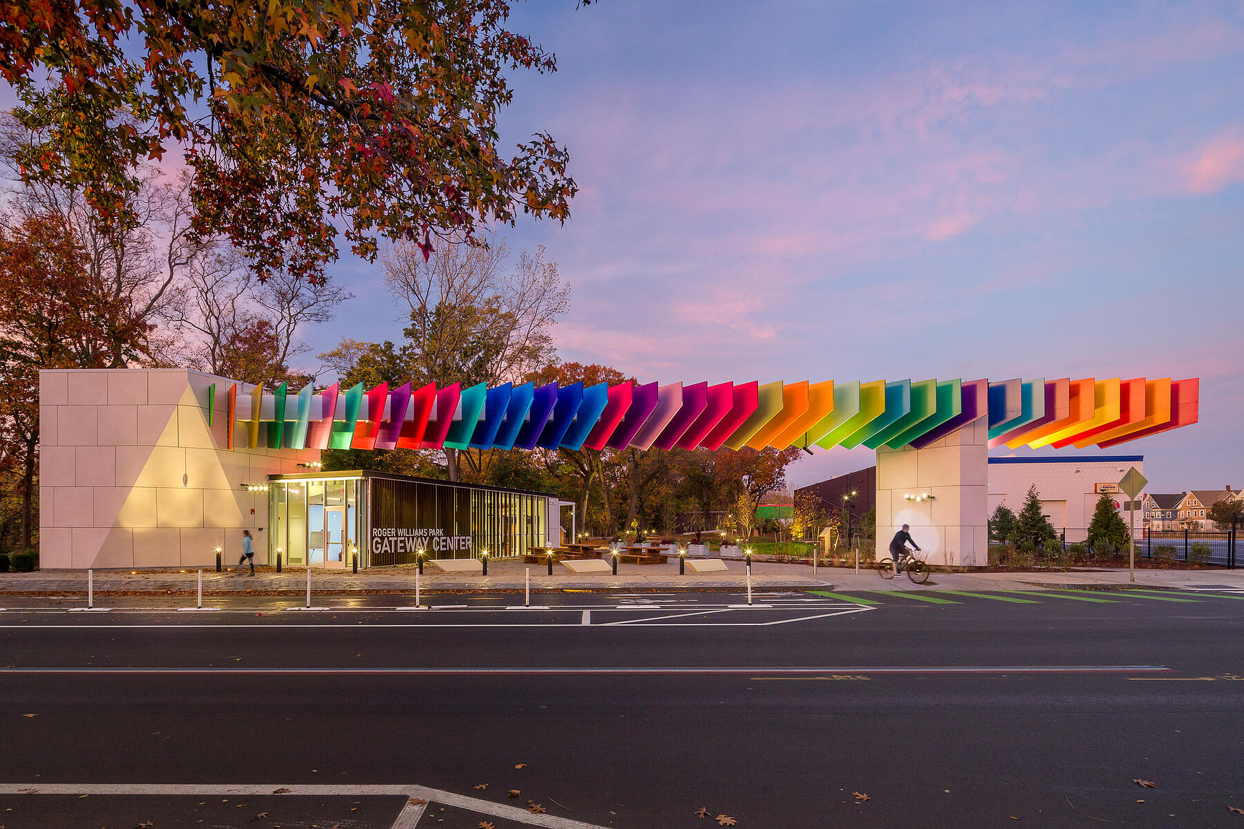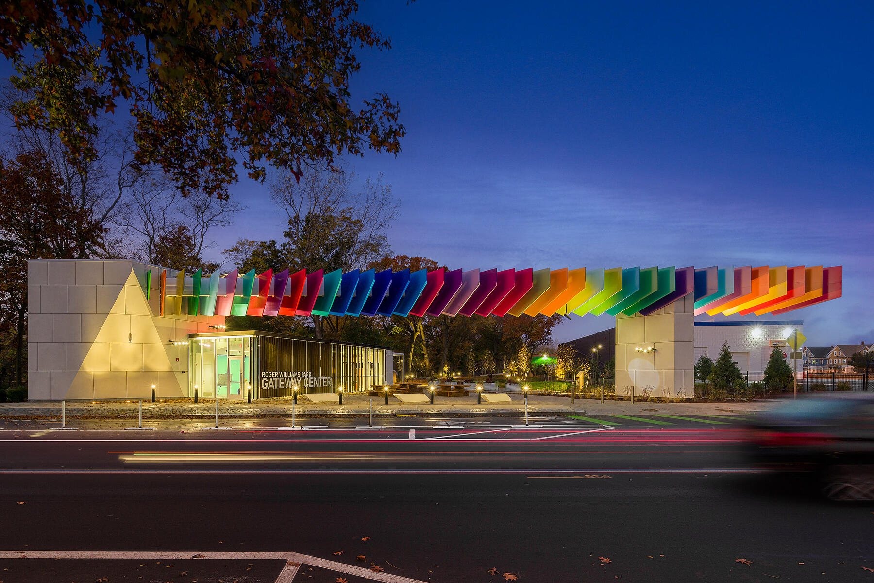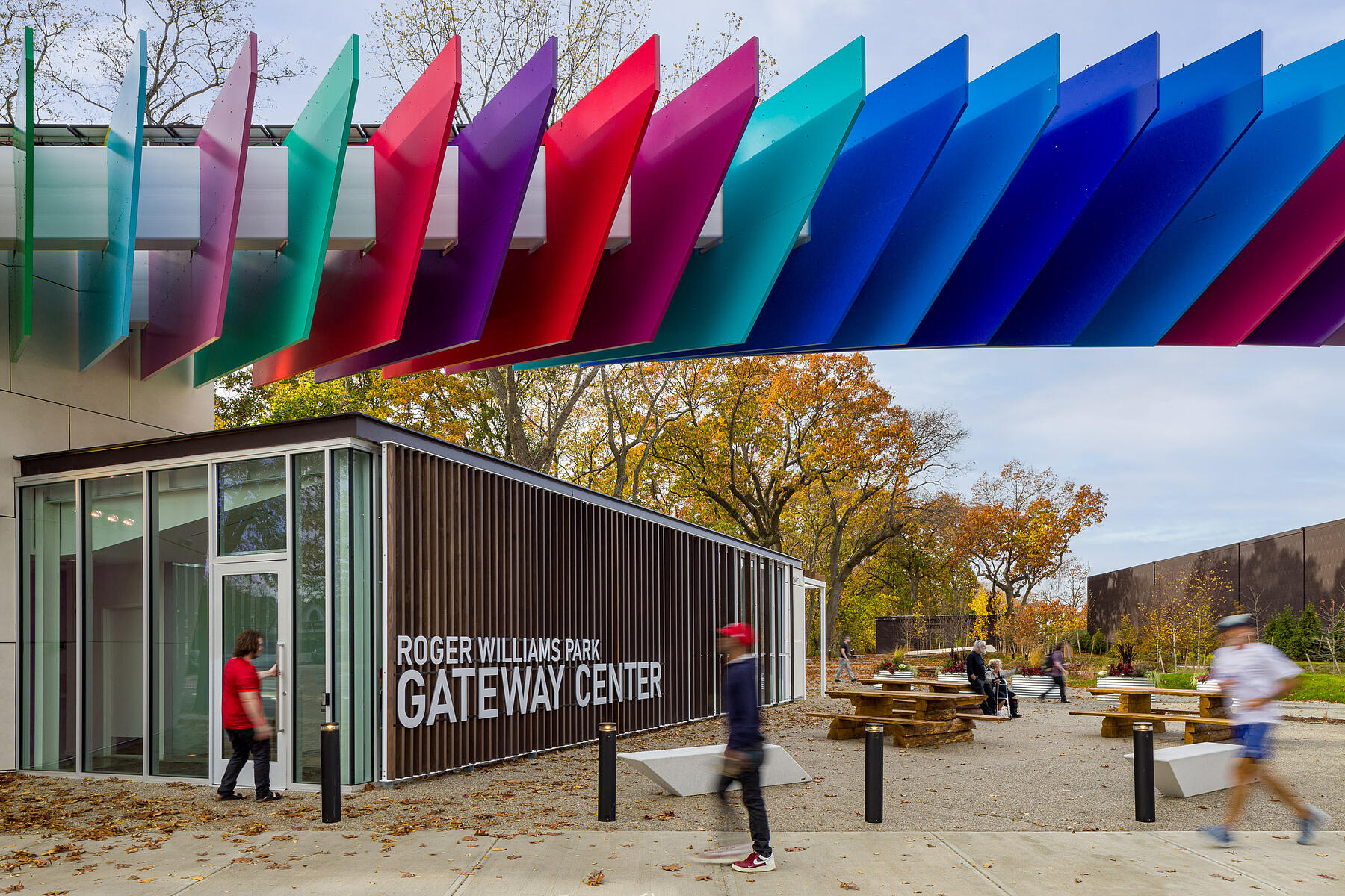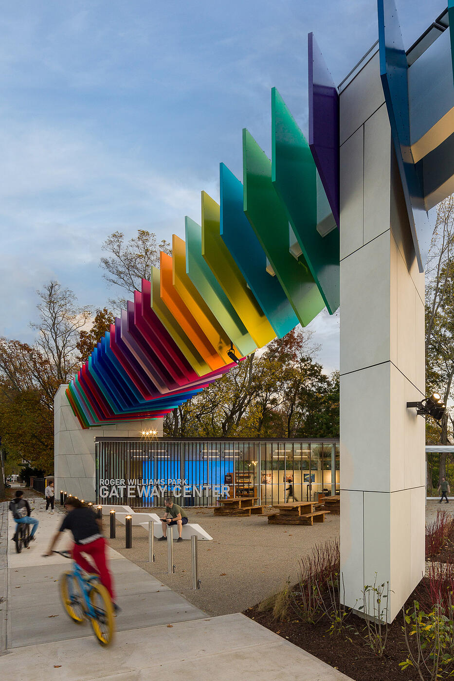 Working in collaboration with INFORM Studio, designers of the Roger Williams Park Gateway Center, we fabricated an entrance canopy of vibrantly colored aluminum fins that help welcome visitors and residents of the surrounding neighborhood to this valuable public space in Providence, RI.