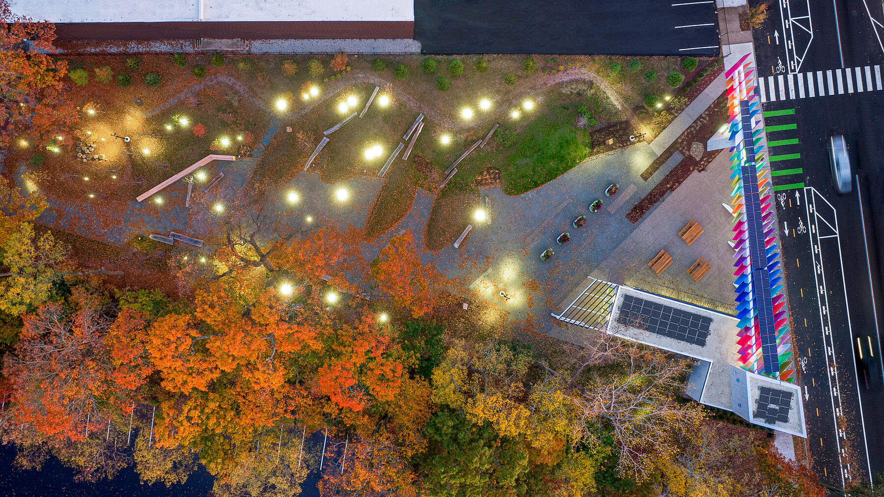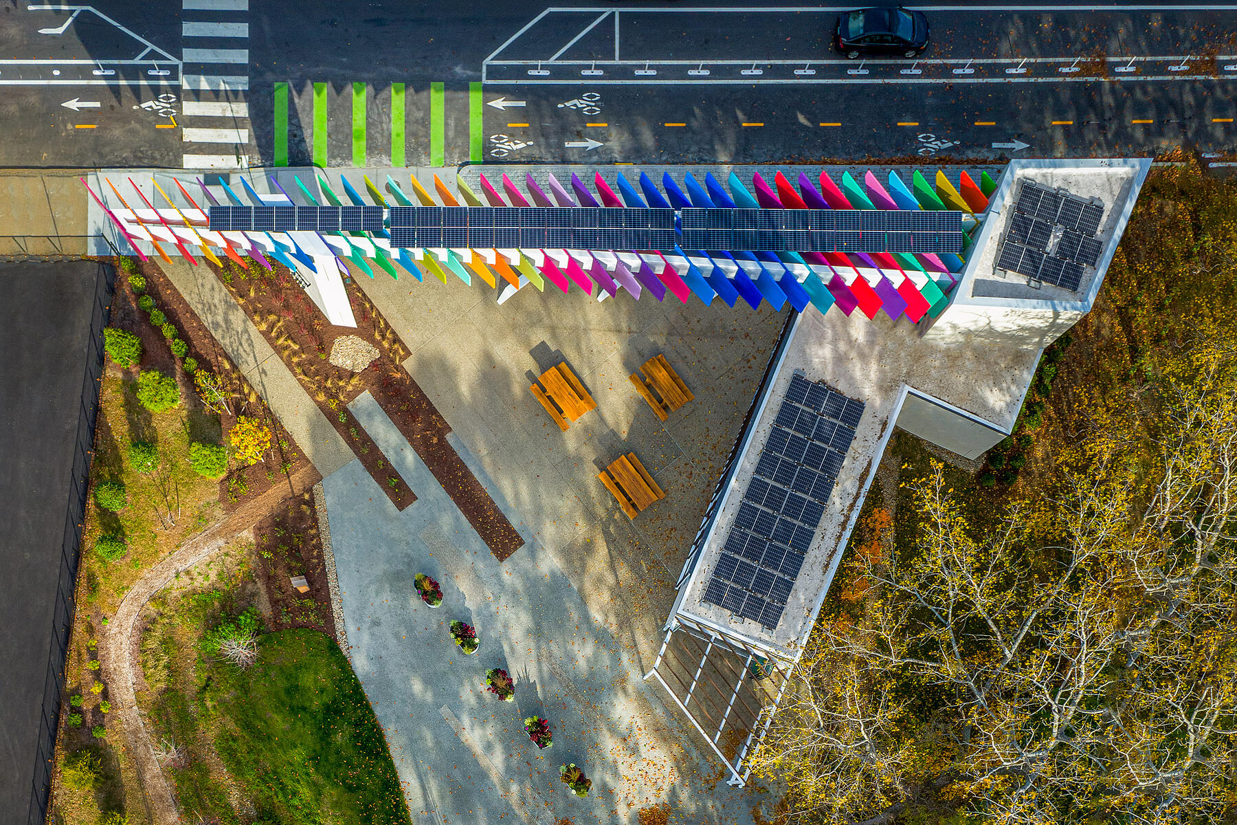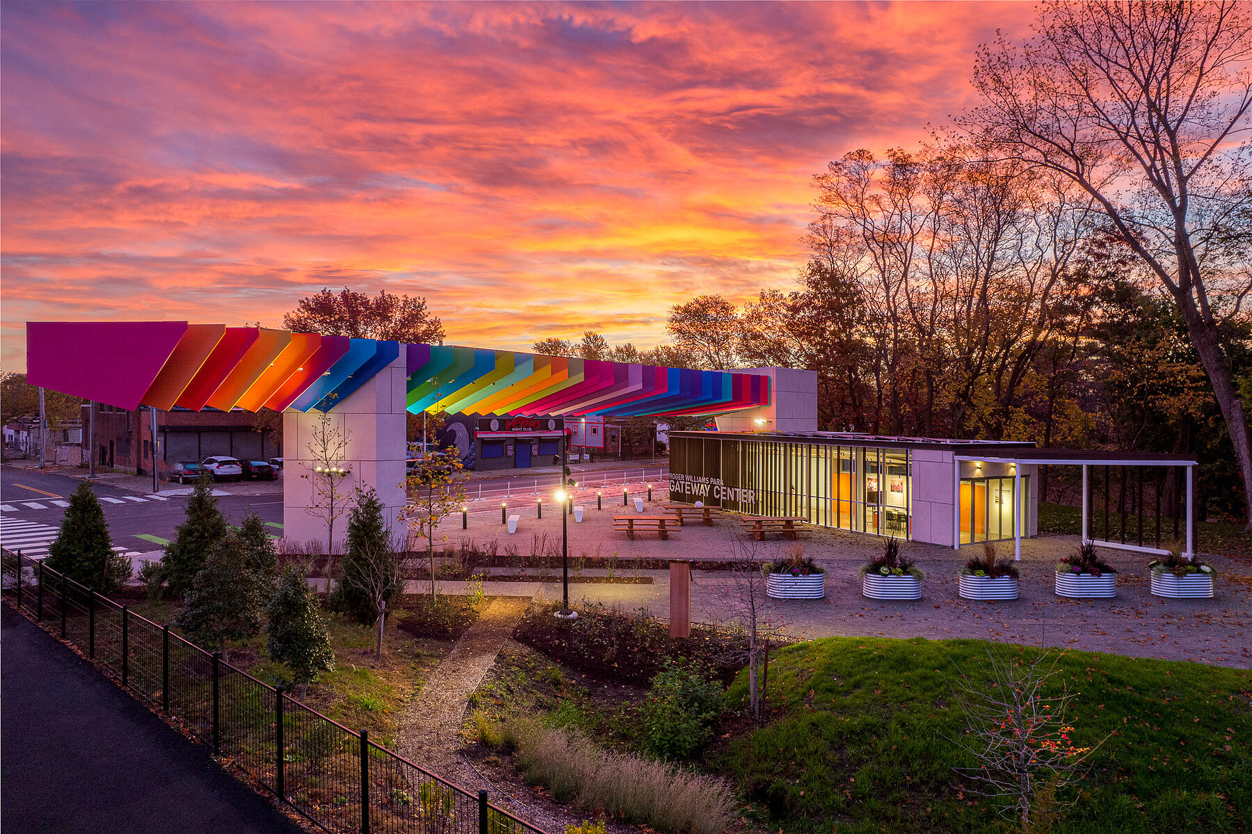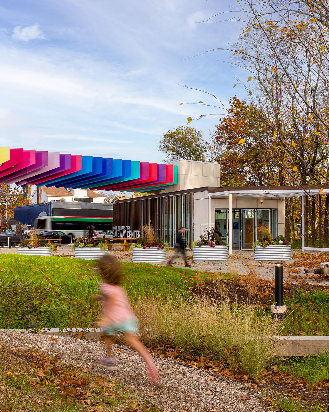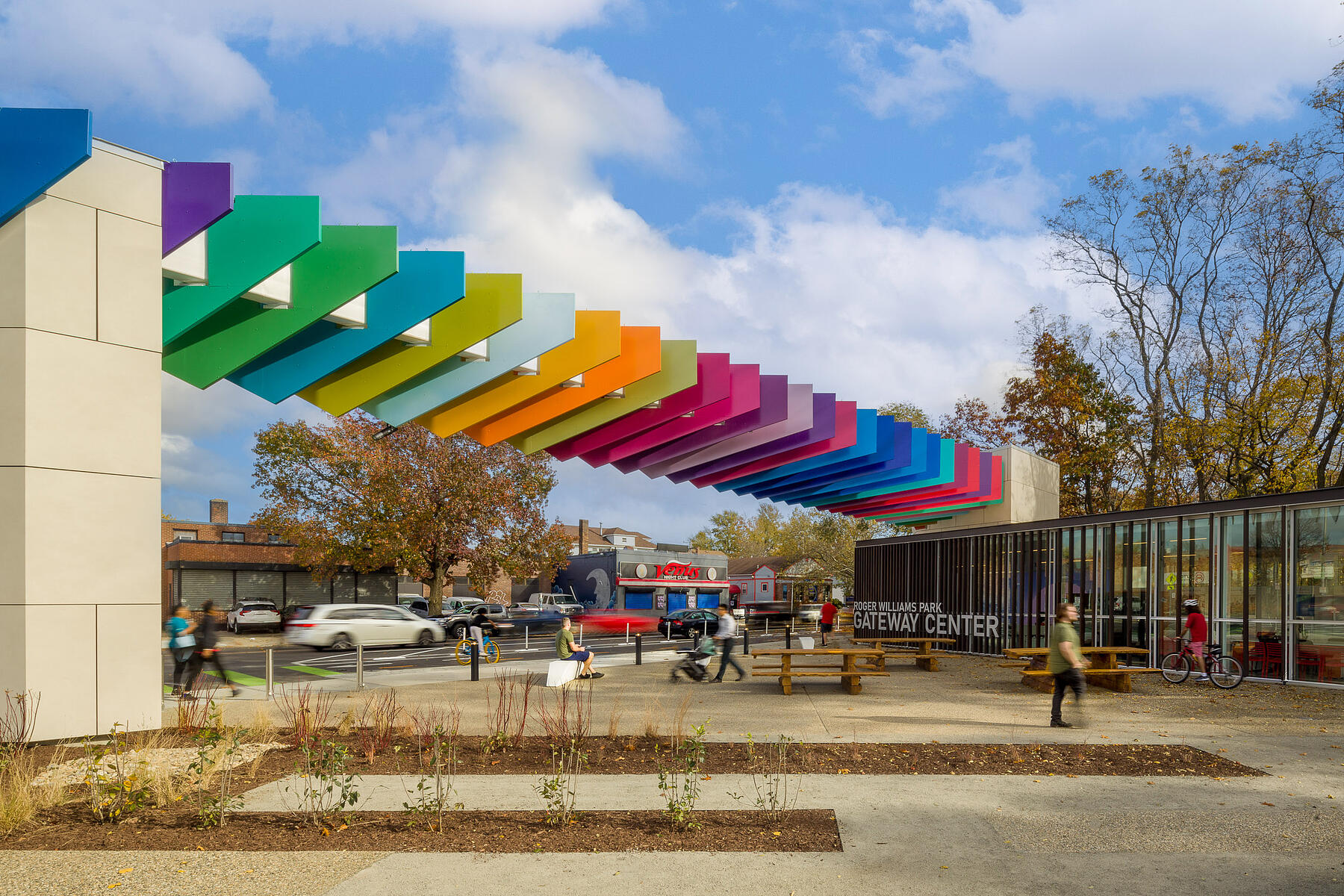 Working in collaboration with INFORM Studio, designers of the Roger Williams Park Gateway Center, we fabricated an entrance canopy of vibrantly colored aluminum fins that help welcome visitors and residents of the surrounding neighborhood to this valuable public space in Providence, RI.