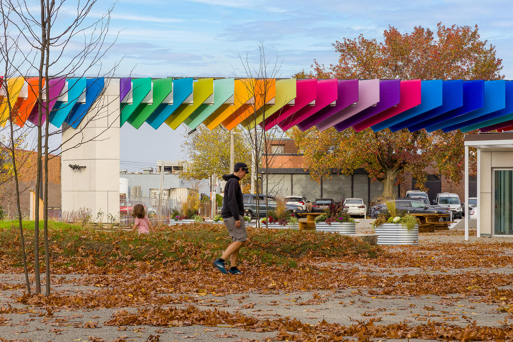 After being cut to form, the aluminum frames and fins were coated with a high grade exterior paint in 35 different colors, giving the fins a unique, eye-catching appearance that reflect the vibrancy of the local community and provide an attractive entrance to the park space beyond.