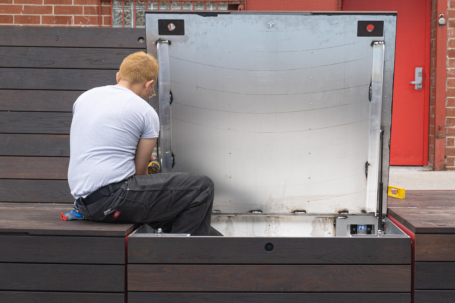Working closely with SITU Studio, our project management team optimized design performance to address the various needs of the project. Together, we decided to use locally sourced thermally modified oak as a sustainable, durable, and warm material for the cladding of the units. The wood slats are fastened to painted aluminum substructures which form the secure, weatherproof, and heavy duty mobile core of each typology.