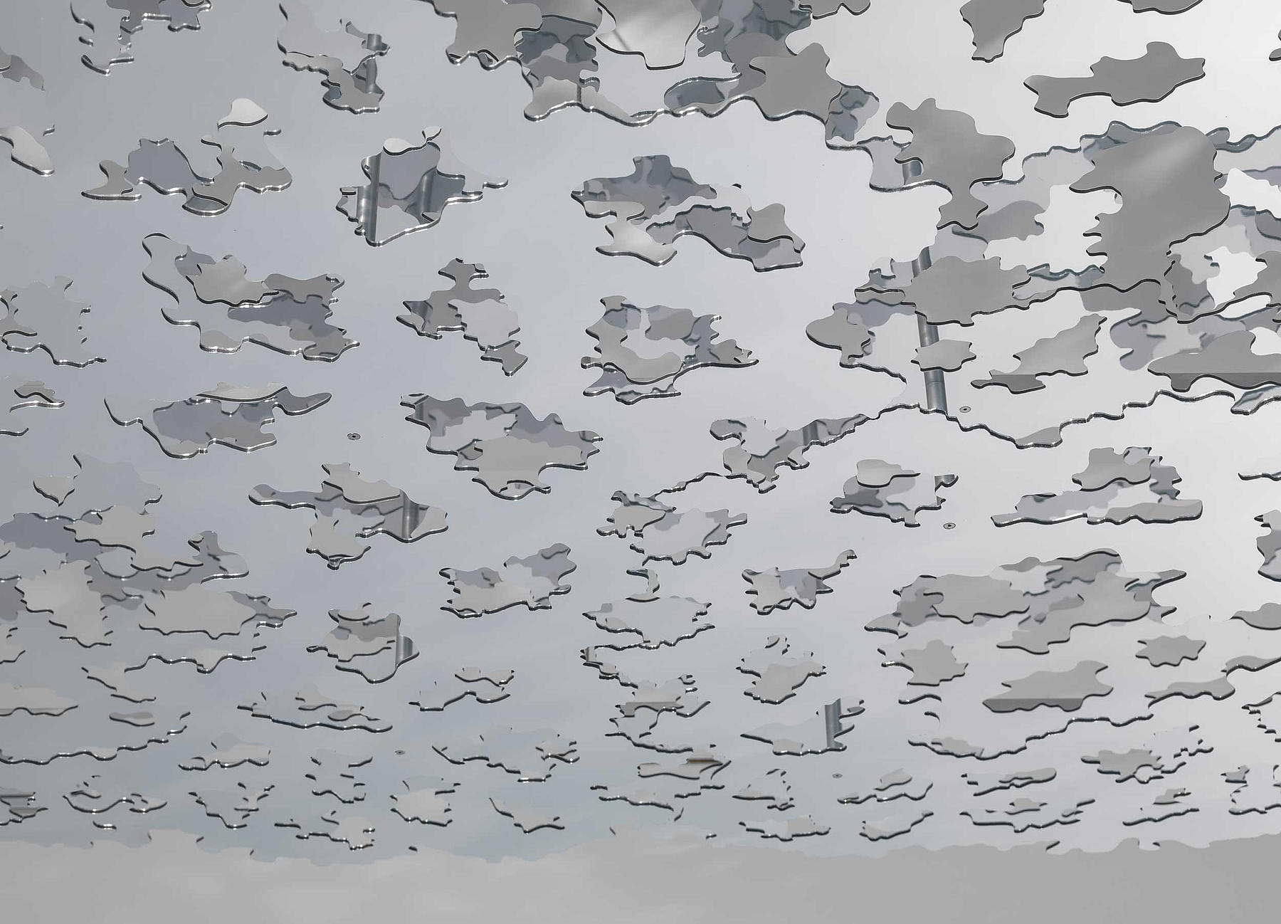 Measuring 14 ft by 10 ft, the artwork consists of two layers of CNC-perforated, mirror-finish aluminum composite, separated by 4 in standoffs and suspended from above by thin aircraft cables.