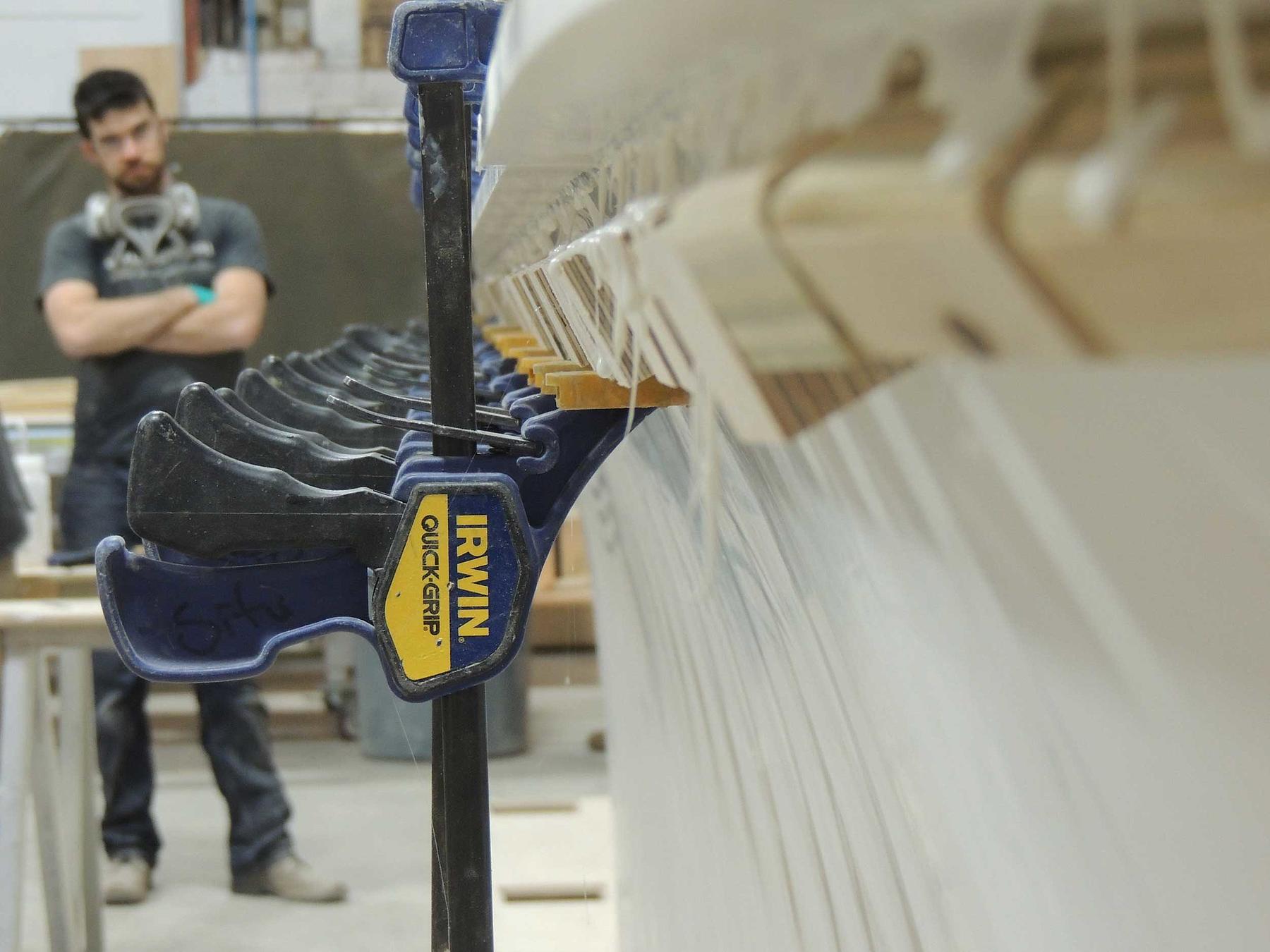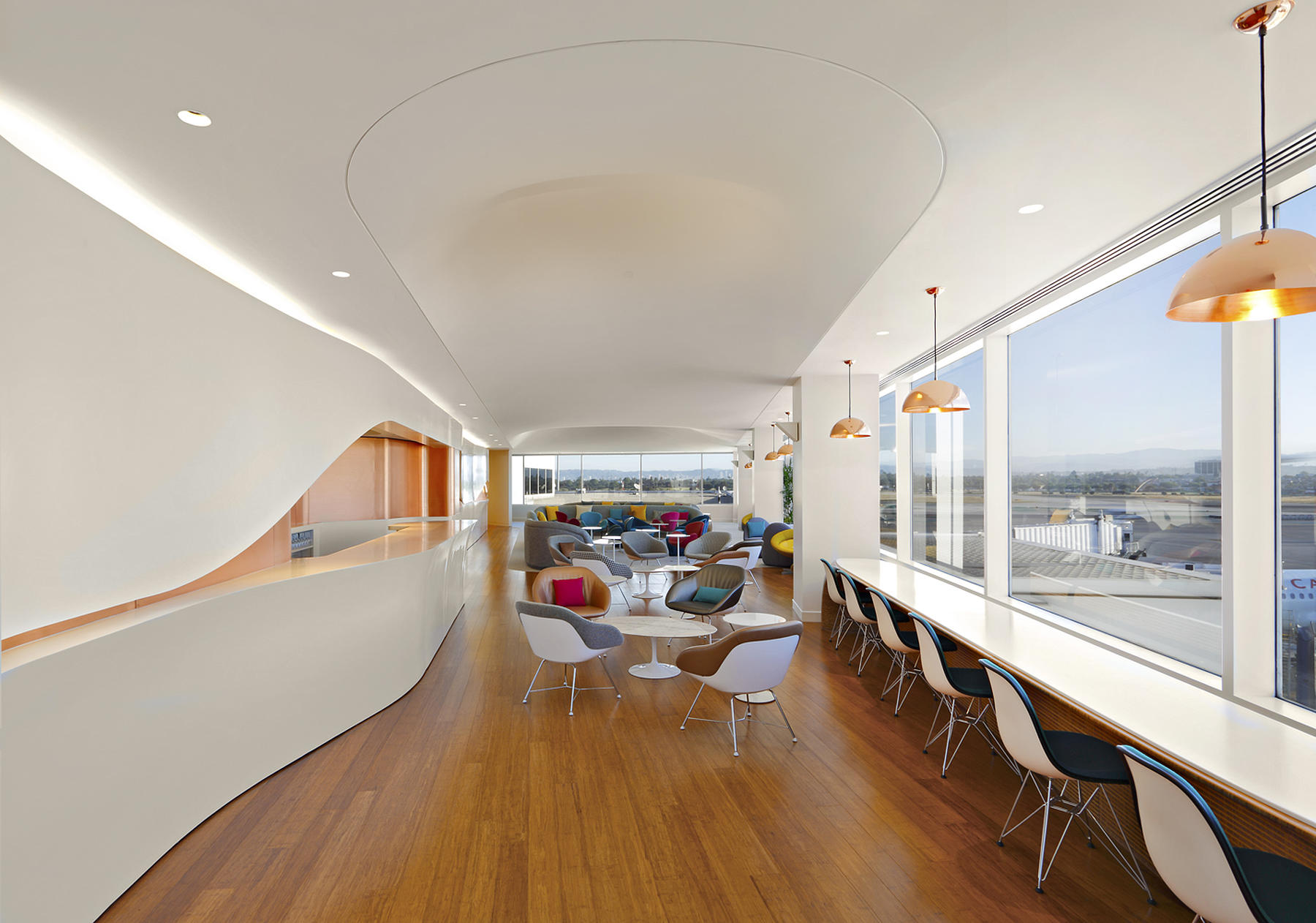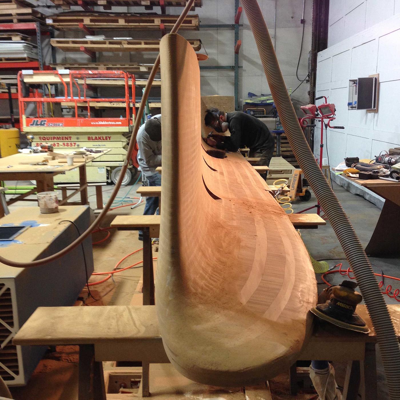 In addition to the thermoformed components, we also produced a range of architectural accents and furnishings for the space. Using rolled sheets of copper, we fabricated a warm and lustrous backsplash behind the bar, and—with some subtle millwork—a 24 ft long bamboo tabletop took on curves that echo California’s surfing culture. Working with upholstery and 3D modeling, we helped realize Slade’s design for custom sofas distributed throughout the lounge.