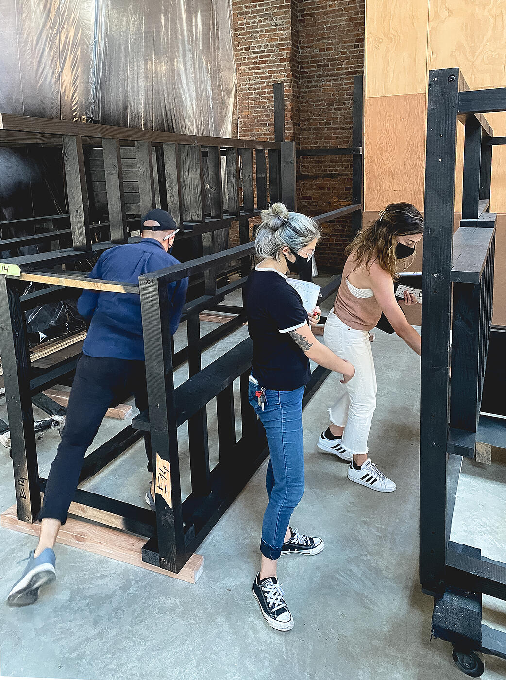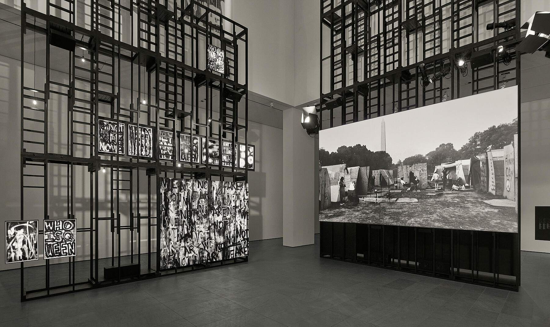 Working through an iterative design process with the project team, we fabricated three 60-foot tall lumber scaffold structures for Adam Pendleton’s exhibition, “Who Is Queen?”, at the Museum of Modern Art in New York City.