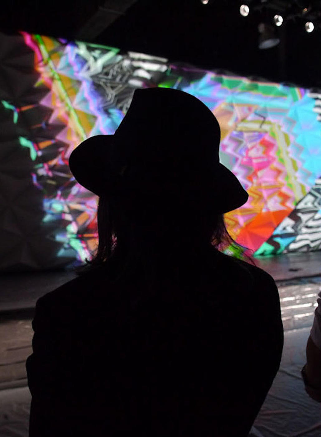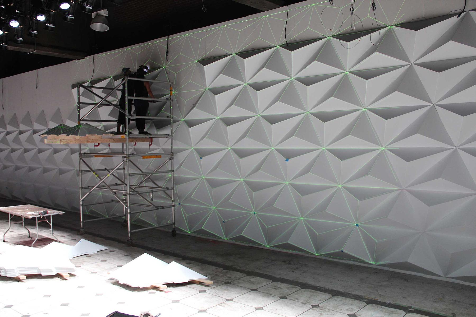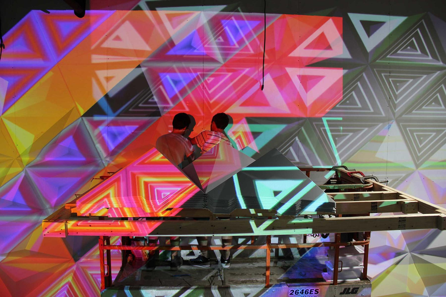 Using our CNC router, we cut and scored large sheets of lightweight foam board to create flat sets of three pyramids that could be quickly folded into their final three-dimensional forms. To expedite installation, interlocking tabs allowed each pyramid to be directly attached to simple plywood set walls. With the faceted backdrop in play, Harlan mapped digital projections onto the 3D geometry and brought the wall to life with shifting animations throughout the runway show and after party.
