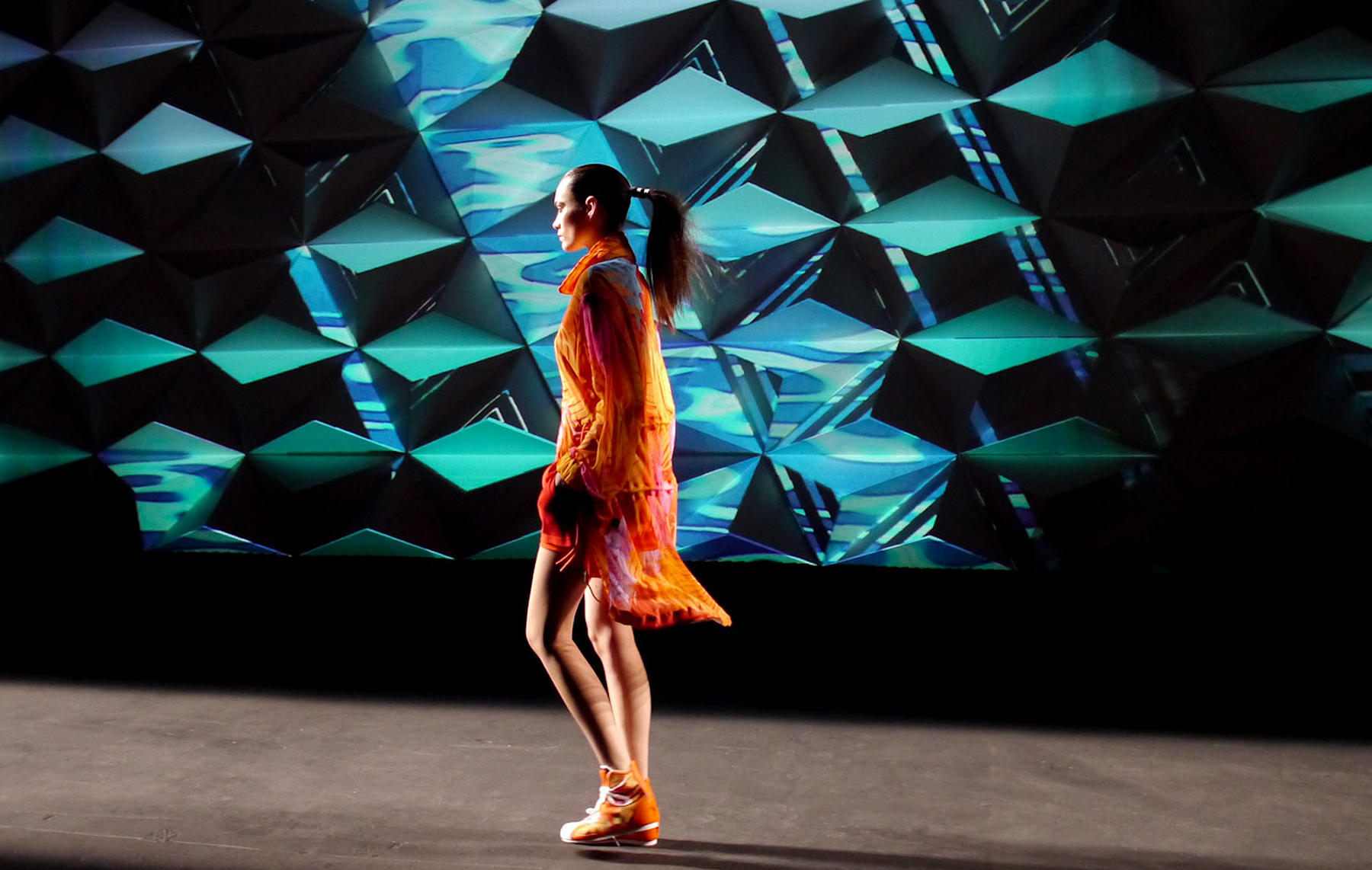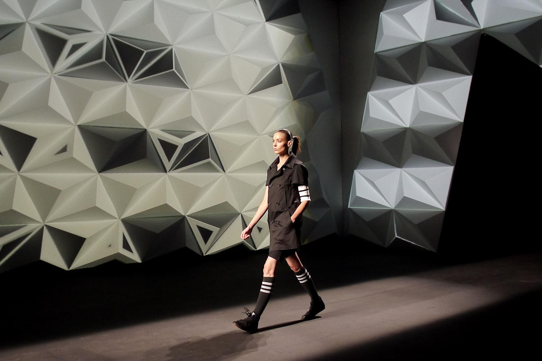 In celebration of Y-3’s 10th anniversary, visual artist Dev Harlan was commissioned to create a dynamic and interactive backdrop for their 2013 S/S fashion show. In our role as fabricators, we helped the artist produce a 3D projection wall, which was comprised of more than 600 linked pyramids.