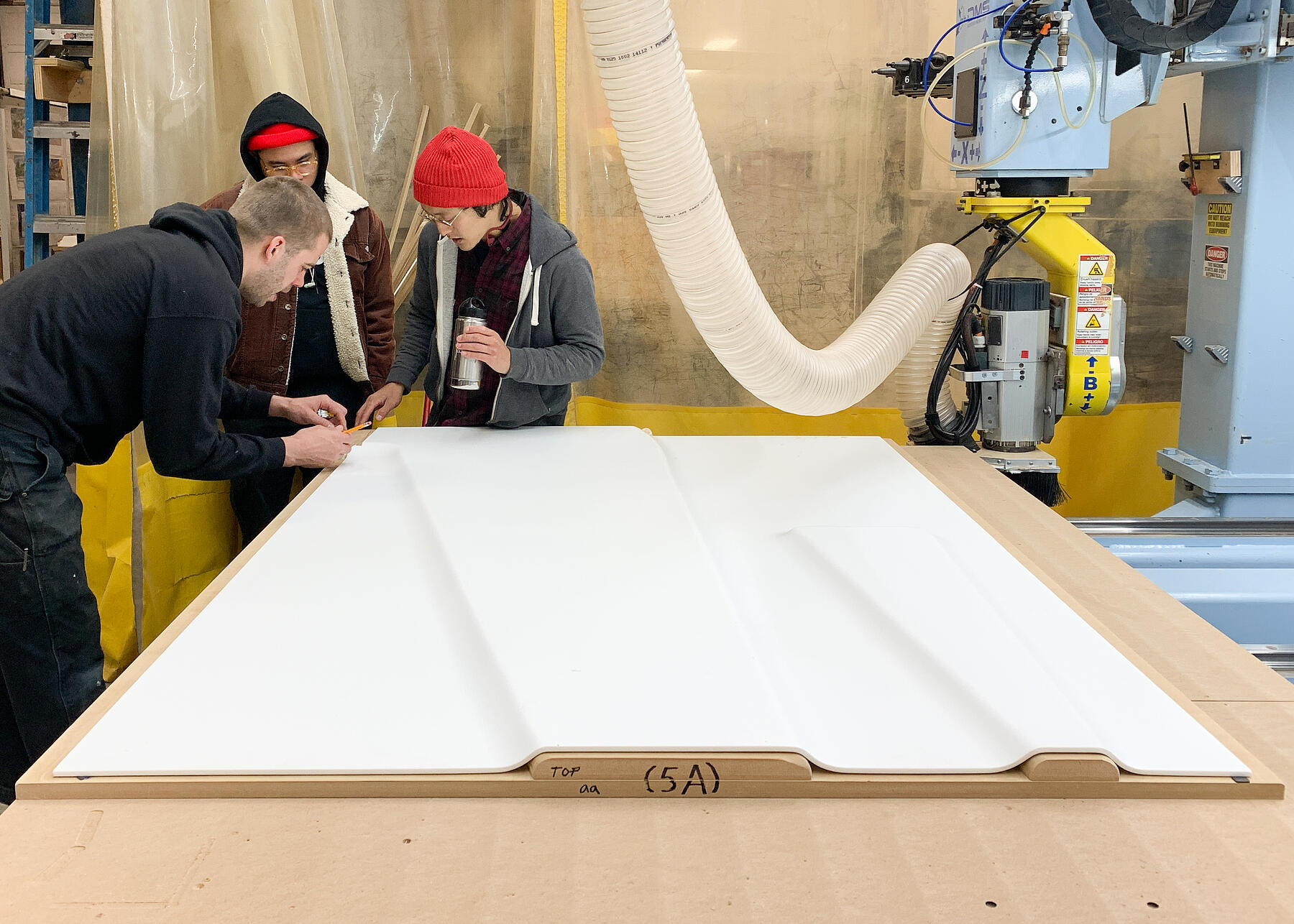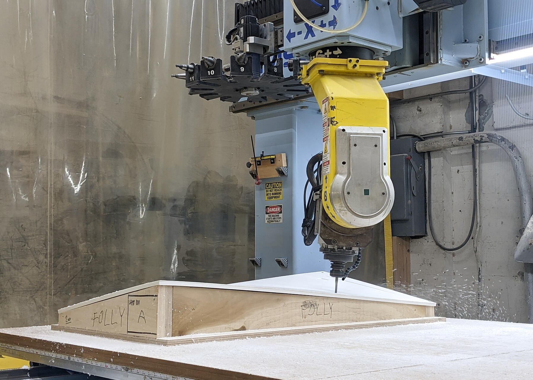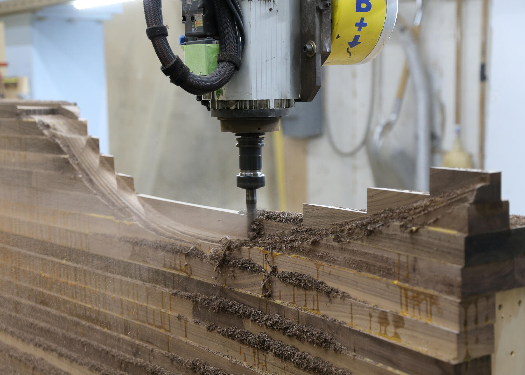 By pushing the boundaries of our 5-axis CNC router’s capabilities, we are able to streamline production and achieve intricate design solutions in a variety of materials ranging from wood, metal and solid surface. Our specialty teams are able to develop various geometries and details for fabrication by aligning digital tools with our expert fabrication resources.