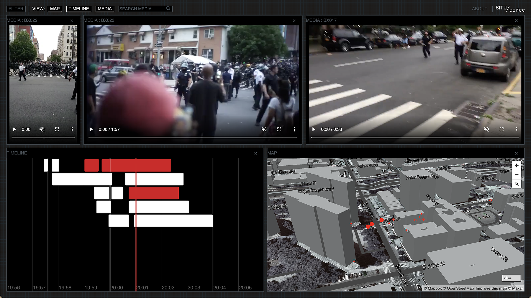 The user interface is split into a timeline, a map, and a media player. The timeline represents each chronolocated asset with a horizontal bar, similar to video editing software, and the map, which was supported by Mapbox, represents each geolocated asset with a marker. The user can explore the evidence, dig into a street corner, or examine the span of a few seconds and select relevant assets to review. Other features include the ability to filter the assets by binary tags and search them by alphanumeric code.