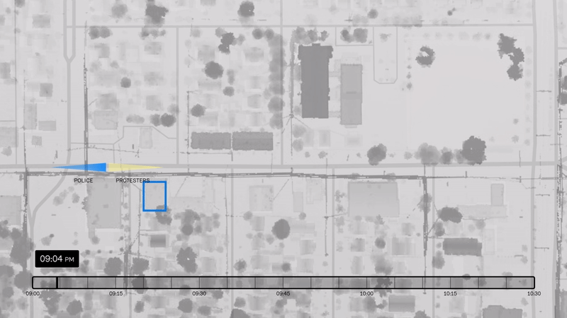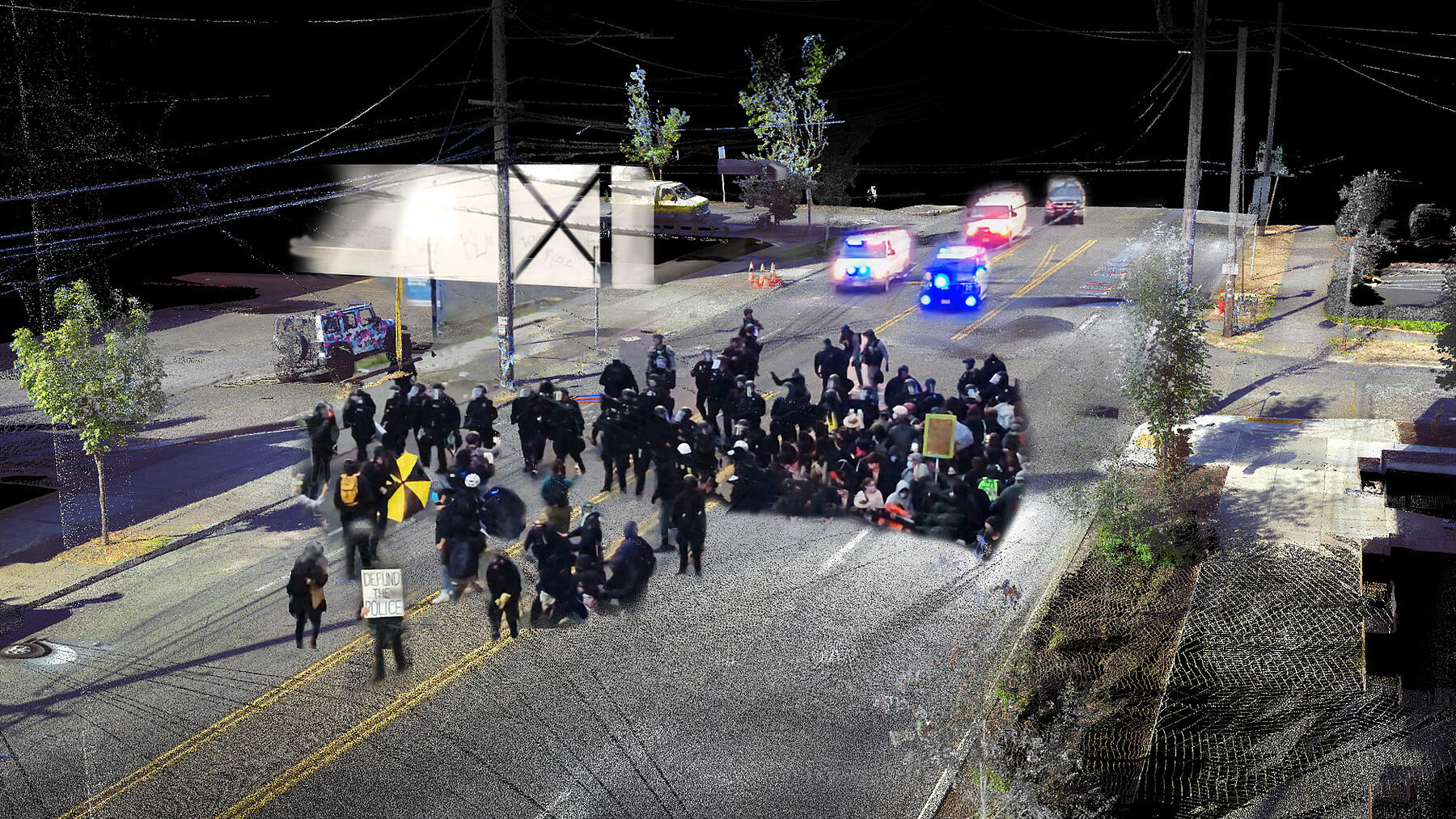 By reviewing footage of the protest and aligning visible landmarks in the videos with equivalent features in the model, we precisely located camera positions as well as individual protesters and police officers. By cross-referencing audio signatures between video assets, we reconstructed a global timeline of the night’s events. This process allowed us to study the incidents of police violence in a spatially and temporally accurate digital reconstruction.