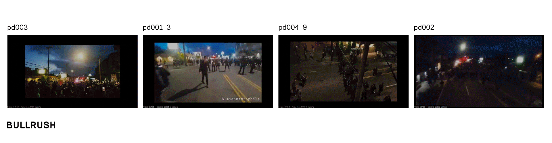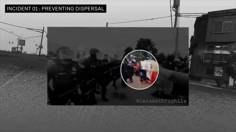 Having built a digital reconstruction of the event, our process then shifted to address specific legal requirements of the court proceedings. Of the numerous instances of violence perpetrated by police officers that evening, Don’t Shoot Portland’s legal argument focused on nine individual uses of force clearly captured in the evidentiary assets. Each use of force is legally defined as a single action perpetrated by police against an individual, such as the firing of a single round of pepperball munition from a FN303 rifle, or a single strike with a baton.