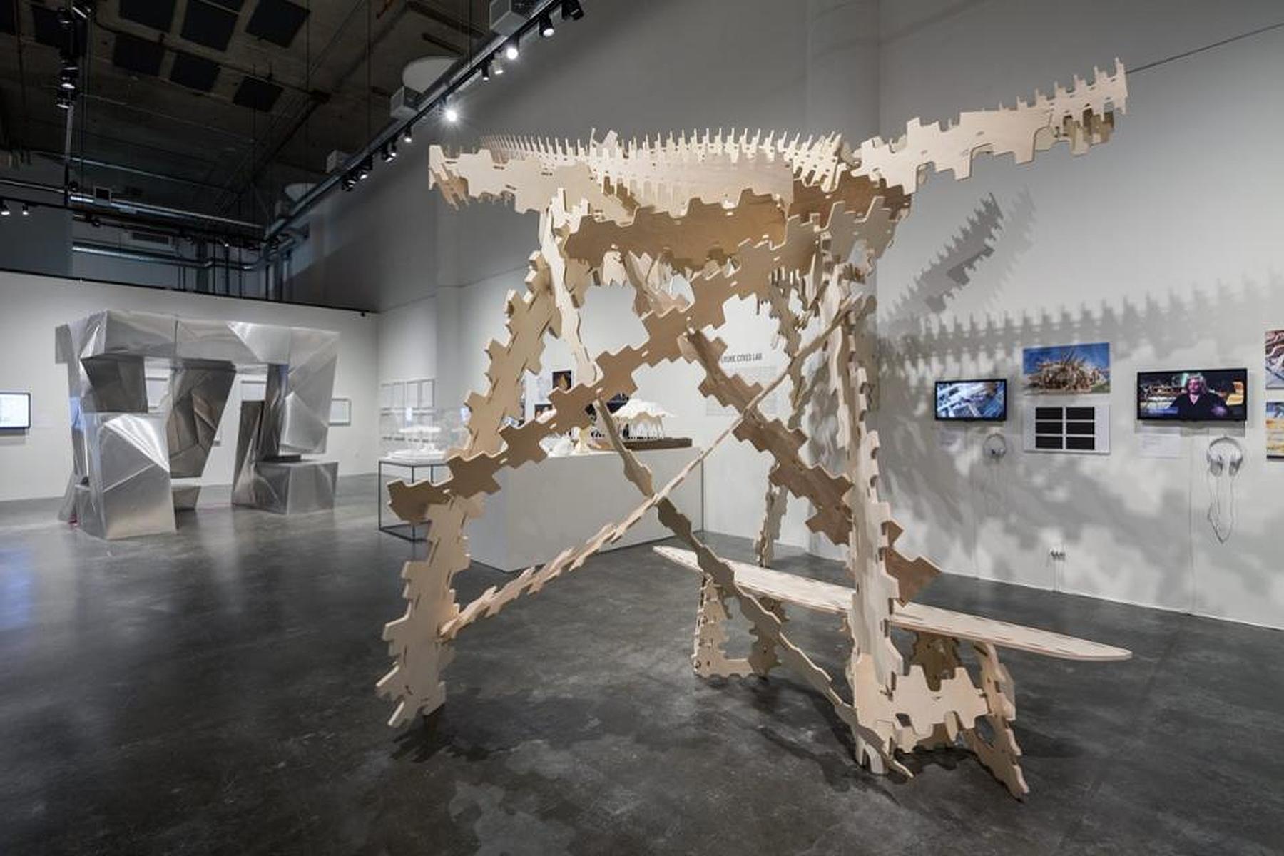 "The exhibit includes pavilions and related artifacts from eight architecture studios...Brooklyn's SITU addresses the challenge of making architecture adaptable to changing requirements, showing a system of interlocking plywood struts that are mutually reinforcing in myriad configurations such that users can spontaneously shape entire buildings to suit their needs."