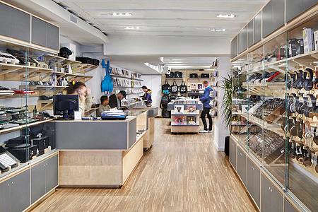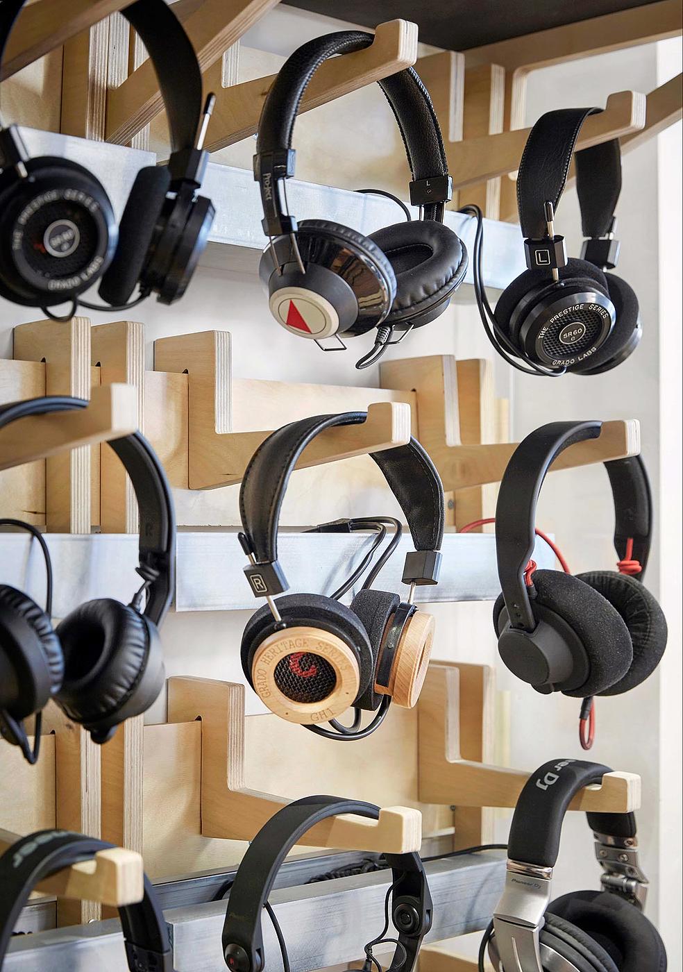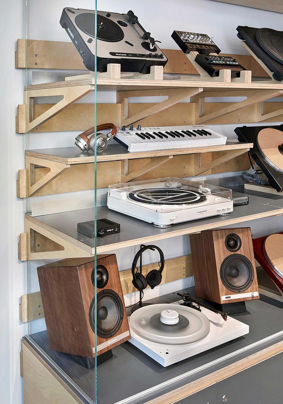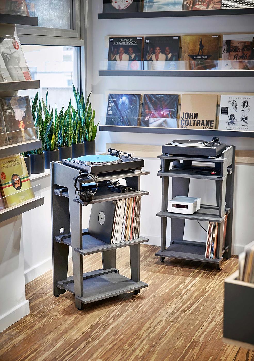 Upon entering the store, visitors find an impressive inventory of audio equipment, from a glass-fronted showcase of turntables to a cross-section of headphones and speakers to other high-performance audio accessories. Moving to the back-of-house, record shelves and browsing bins create the comfortable feel of a record shop, with records, bags, t-shirts and hats on display.