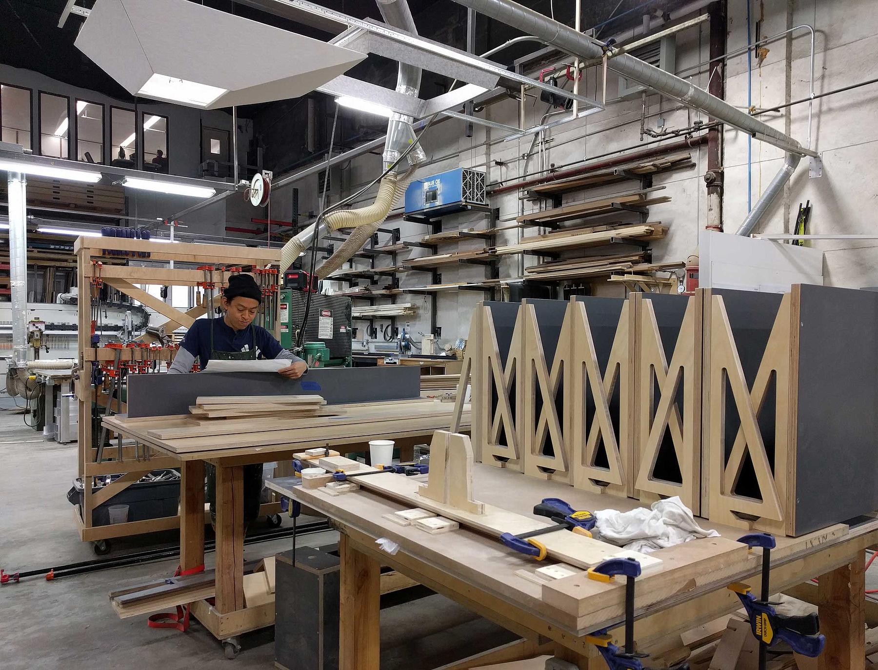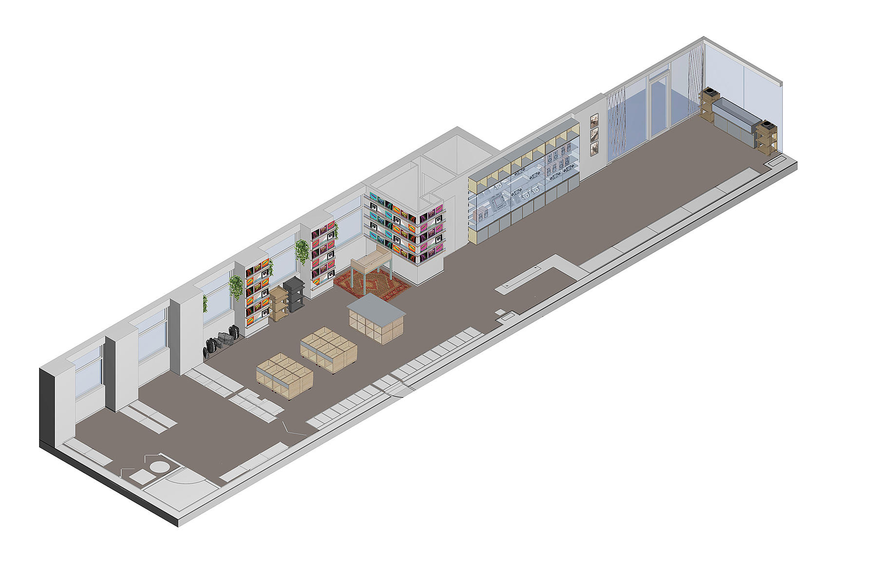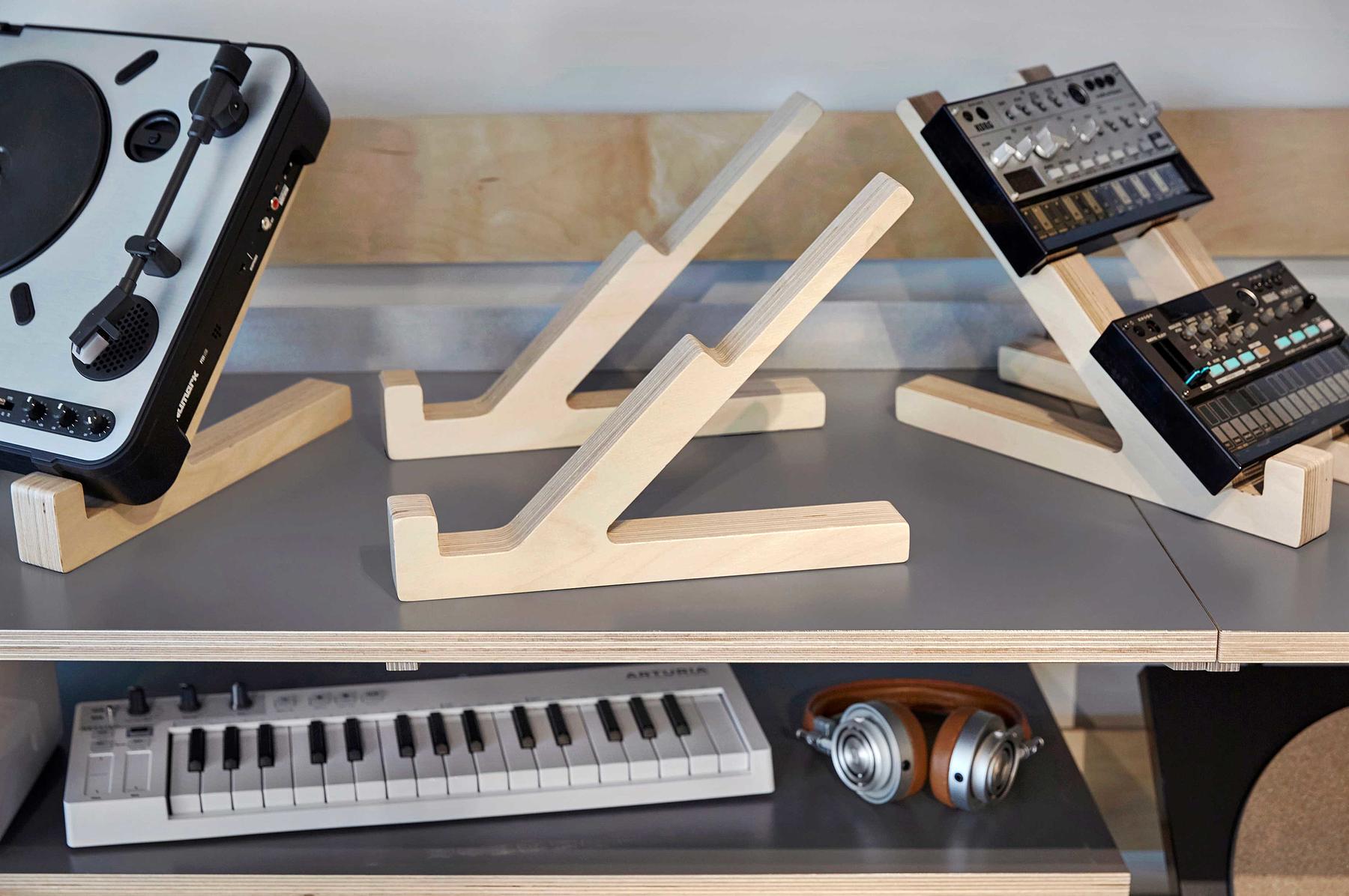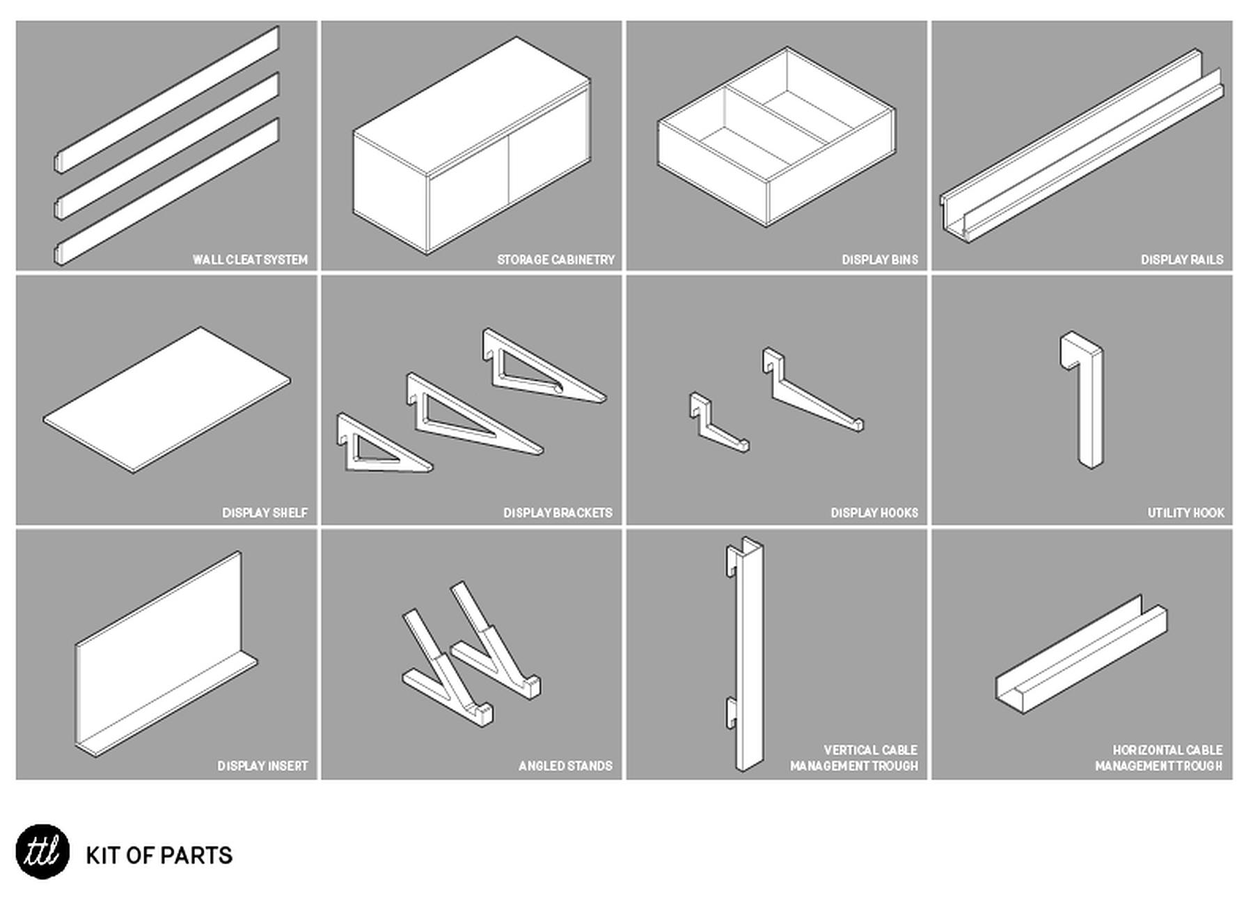 We worked closely with Turntable Lab to develop a universal cleat system with a family of interchangeable shelves, hooks and display rails to suit the requirements of existing and future merchandise. This allows the store manager to quickly rearrange displays and feature new items as they come in. Mobile tables and a mobile display wall at the back of the store allow the floor to be opened up for DJ performances and record release parties. Throughout the store, a simple yet refined palette of cool grey, natural wood tones and finely detailed plywood edges allows the merchandise to stand out from the details of the high-tech audio equipment to the colorful covers of the vinyl records.